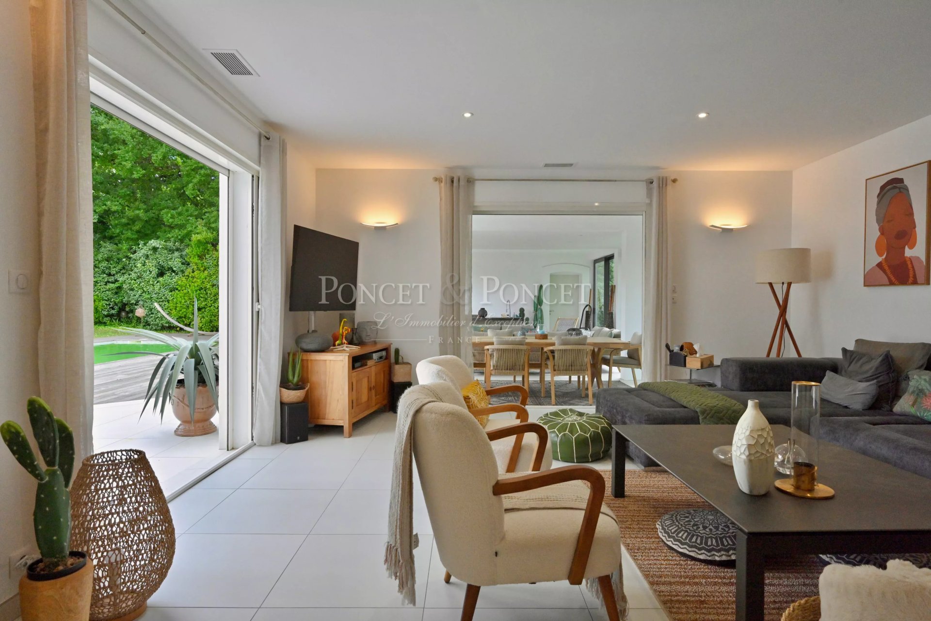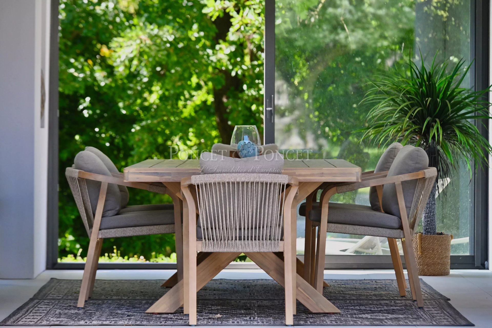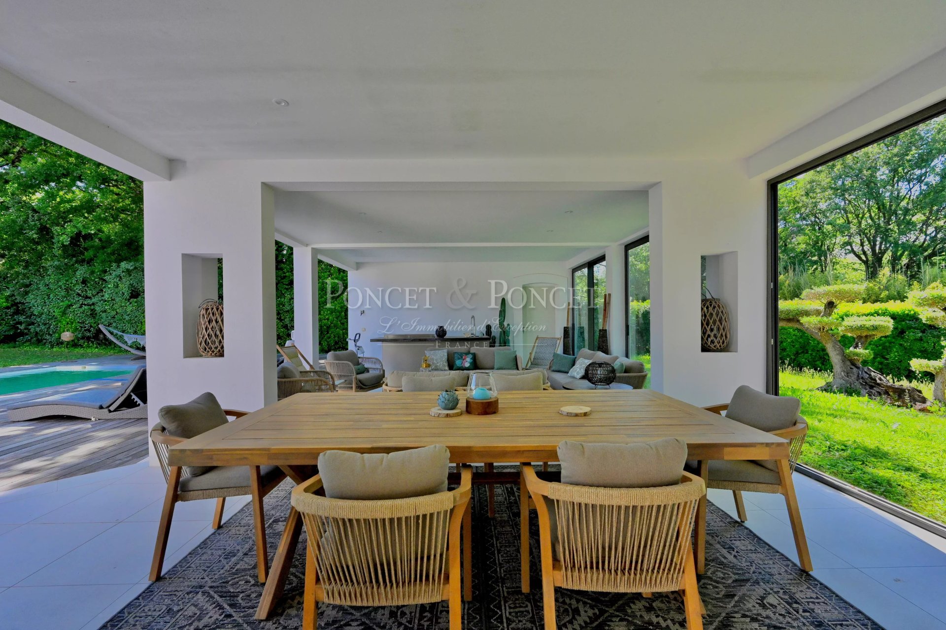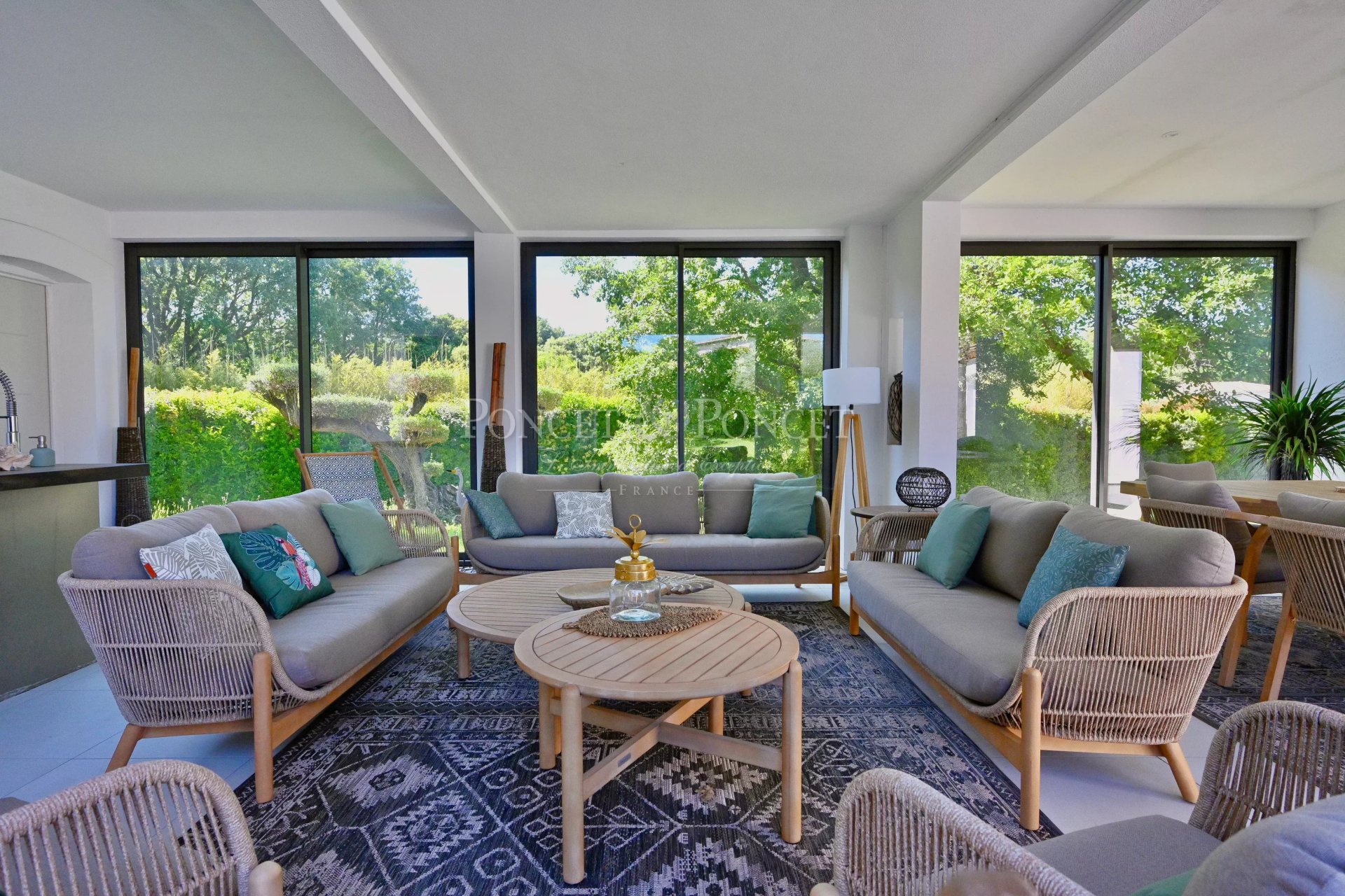 Dans le prolongement du salon, un élégant pool-house de 50 m² accueille un salon, une salle à manger et une cuisine d'été. le tout a proximité de la piscine chauffée par pompe à chaleur.