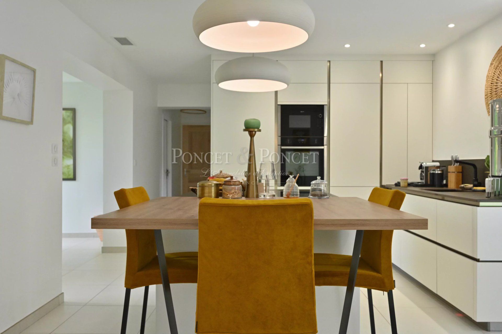 Au rez-de-chaussée, l'espace de vie principal s'articule autour d'une cuisine moderne ouverte sur le salon, ainsi que d'une salle à manger indépendante offrant une vue dégagée sur le jardin.