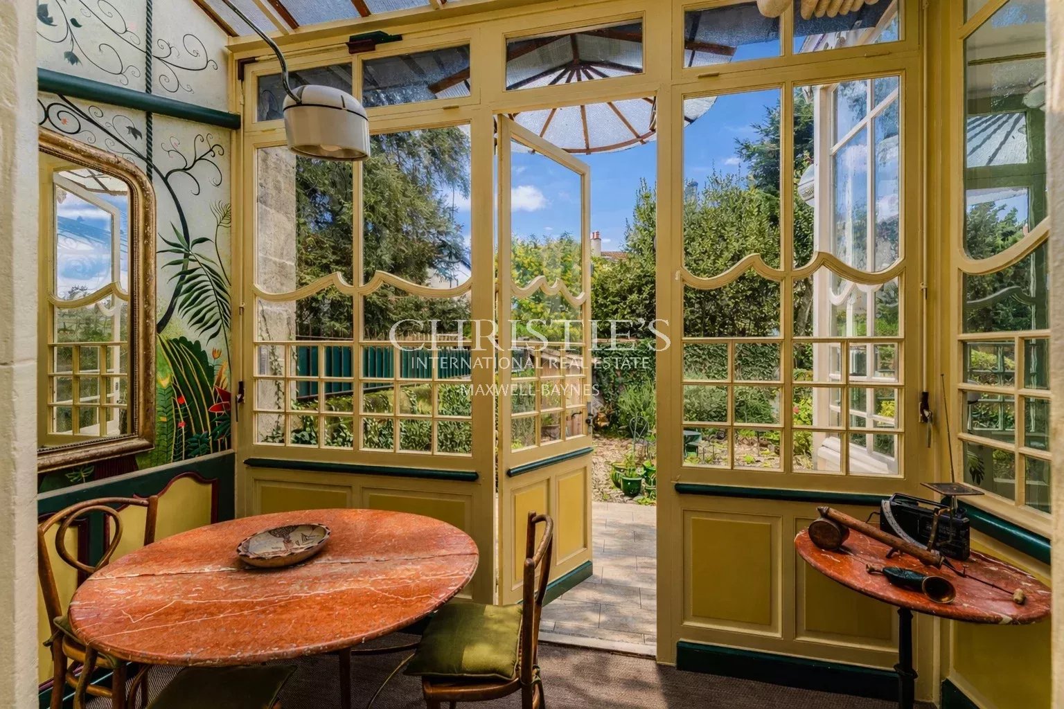 The separate kitchen, also facing the garden, includes a casual dining area.