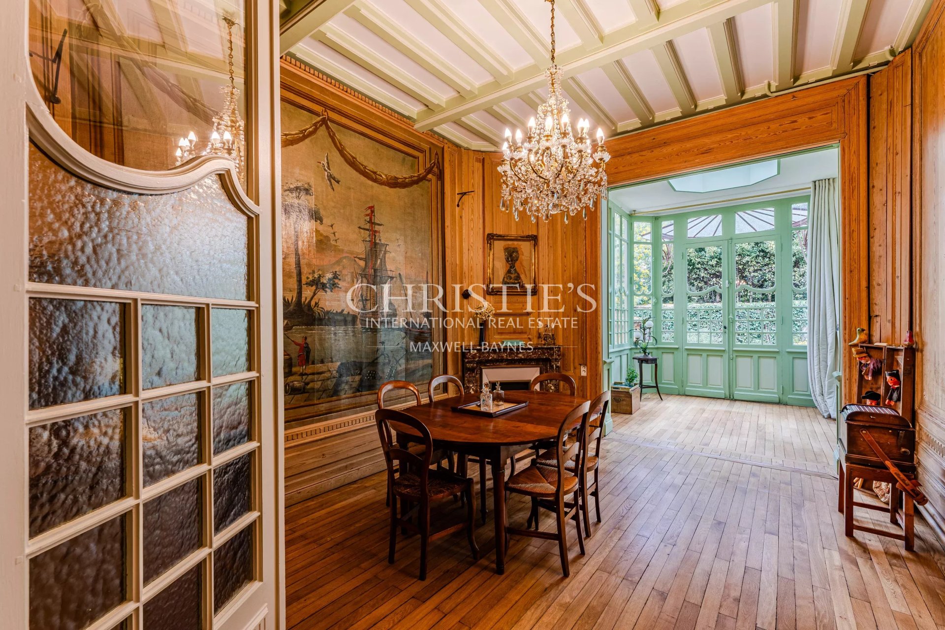 On the ground floor, a spacious entrance hall leads to a living room with a fireplace, followed by an elegantly decorated dining room opening onto a bright bow window overlooking the garden.