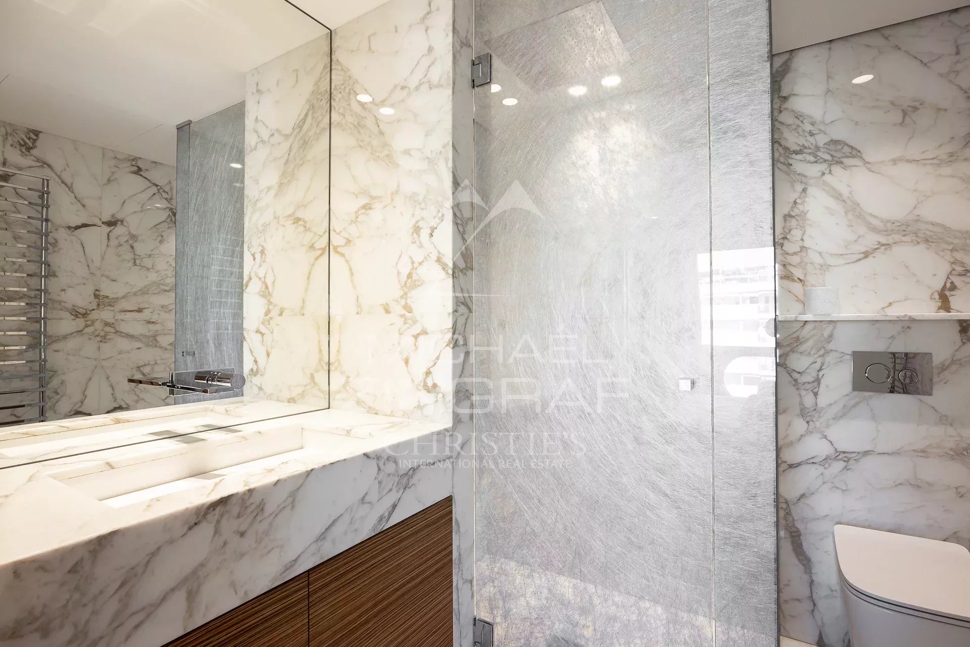 The apartment is composed as follows: an entrance, a large living room with fully equipped kitchen, a bedroom with shower room and toilet, and a master bedroom with dressing room and bathroom.