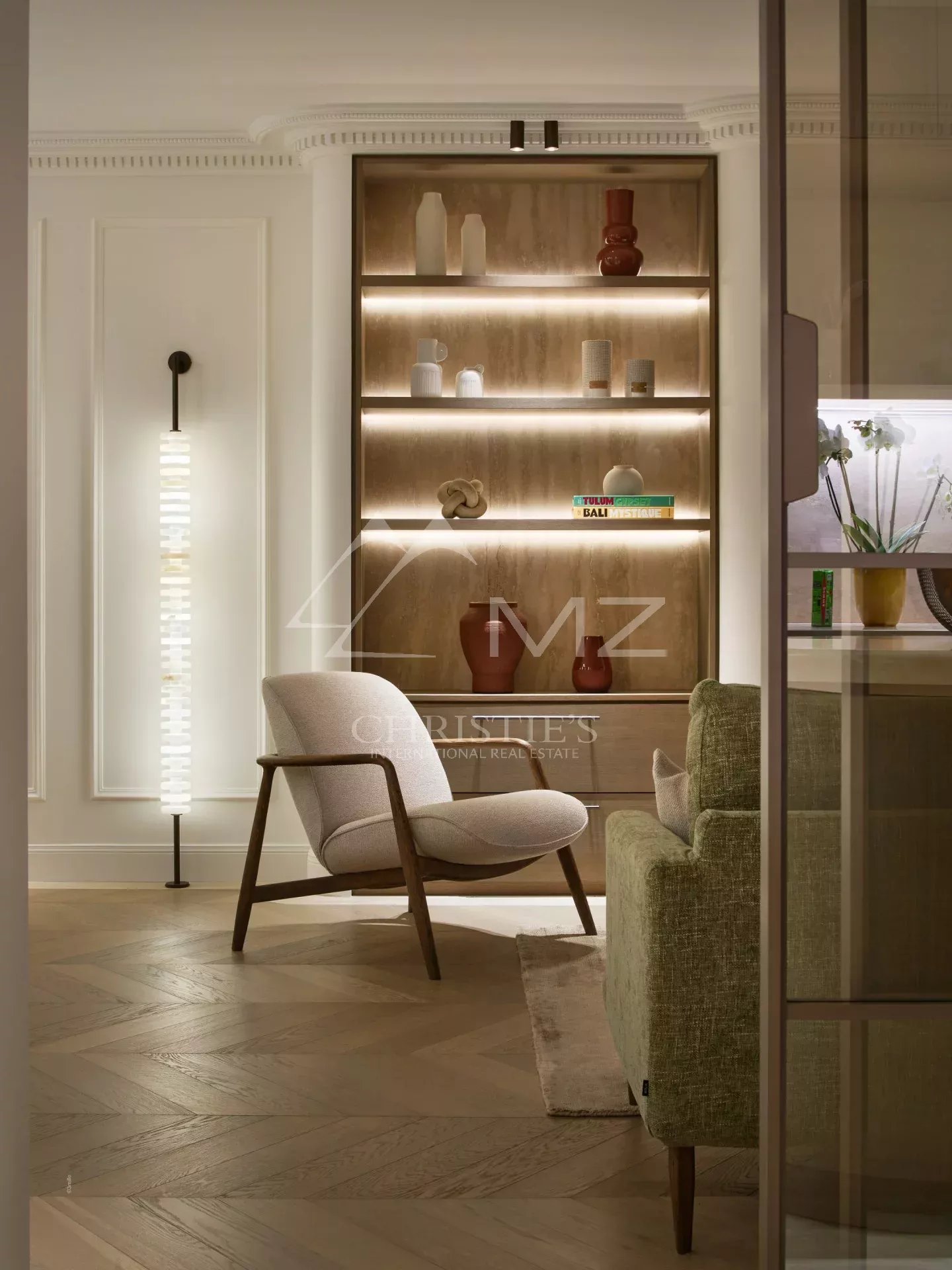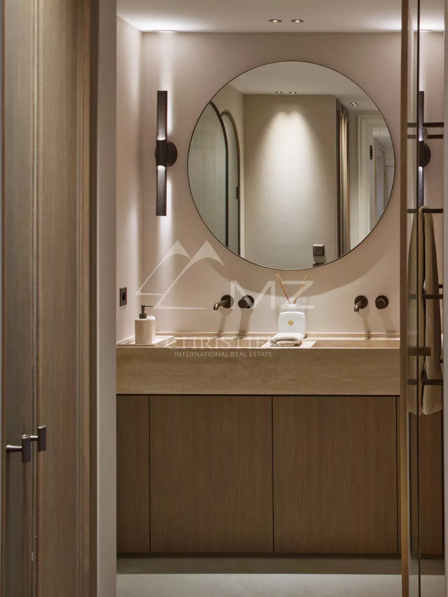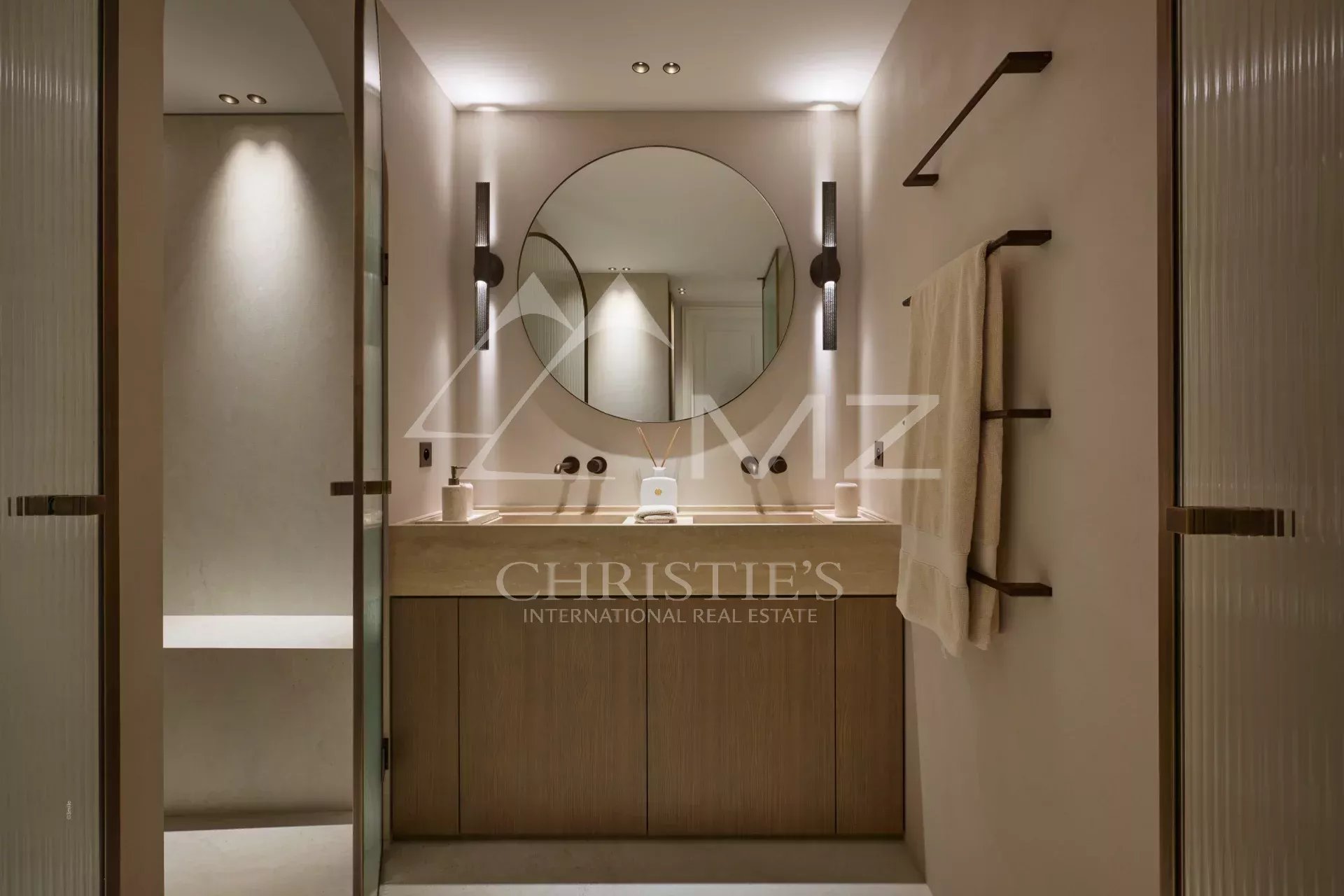 The apartment, in excellent condition, stands out for its very high-quality features. It consists of a spacious living room that opens onto an exotic wood terrace, offering a panoramic view of the sea. The kitchen, separated by a glass partition, is at the cutting edge of modernity, with a central island and a perfectly equipped utility room.
