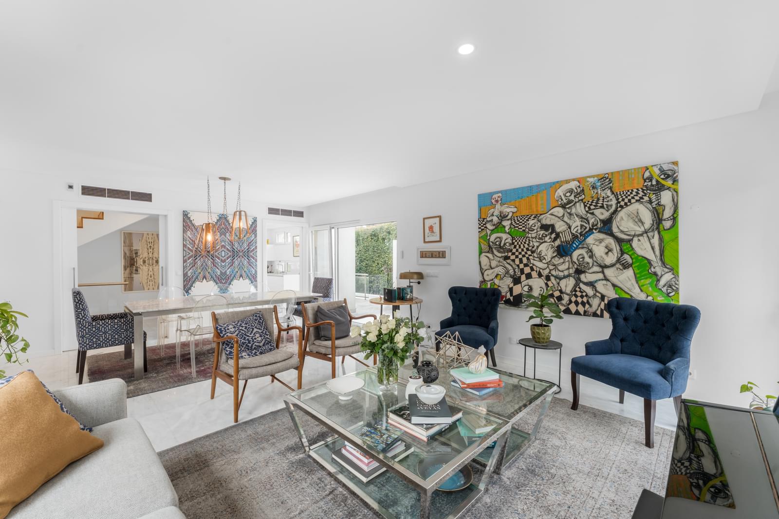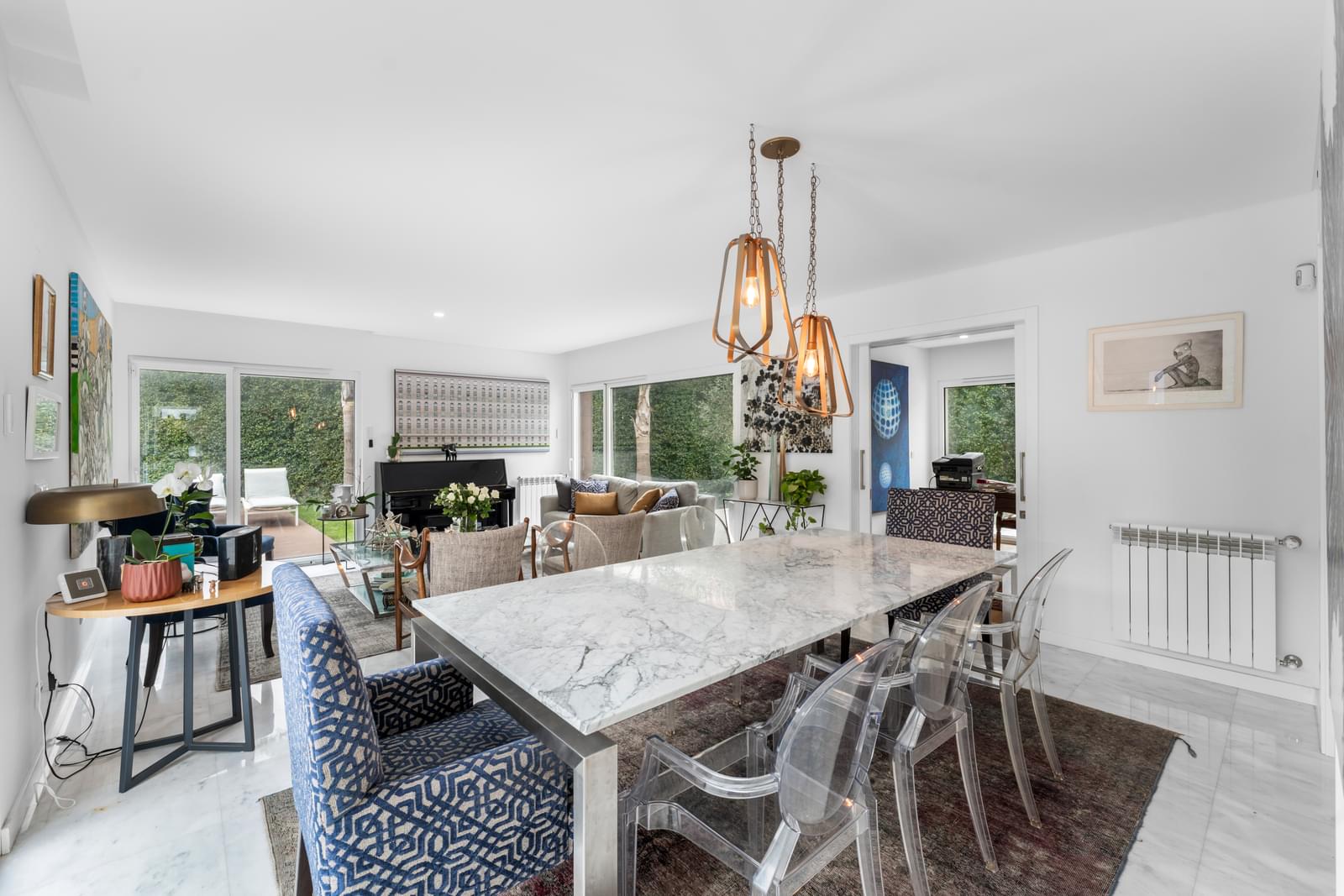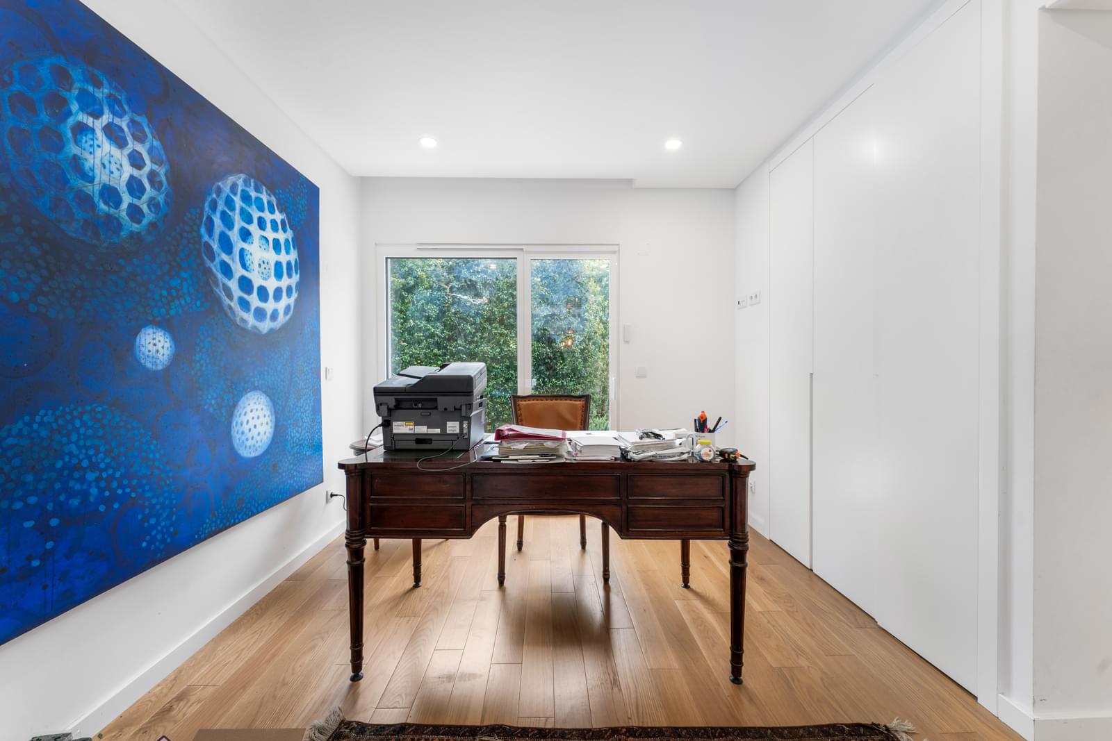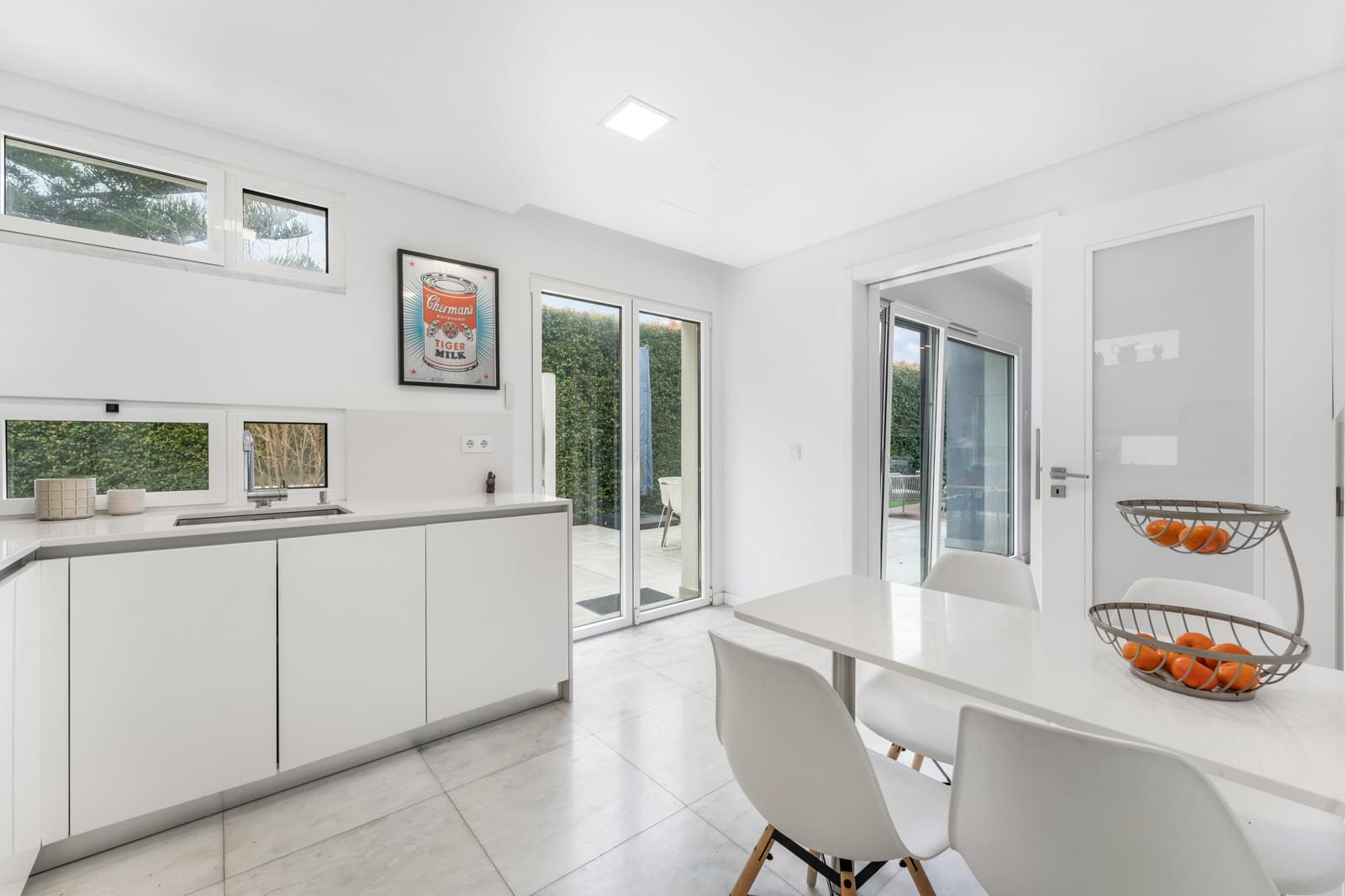 The ground floor features a spacious open-plan living and dining area with large glass doors opening directly to the garden and swimming pool. The fully equipped kitchen, with premium appliances, combines functionality and refined design. This floor also includes a guest toilet and a versatile room that can serve as an office or guest bedroom, with direct access to the exterior.