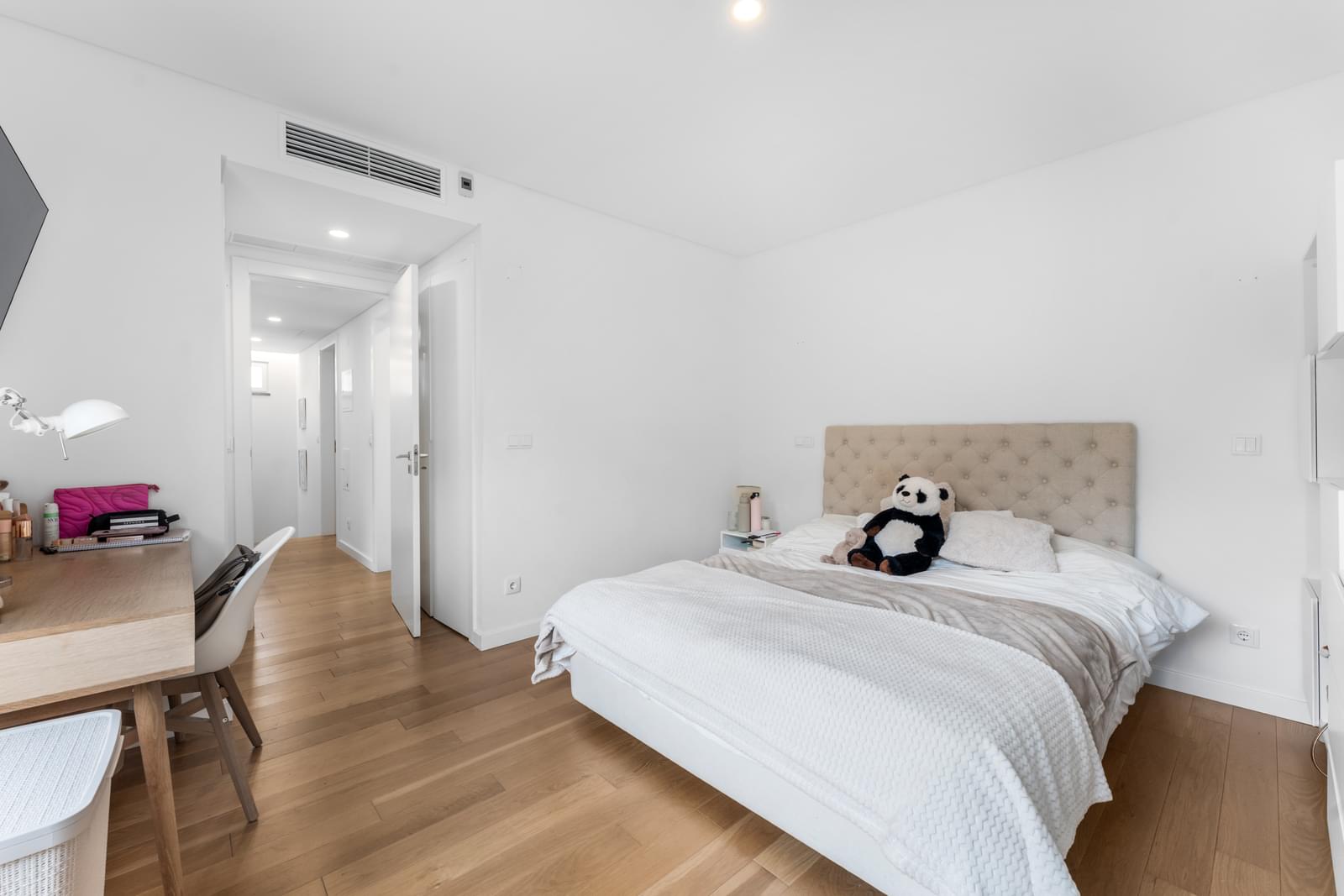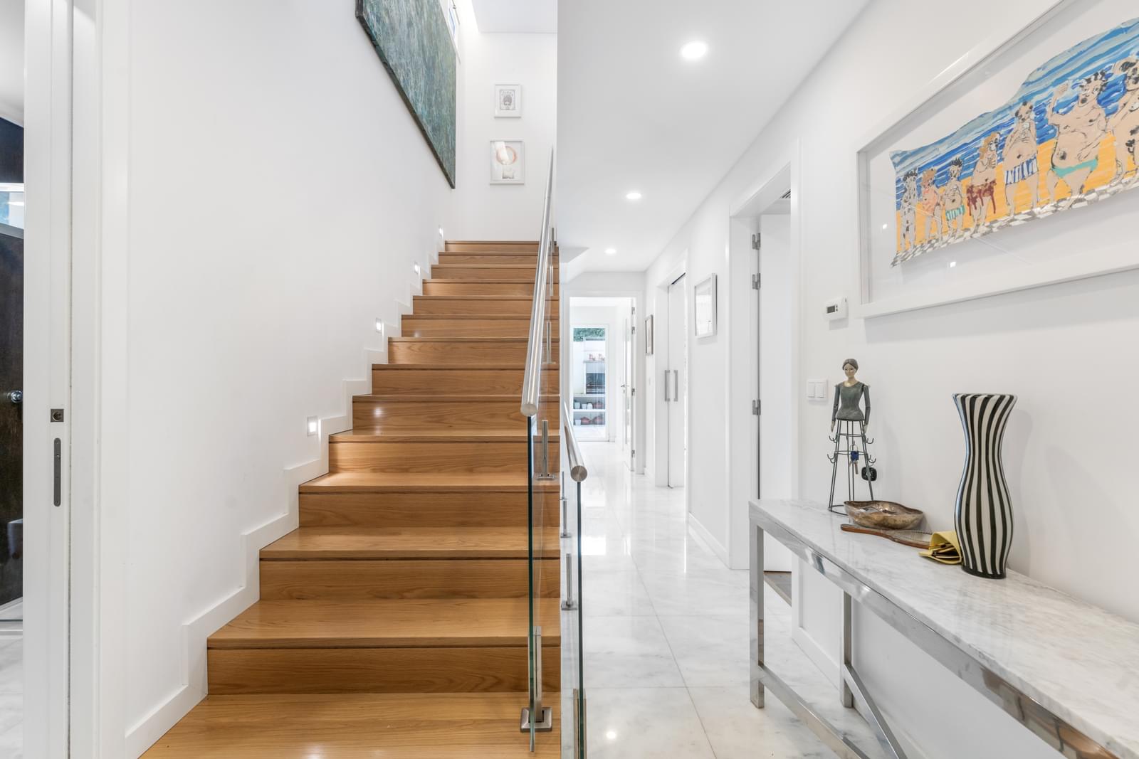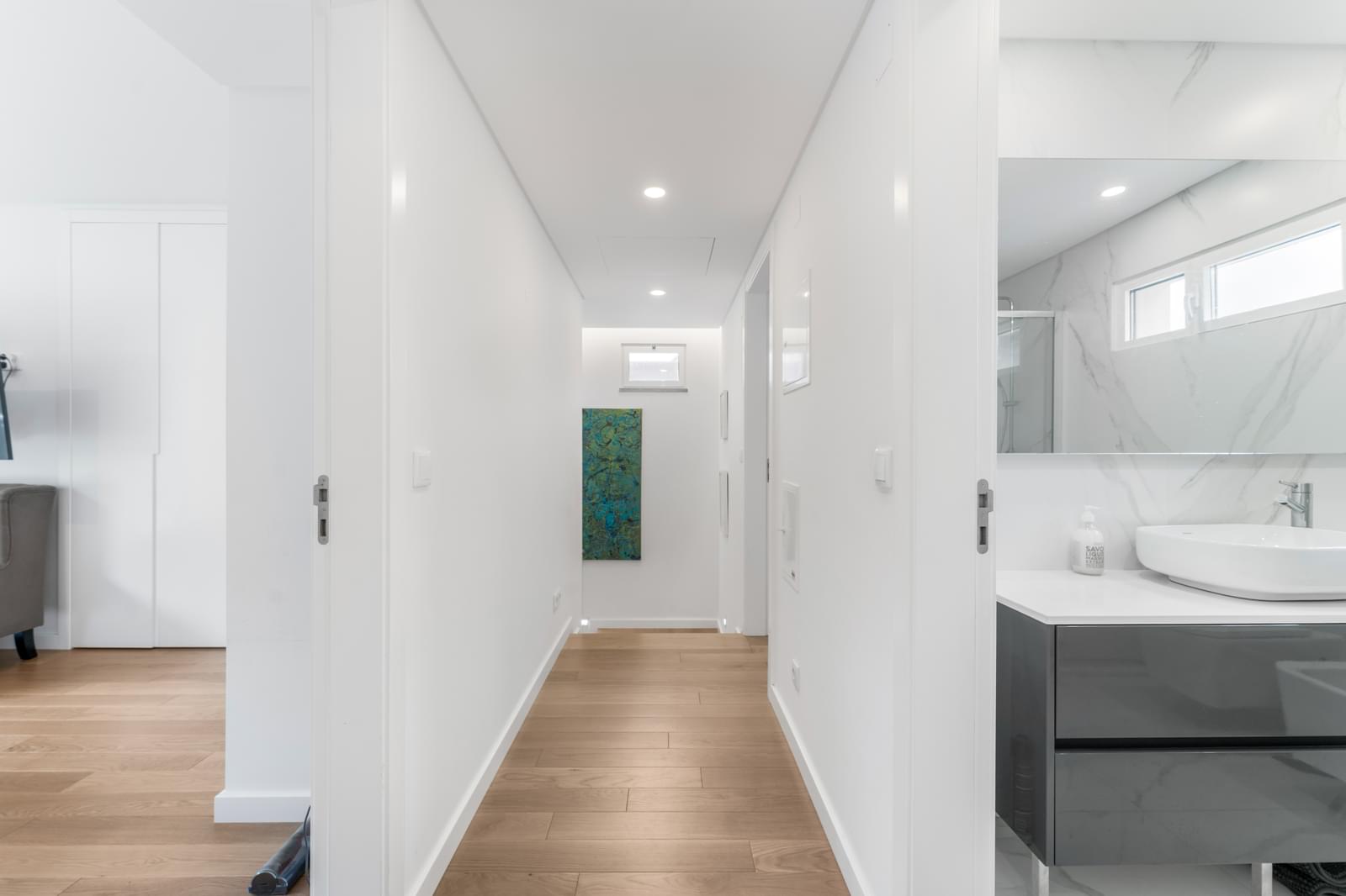 The first floor comprises three bedrooms, including a master suite with a complete bathroom and private balcony. The other two bedrooms share a modern bathroom with a walk-in shower. All rooms enjoy independent balconies and excellent sun exposure.