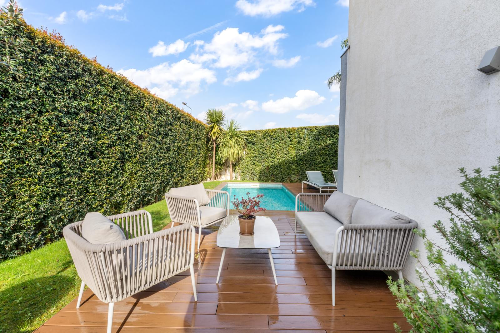 The outdoor area is designed for relaxation and entertainment, featuring a private pool, wooden deck and lounge area, ensuring total comfort and privacy.