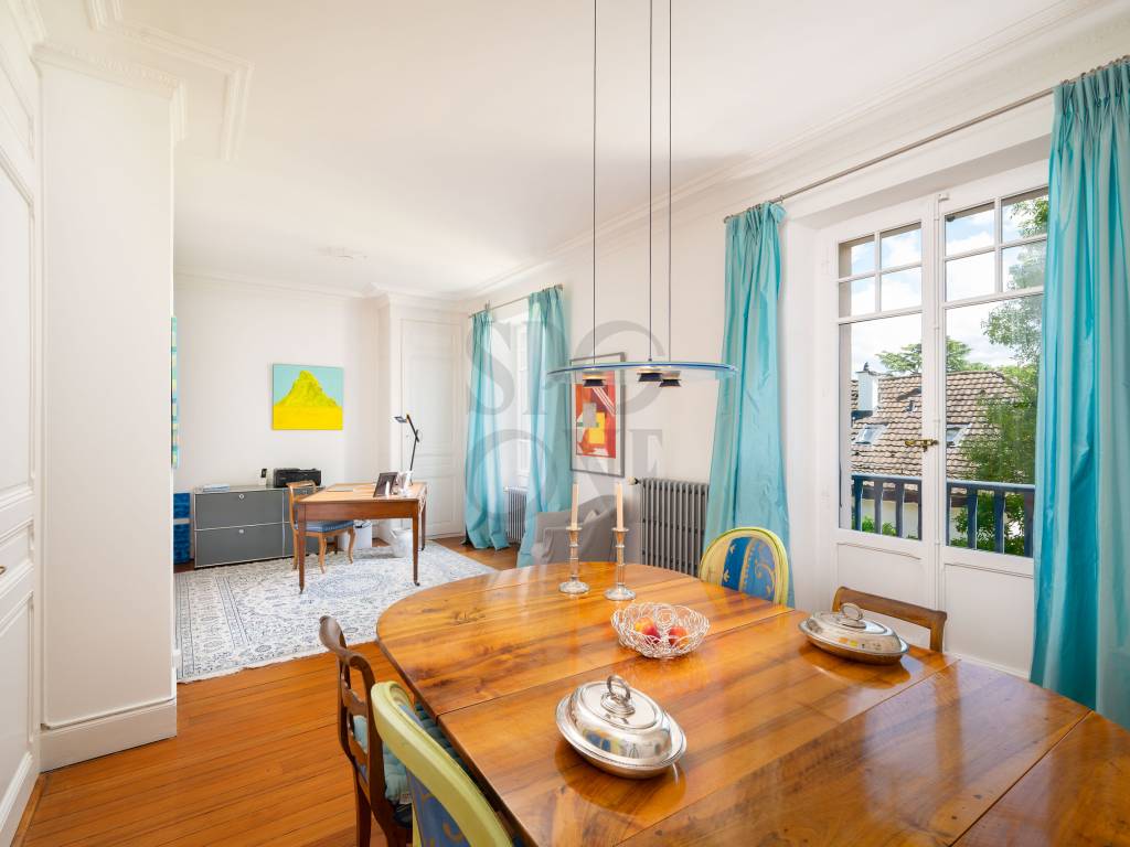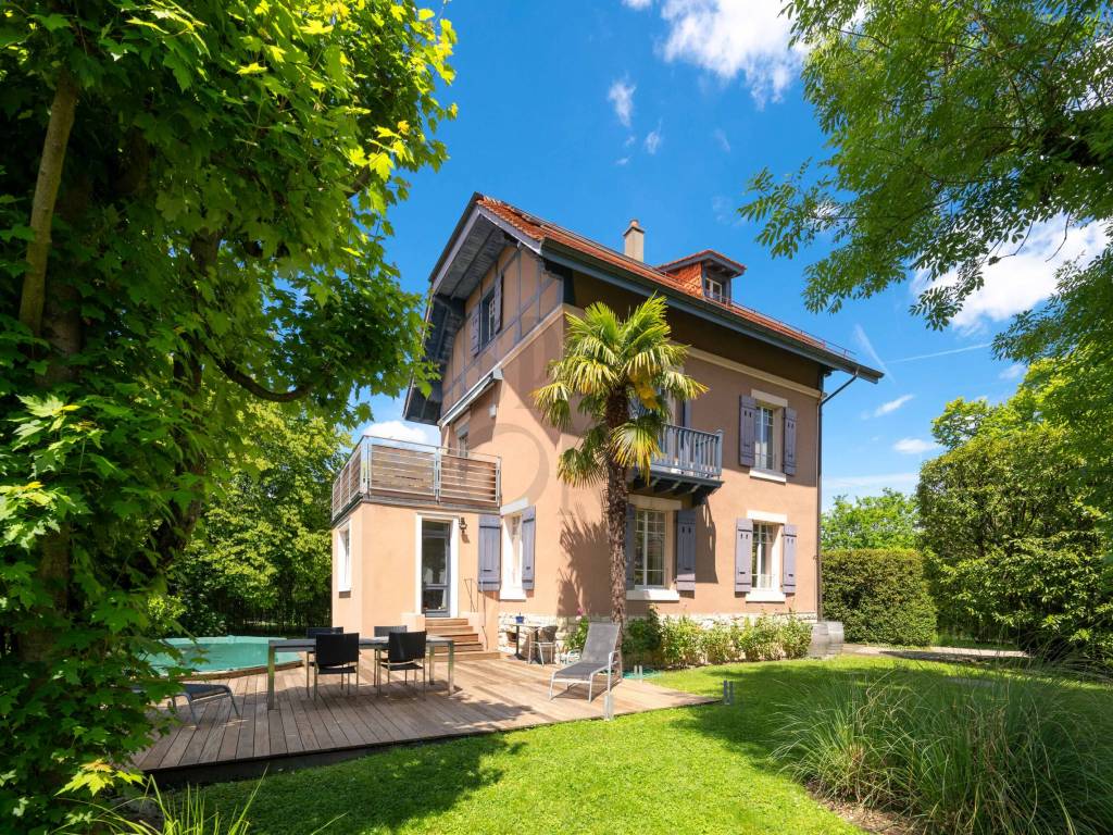 Close to the village of Chambésy, set in a peaceful leafy street, this elegant character house built at the beginning of the XXᵉ century seduces with its generous volumes and beautiful luminosity.