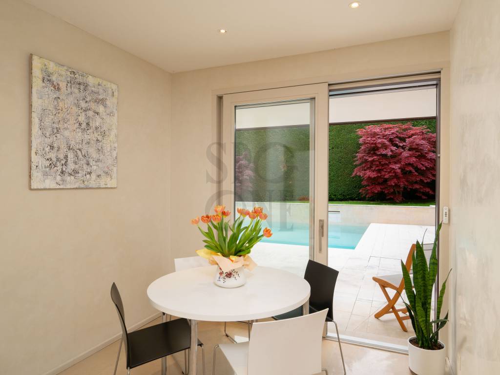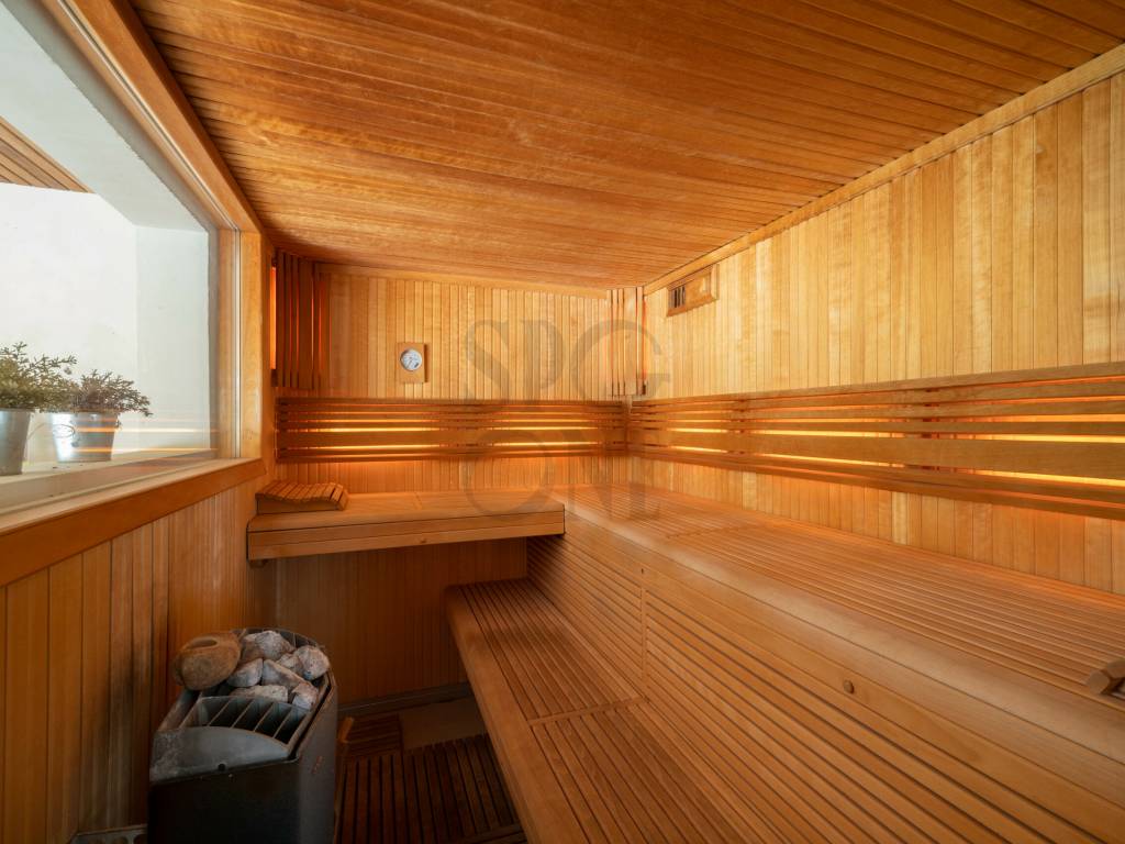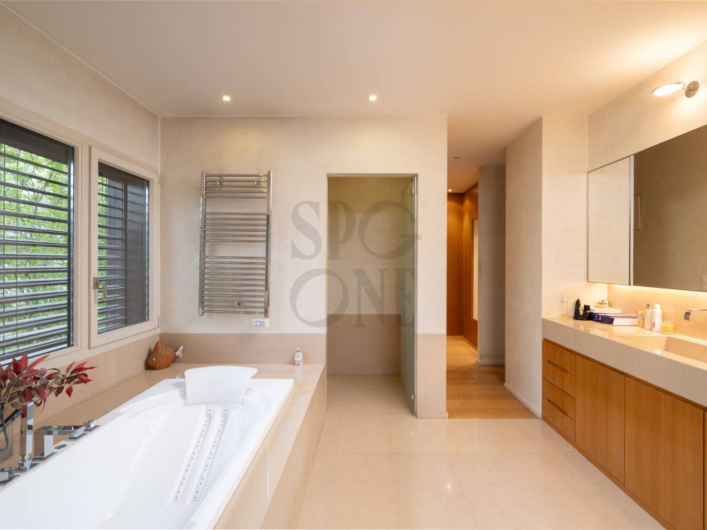 Externally, the carefully landscaped garden hosts a 14 × 6 m heated swimming pool, a pool house with summer kitchen and barbecue, as well as a wellness area with sauna, shower and changing room. An independent cottage with bathroom and kitchenette completes this rare ensemble.