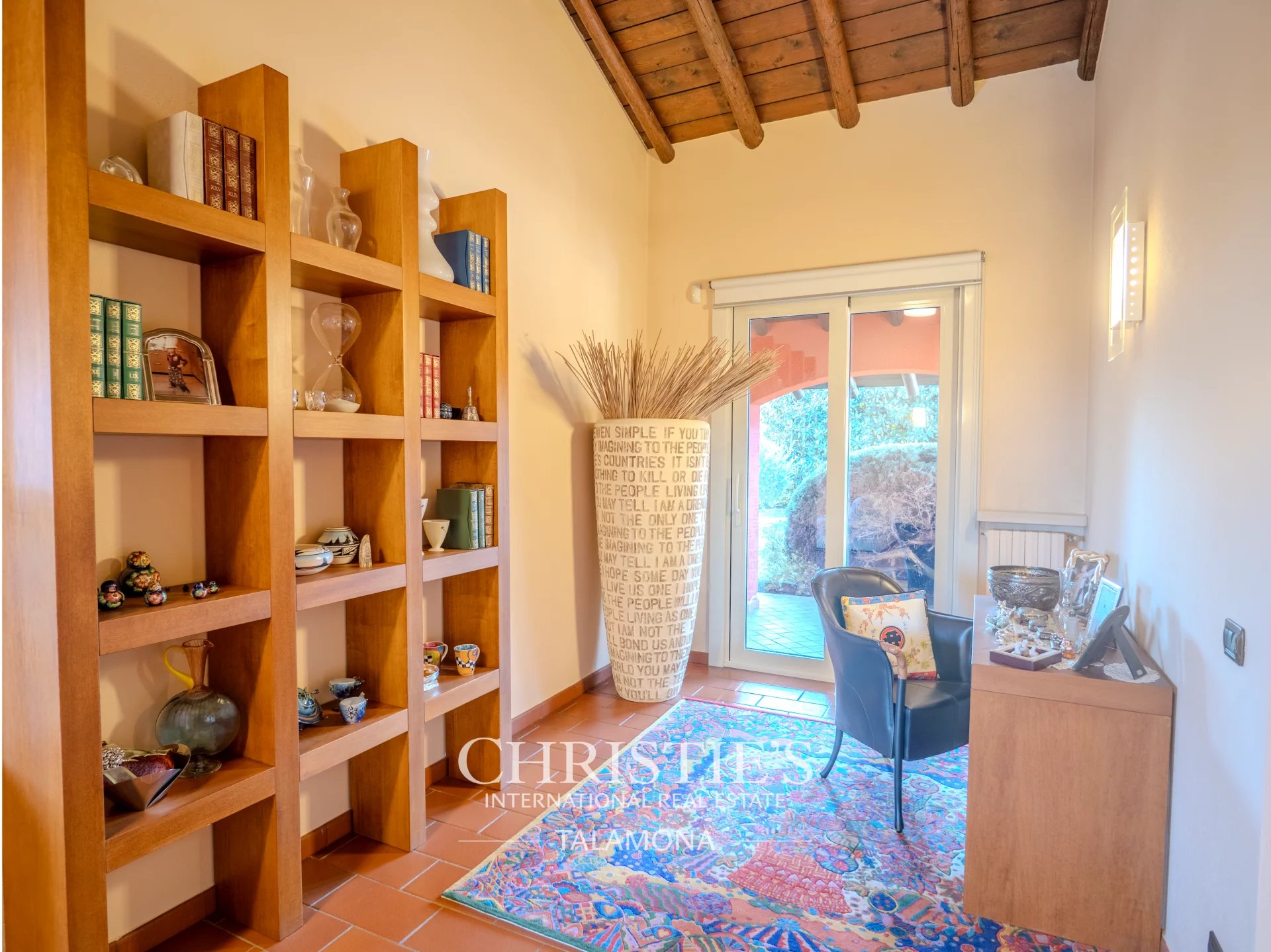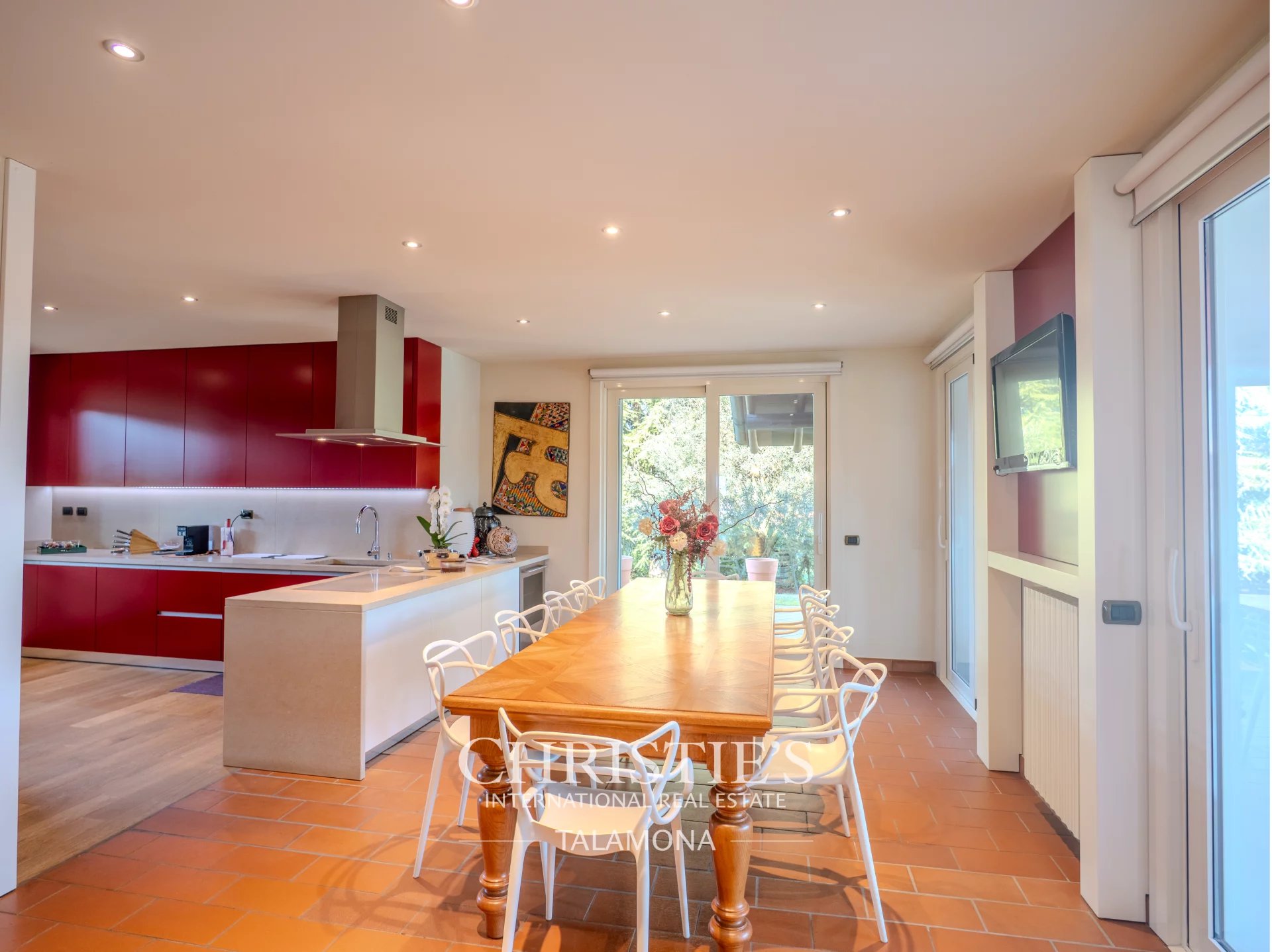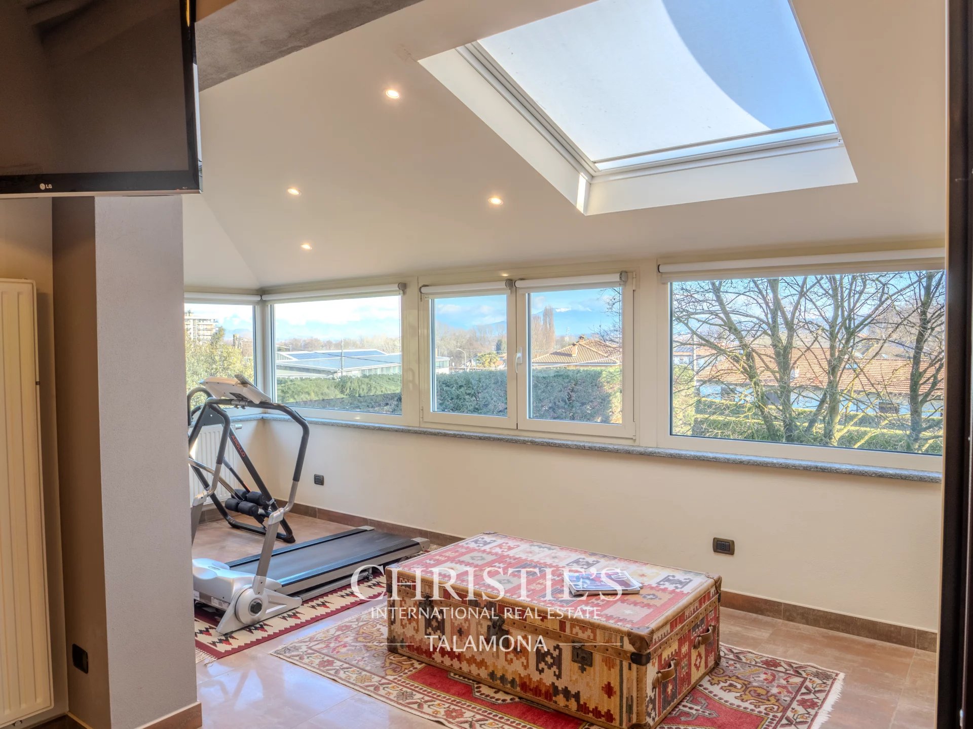 The living area on the ground floor equipped with double-height ceilings enjoys ample brightness and overlooks the large garden through a splendid porch serving the pool area.