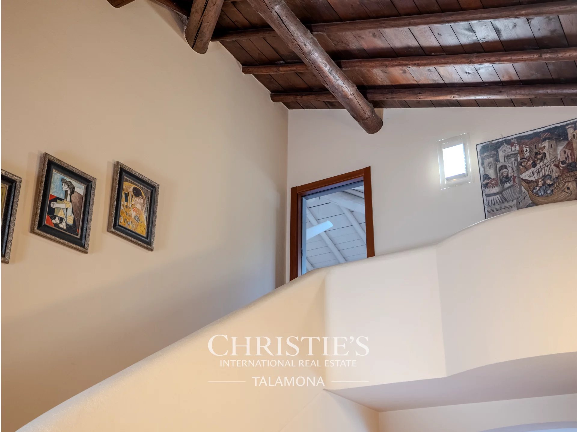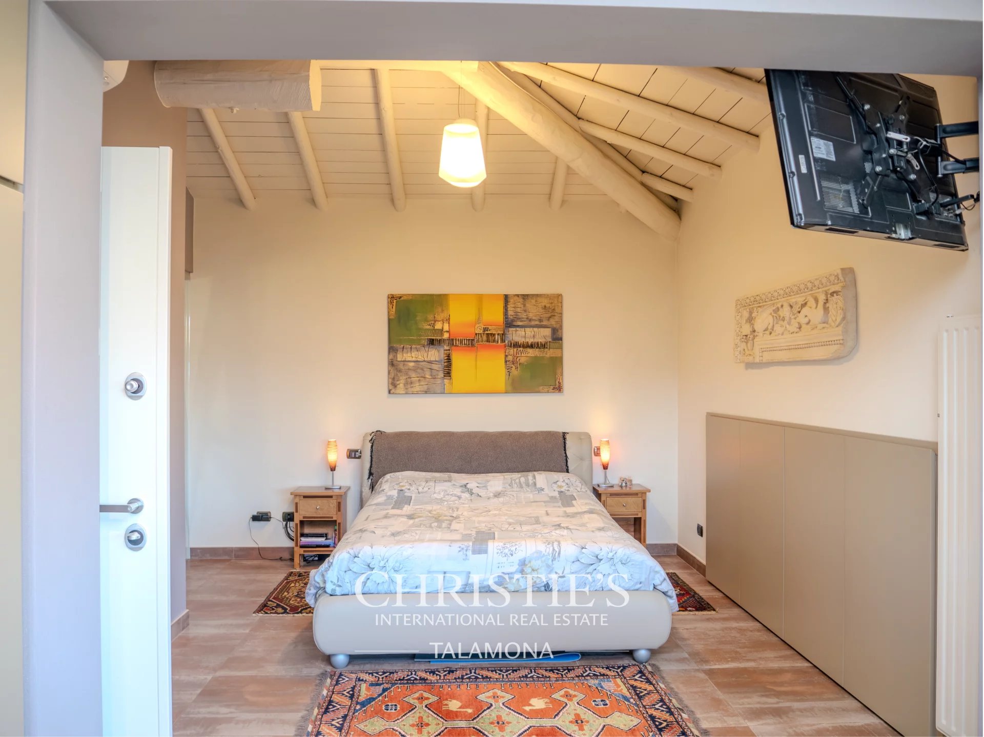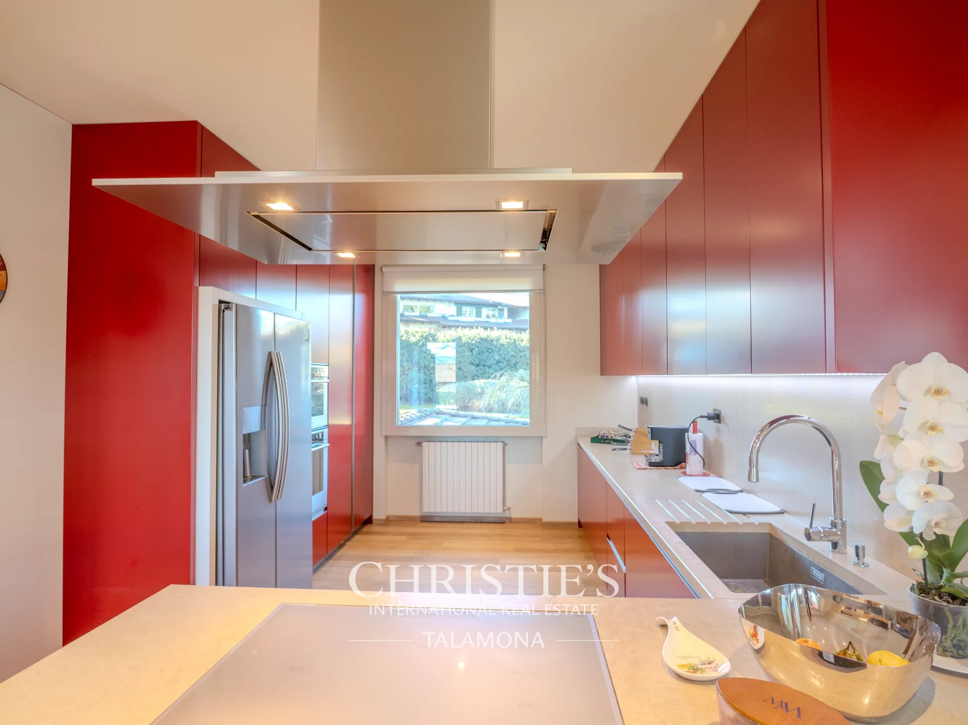 The living area on the ground floor equipped with double-height ceilings enjoys ample brightness and overlooks the large garden through a splendid porch serving the pool area.