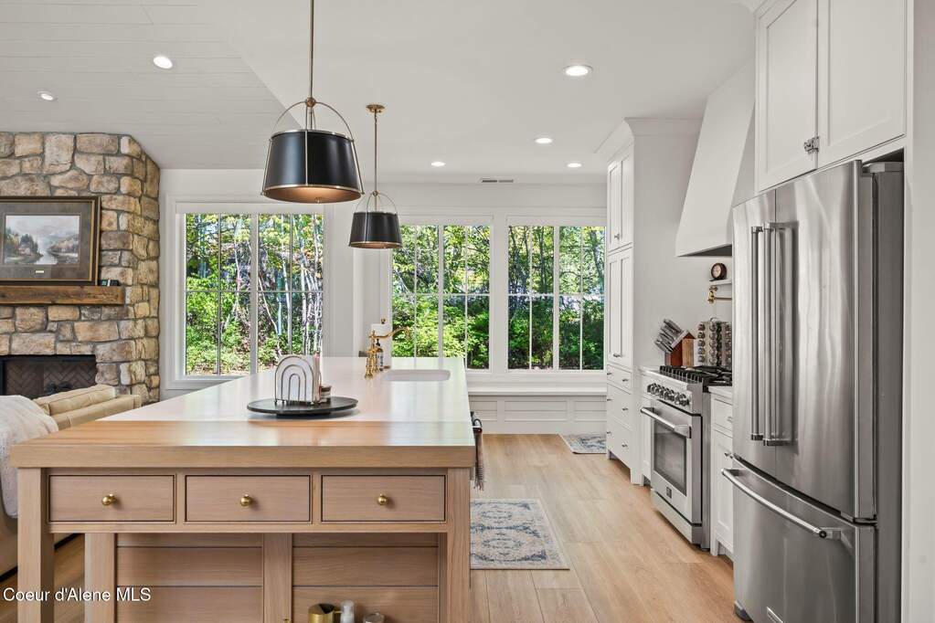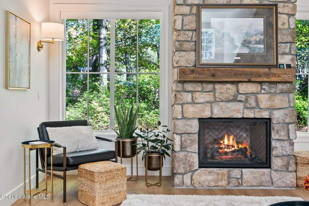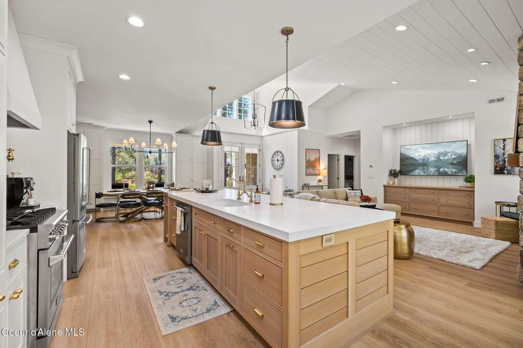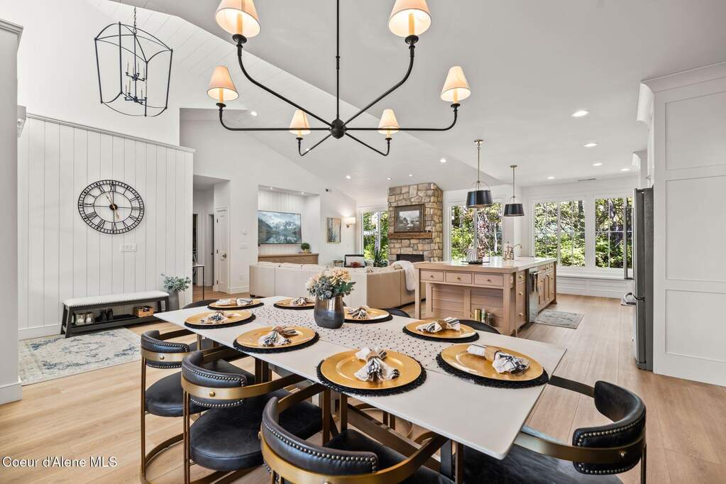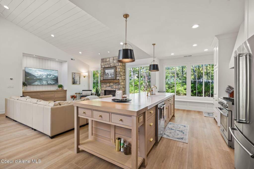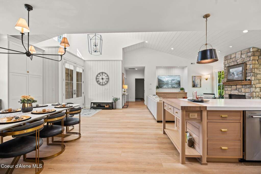 Timeless craftsmanship and refined mountain living come together in this beautifully designed custom home just blocks from the water in the highly desirable Dover Bay community. Vaulted ceilings and oversized windows fill the open-concept living space with natural light, highlighting custom white oak built-ins and a striking floor-to-ceiling stone fireplace that anchors the spacious great room. The chef's kitchen is thoughtfully appointed with stainless steel appliances, an Italian range with pot filler, custom plaster hood, white oak cabinetry and a large center island ideal for entertaining or everyday living, with seamless access to the private back patio. The dining area overlooks the expansive south-facing covered front porch, a perfect setting to relax and enjoy sunsets near the Pend Oreille River. The private primary suite is situated on one side of the home and features a generous bedroom with sitting area, dual closets, and a spa-inspired bath complete with custom cabinetry, Turkish mosaic marble flooring, and a luxurious rainfall shower. Two additional bedrooms and a full bathroom are positioned on the opposite side of the home, creating a desirable split-bedroom layout. A functional laundry room with storage leads to the attached two-car garage. Residents enjoy resort-style amenities including miles of walking and biking trails, a community marina, beach access, restaurant, fitness center, and sports courts. Located just minutes from Sandpoint and approximately 35 minutes from skiing at Schweitzer Mountain Resort, this home offers the perfect balance of luxury, recreation and North Idaho living.