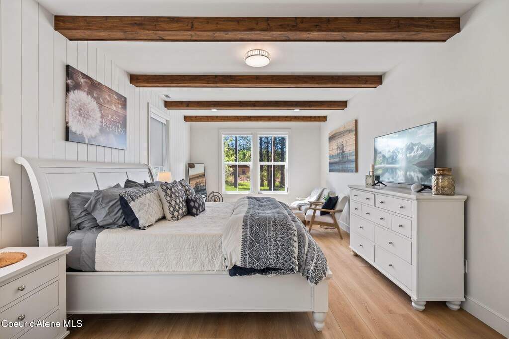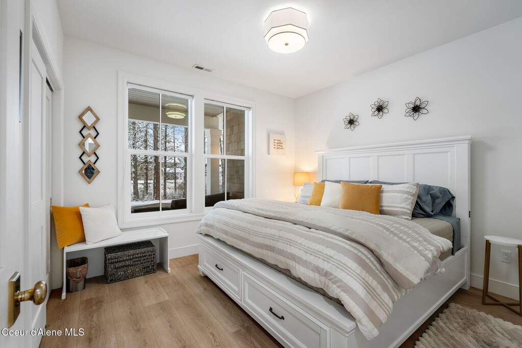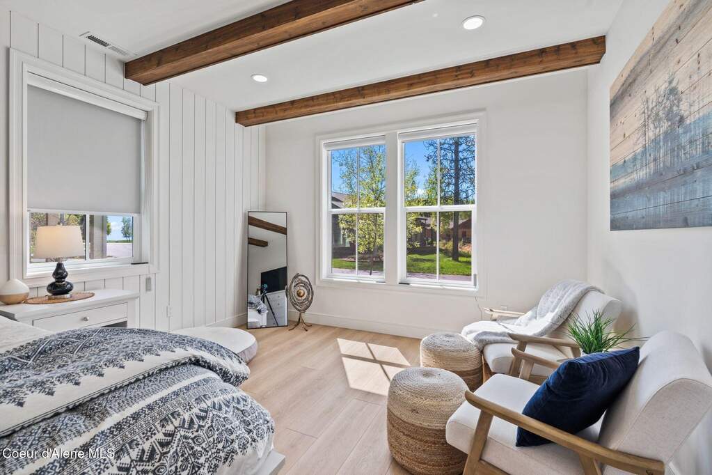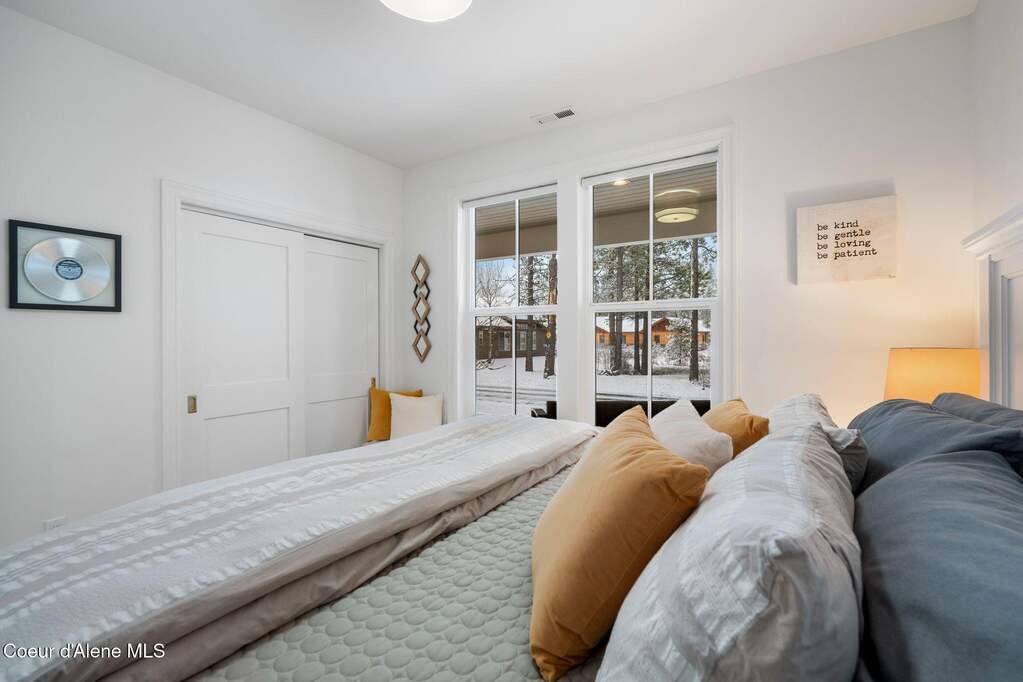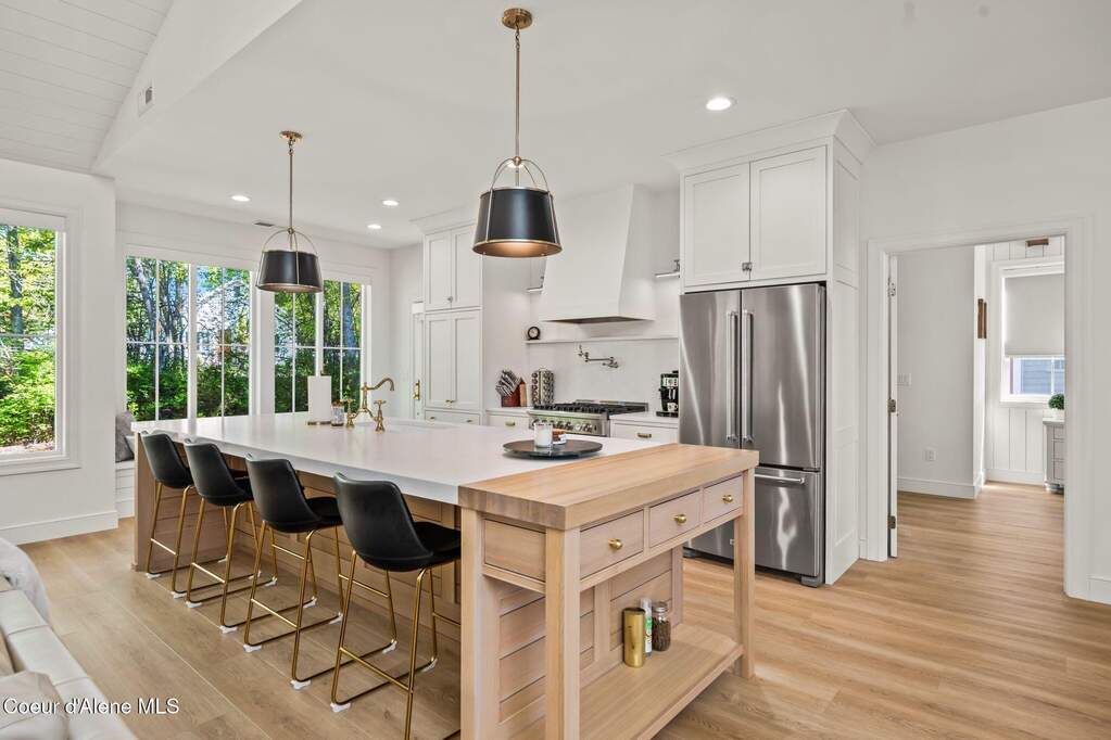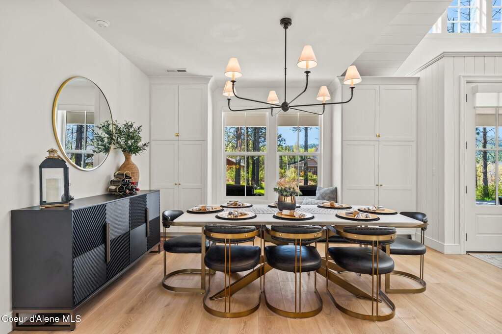 Timeless craftsmanship and refined mountain living come together in this beautifully designed custom home just blocks from the water in the highly desirable Dover Bay community. Vaulted ceilings and oversized windows fill the open-concept living space with natural light, highlighting custom white oak built-ins and a striking floor-to-ceiling stone fireplace that anchors the spacious great room. The chef's kitchen is thoughtfully appointed with stainless steel appliances, an Italian range with pot filler, custom plaster hood, white oak cabinetry and a large center island ideal for entertaining or everyday living, with seamless access to the private back patio. The dining area overlooks the expansive south-facing covered front porch, a perfect setting to relax and enjoy sunsets near the Pend Oreille River. The private primary suite is situated on one side of the home and features a generous bedroom with sitting area, dual closets, and a spa-inspired bath complete with custom cabinetry, Turkish mosaic marble flooring, and a luxurious rainfall shower. Two additional bedrooms and a full bathroom are positioned on the opposite side of the home, creating a desirable split-bedroom layout. A functional laundry room with storage leads to the attached two-car garage. Residents enjoy resort-style amenities including miles of walking and biking trails, a community marina, beach access, restaurant, fitness center, and sports courts. Located just minutes from Sandpoint and approximately 35 minutes from skiing at Schweitzer Mountain Resort, this home offers the perfect balance of luxury, recreation and North Idaho living.