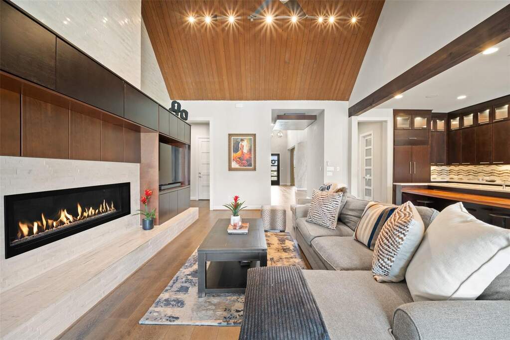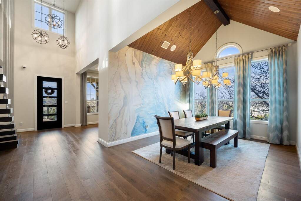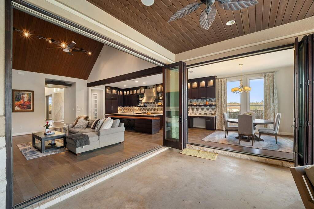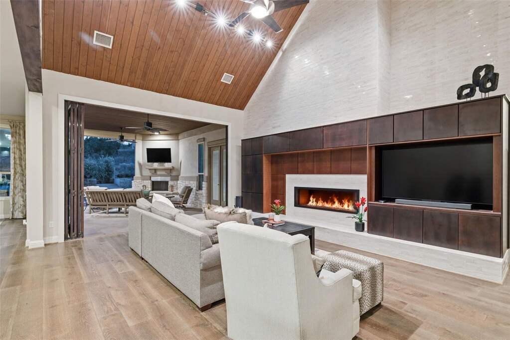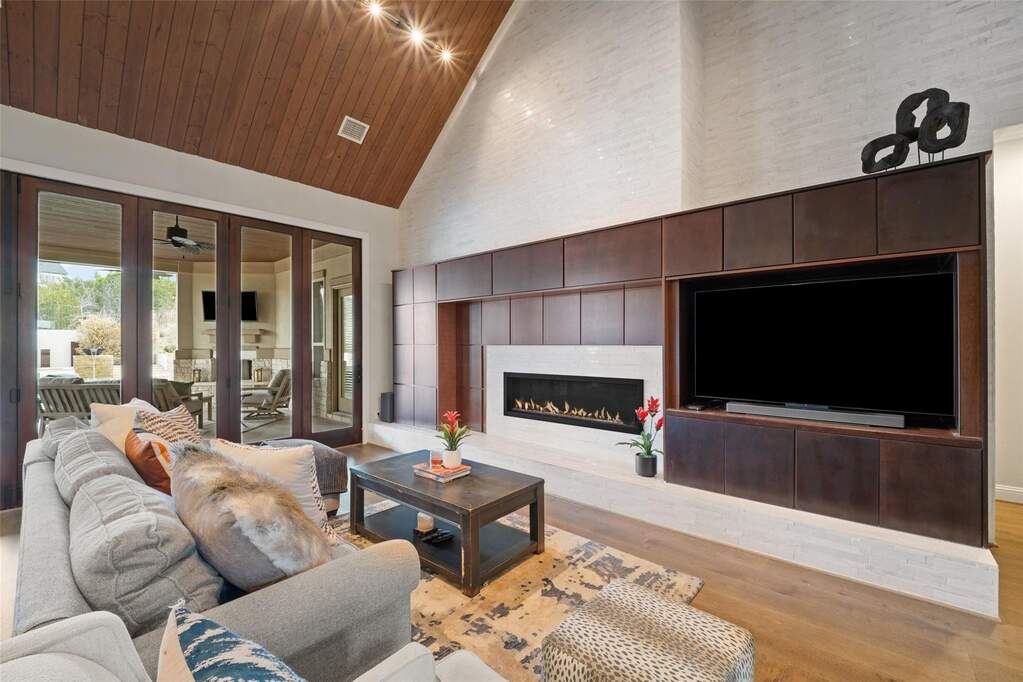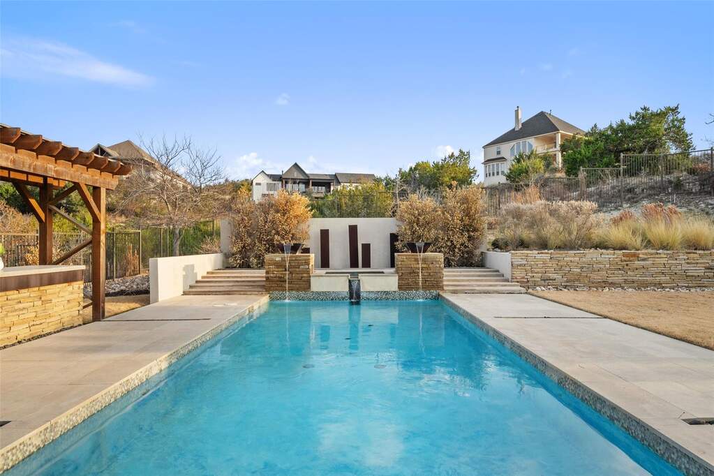 Perched on a hilltop within Lake Travis ISD, this warm contemporary 1½-story home combines thoughtful design, privacy, and peaceful views on an oversized 2 acre homesite only 7-8 minutes to the Hill Country Galleria and approximately 30 minutes to Downtown Austin. A sweeping circular drive creates a memorable arrival while positioning the home to take full advantage of the surrounding landscape and night skies, all while benefiting from a low tax rate and low HOA fees rarely found in properties offering this level of space and setting. The grand entry opens to vaulted ceilings and an expansive great room centered around a large island kitchen designed for gathering and entertaining. Expansive sliding glass doors create a seamless transition to covered outdoor living, where a fireplace, pool, and outdoor grilling area extend the living space for year-round enjoyment. Architectural details throughout include floating stairs, illuminated decorative onyx slabs, and numerous custom design elements, adding warmth and sophistication. The primary suite with spa bath and secondary bedrooms are located on the main level, creating an easy and functional everyday flow. A standout feature is the attached guest retreat with its own private entrance, kitchenette, and full bath, offering ideal flexibility for guests, multigenerational living, or private workspace needs. Upstairs, a spacious game room with wet bar, dedicated media room, and powder bath provide a separate entertainment space. Fully fenced with generous yard space, dog run, and room to enjoy the Hill Country setting, this property offers a rare balance of space, privacy, and convenience-just minutes from Bee Cave and the Hill Country Galleria's shopping, dining, and entertainment, as well as the natural beauty of Hamilton Pool and Reimers Ranch Park along the Pedernales River.