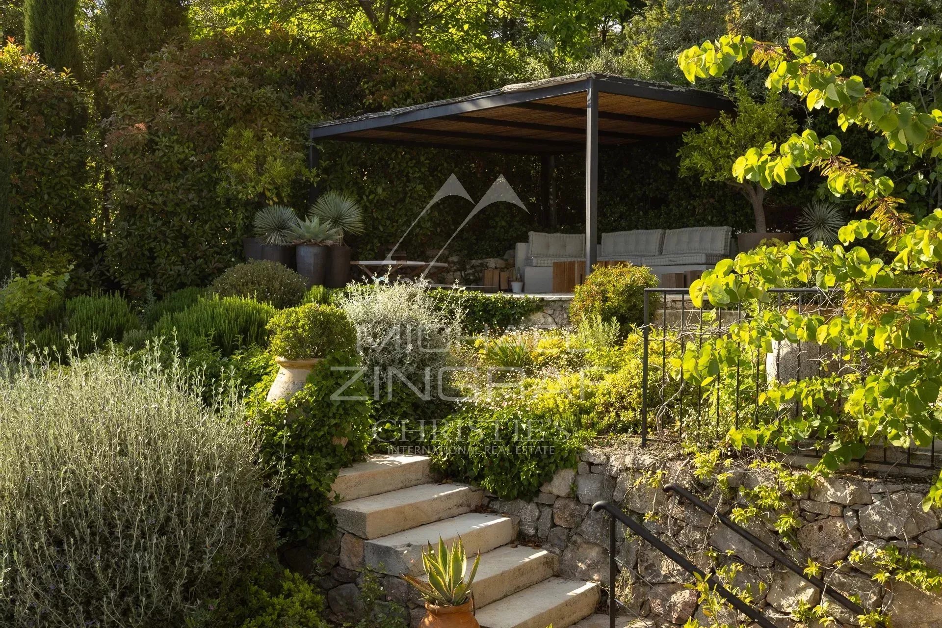 The carefully designed garden presents a succession of Mediterranean landscapes: olive trees, slender cypresses, lavender, and local species compose a setting of natural elegance.