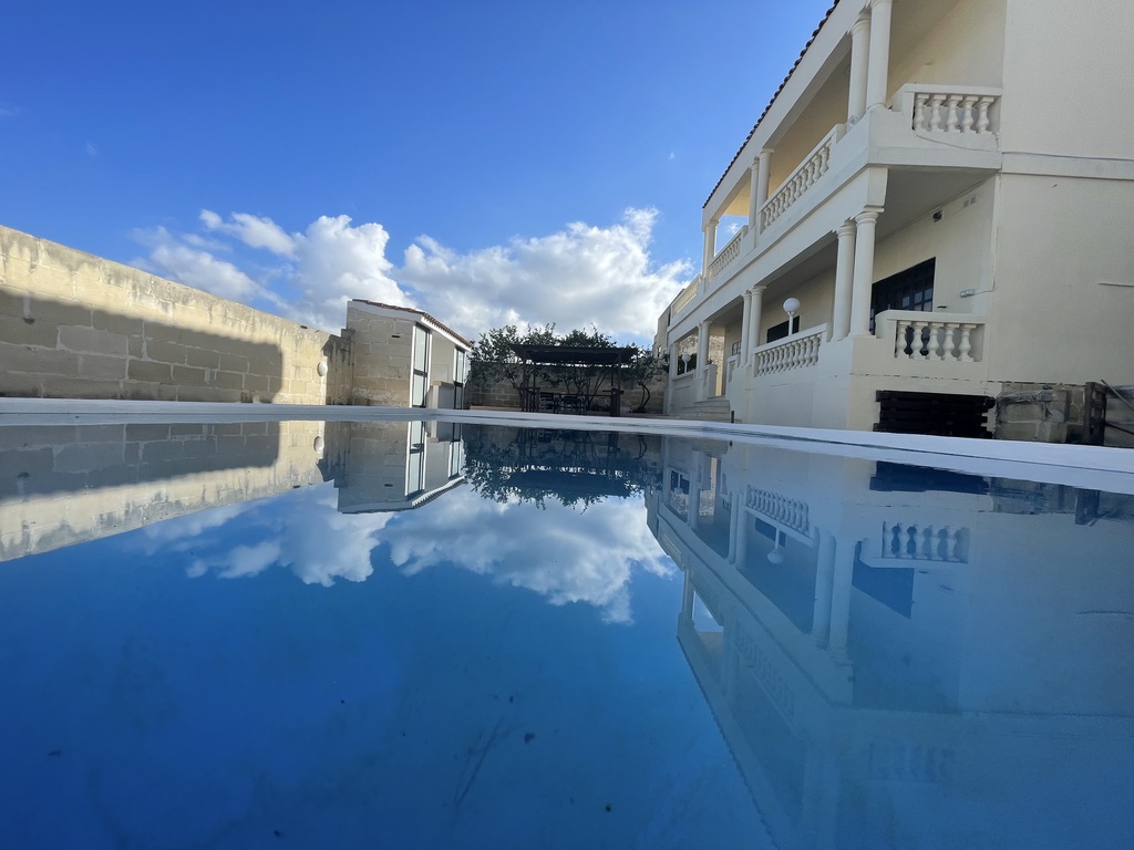 This fully detached imposing bungalow situated in a residential villa area having fantastic open views. Spacious accommodation layout comprises an entrance hall, lounge/dining area, separate kitchen, laundry room, 3 double bedrooms (main with en suite facilities), main bathroom, and a lovely back terrace overlooking the pool area. Underneath the property one finds a 2-bedroom flat let, 2 bathrooms, and a large pool and deck area with surrounding gardens, a long wide driveway with a 3-car interconnecting garage.