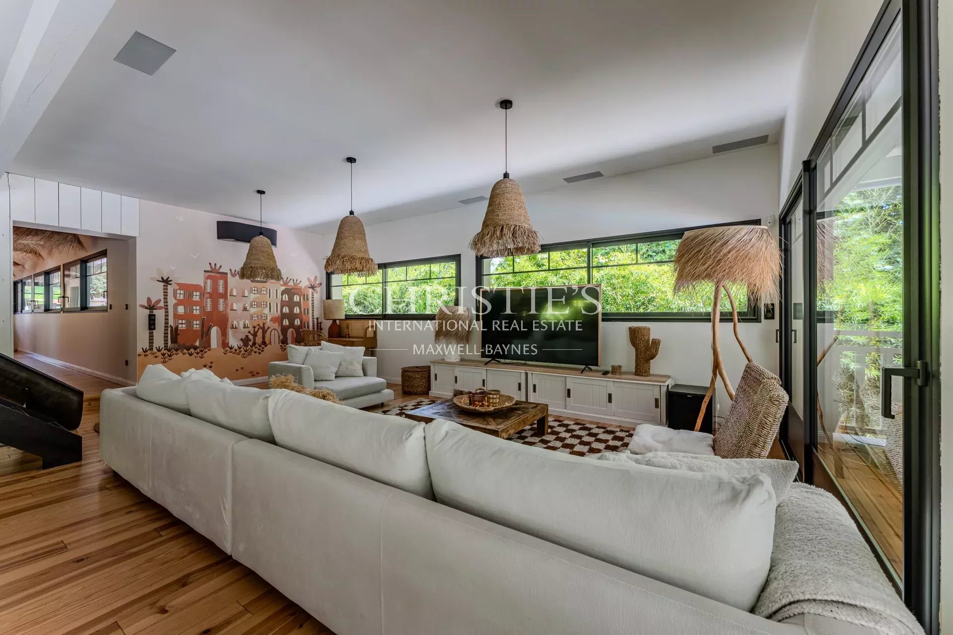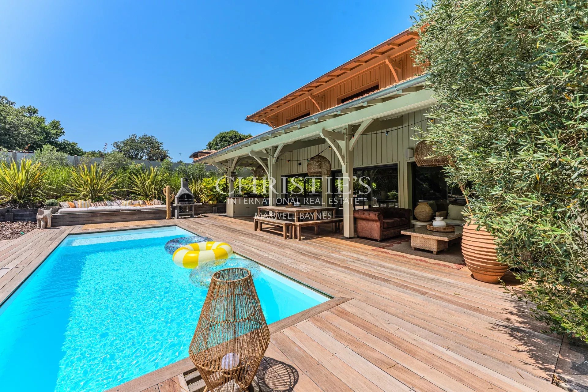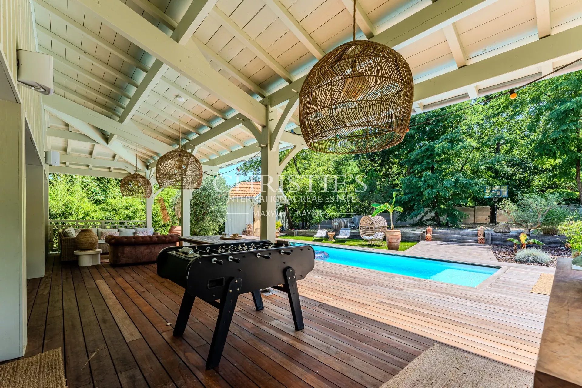 Designed with family life in mind, it opens onto a vast landscaped garden with swimming pool (8x3 m), boulodrome, summer kitchen and direct access to the forest via a gate at the far end of the plot.