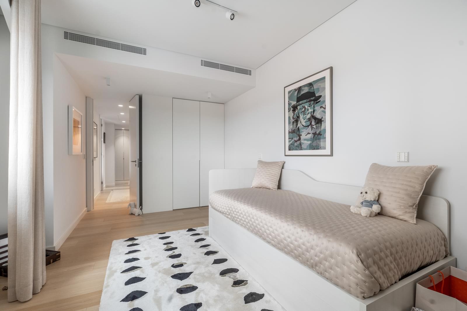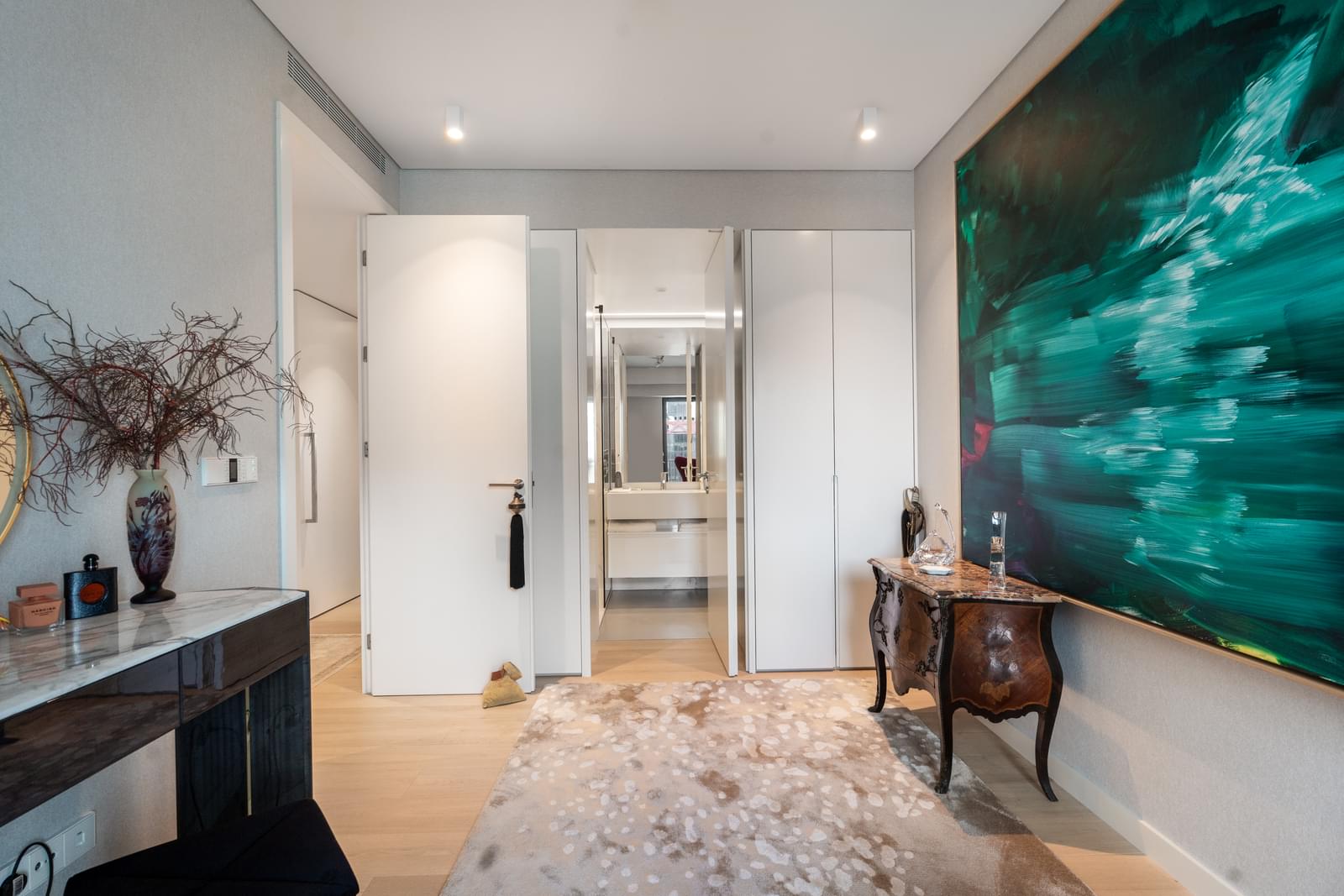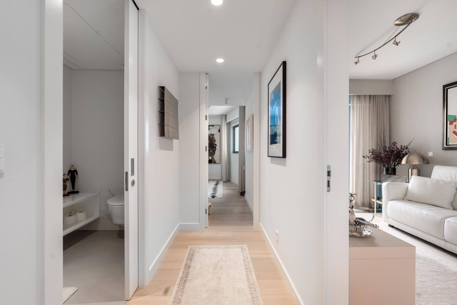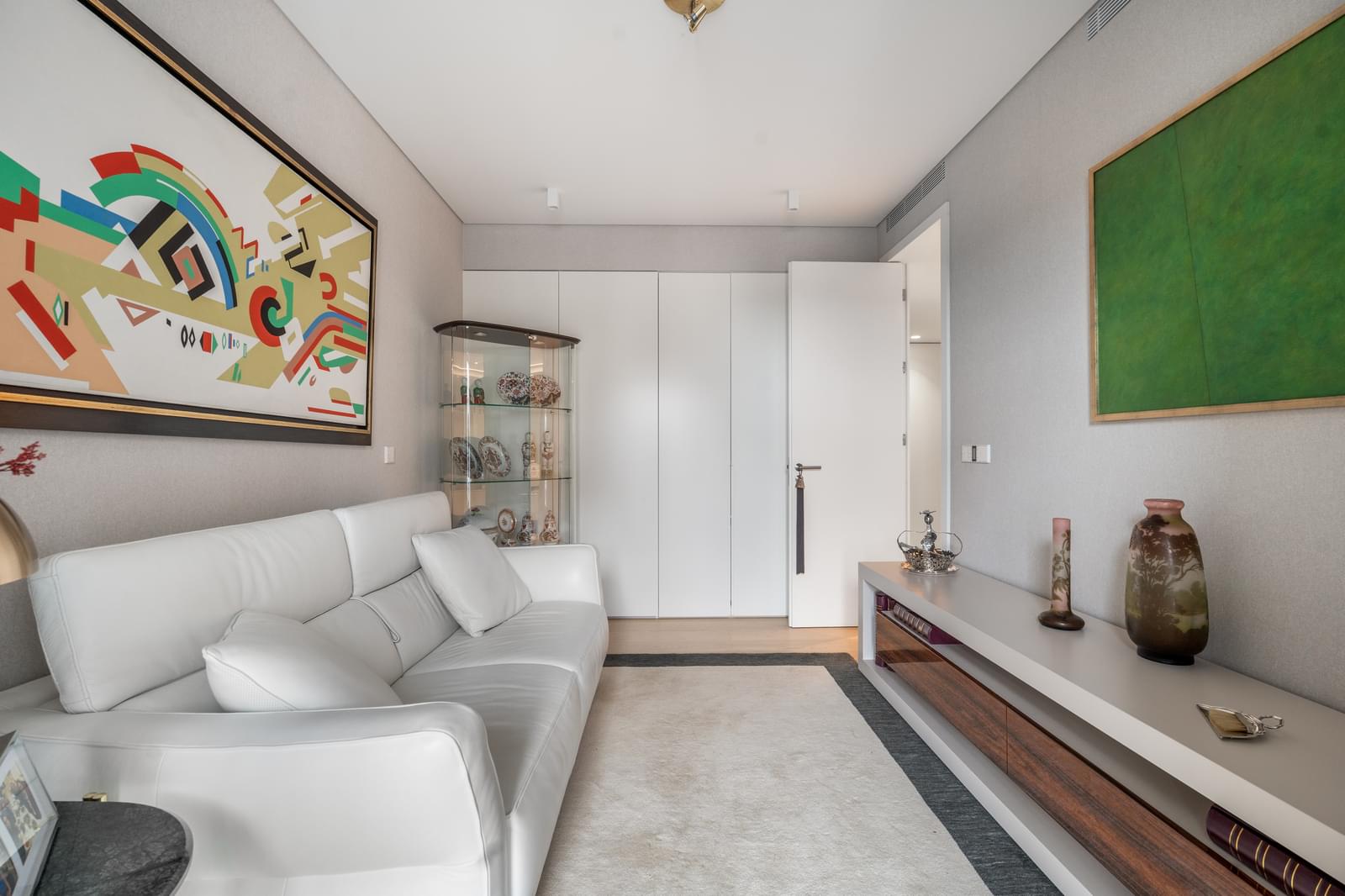 One of the apartment's greatest assets is its generous balconies and elevated position, offering completely unobstructed views over the city of Lisbon and Monsanto, allowing residents to enjoy a rare green setting within an urban environment. The orientation and height of the apartment guarantee privacy, tranquility, and wide, permanent views from both the living areas and the bedrooms.