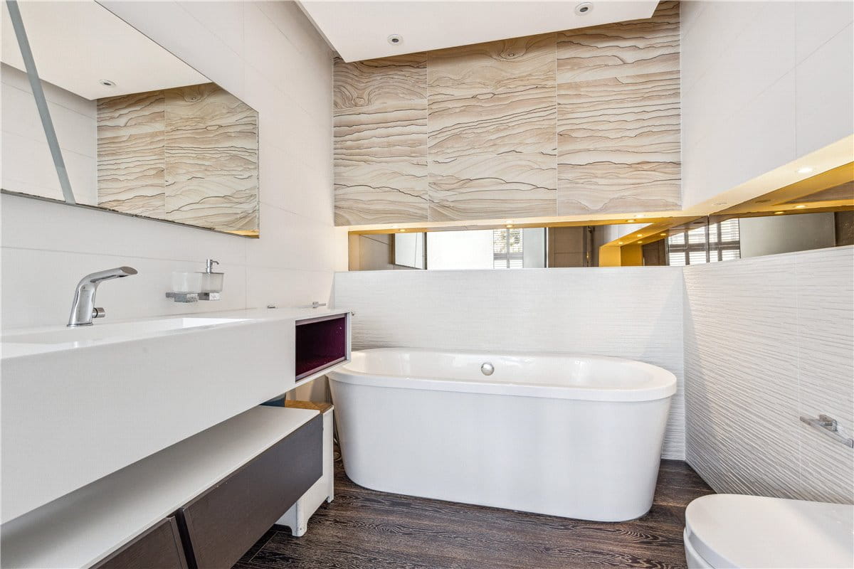 Located on the ground floor, the flat features a generous principal bedroom suite with fitted wardrobes and a sleek, modern en suite bathroom. A second double bedroom and a guest bathroom offer excellent further accommodation.