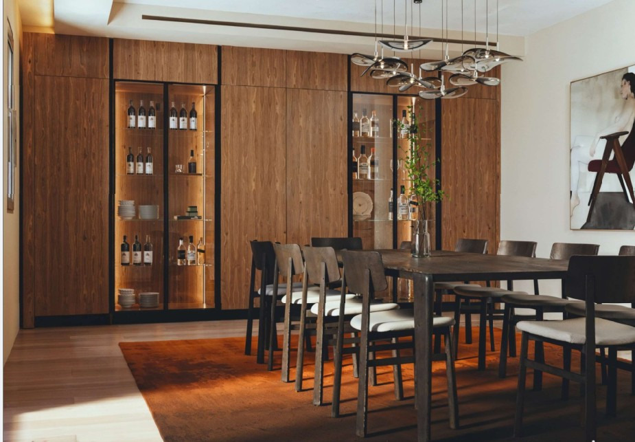 The villa is arranged over multiple levels and is immediately defined by its sense of flow and proportion. Upon entering, a welcoming hallway leads into an expansive open-plan living, kitchen, and dining area, conceived as the heart of the home. This space opens directly onto an outdoor pool deck complete with a kitchen and shower facilities, creating a seamless transition between interior and exterior areas. The layout lends itself naturally to hosting, with the pool terrace acting as an extension of the main living zone rather than a separate amenity. Also located on the ground floor is a dedicated study, suitable for home working or quiet reading, alongside a well-appointed guest cloakroom.