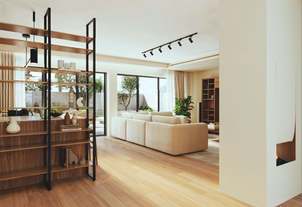 The villa is being offered highly finished, with a specification that reflects a thoughtful approach to long-term quality rather than short-lived trends. The kitchen is fully fitted and equipped with appliances, while bathrooms are completed to a contemporary standard. All internal and external doors are included, as are custom walk-in wardrobes throughout. Internal flooring is finished in parquet wood, adding warmth and continuity across the living and sleeping spaces. A gas fireplace is positioned within the kitchen and living area, providing both visual focus and practical comfort during cooler months.