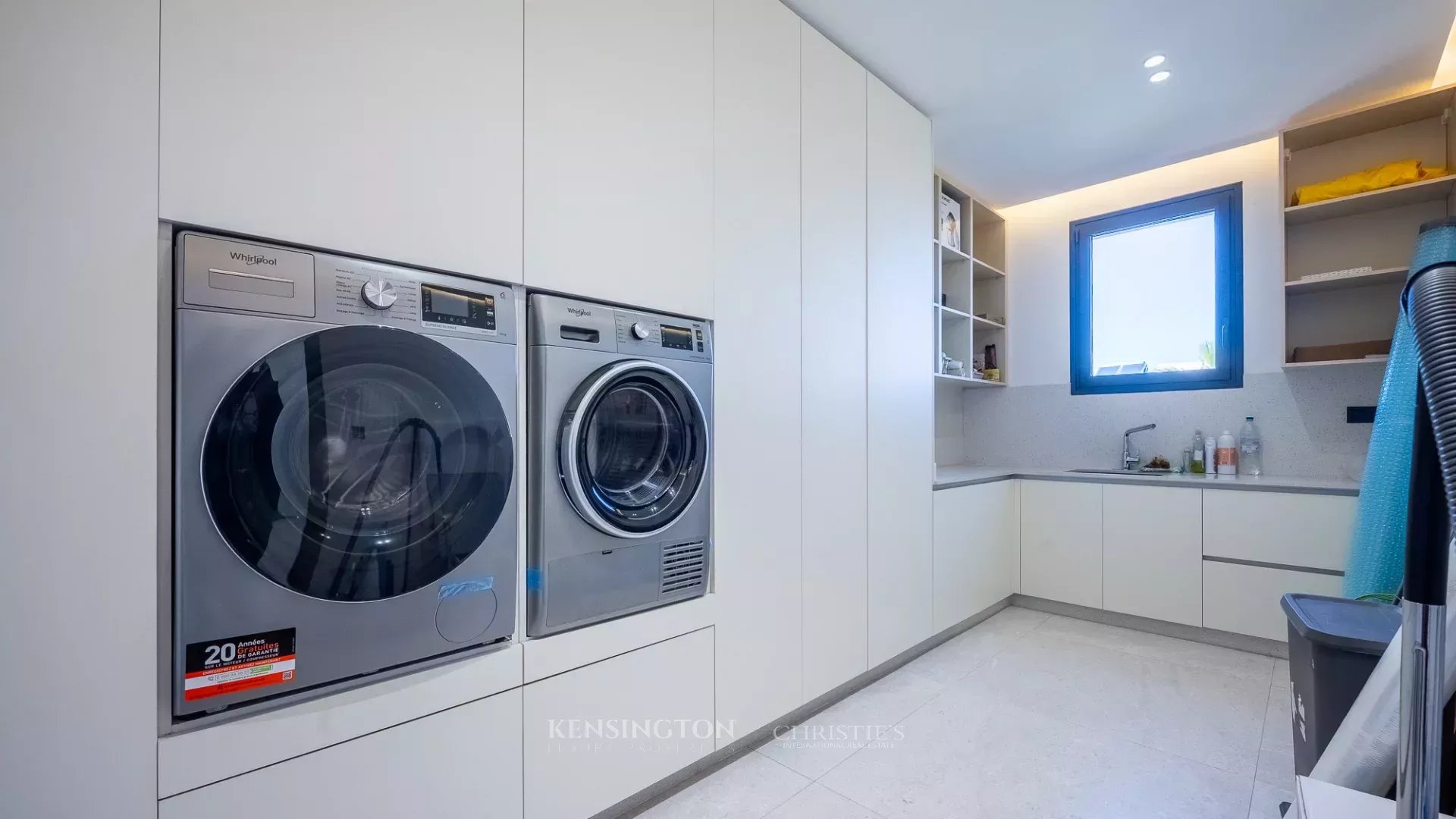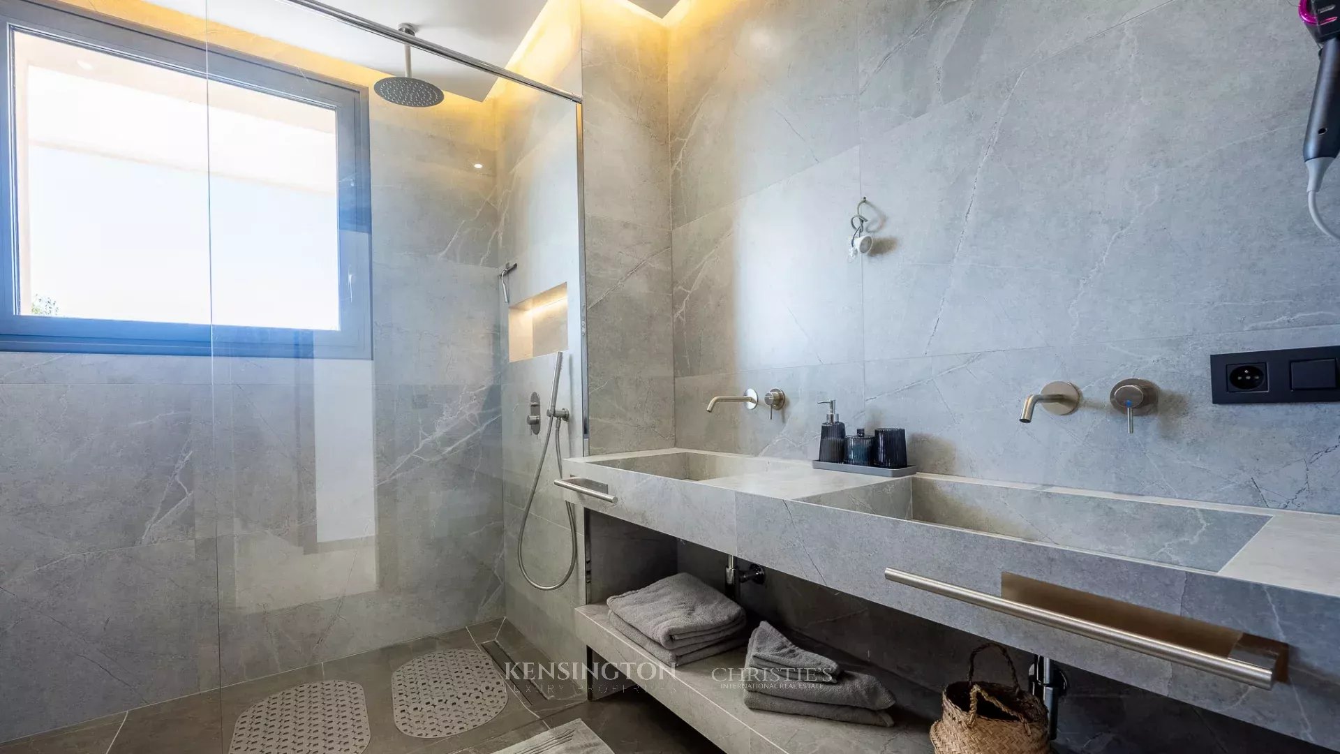 The reception area features an elegant living room with a designer fireplace, a dining room open to the outdoors, and large bay windows providing beautiful natural light. The fully fitted and equipped kitchen is complemented by a back kitchen and a laundry room, ensuring practical day-to-day organization. The villa offers five bedrooms, including two master suites, as well as a private hammam.