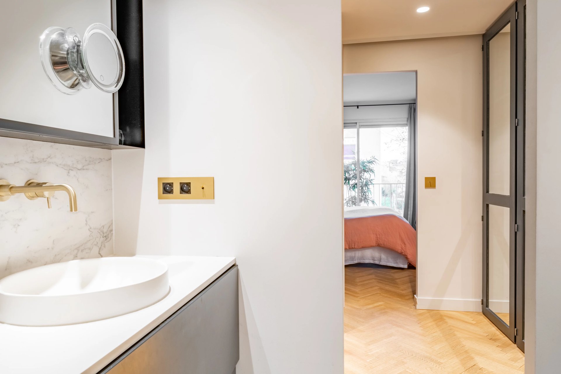Argenson neighbourhood. This apartment in perfect condition is on the 3rd floor of a luxurious 1970s building. Tastefully renovated by an interior decorator, it includes an entry with fitted cupboards, a bright living/dining room overlooking leafy greenery, a kitchen, a suite with a shower room and walk-in wardrobe, and a separate wc.