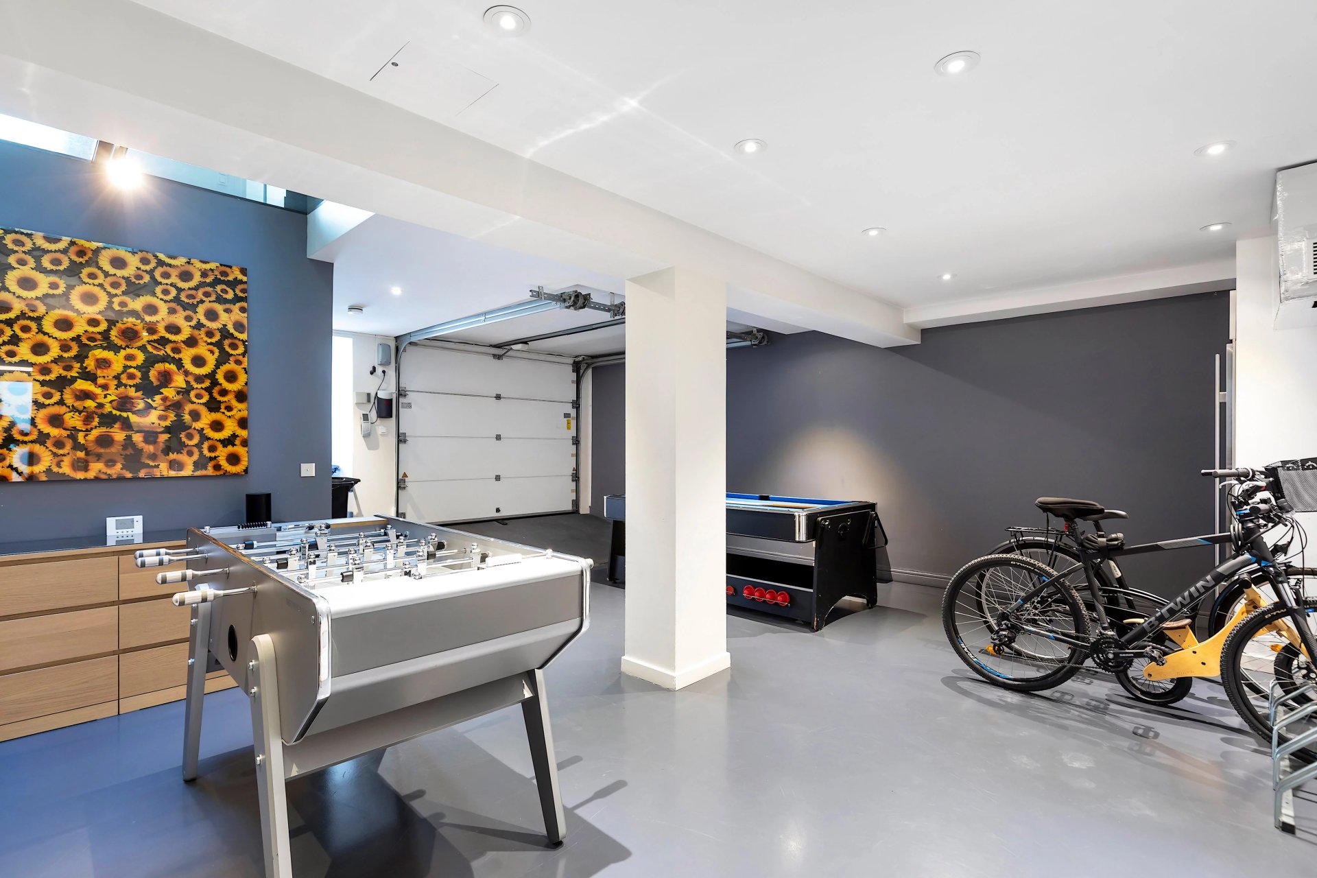 On a basement with a billiard room, a fitness room, a home cinema, a garage and a utility room.