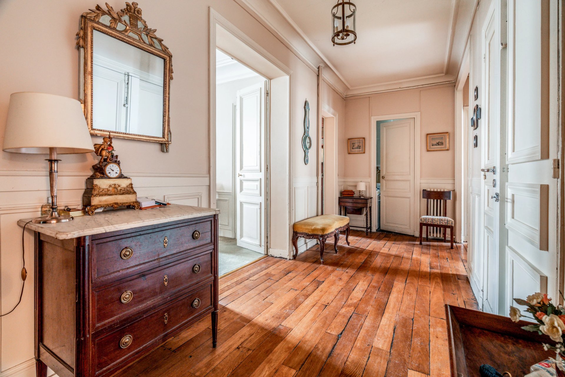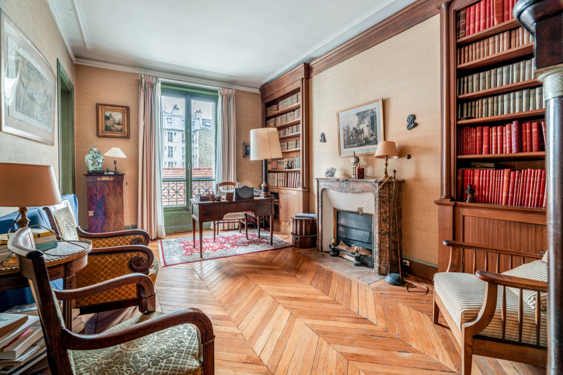 Period features include parquet flooring and fireplaces.