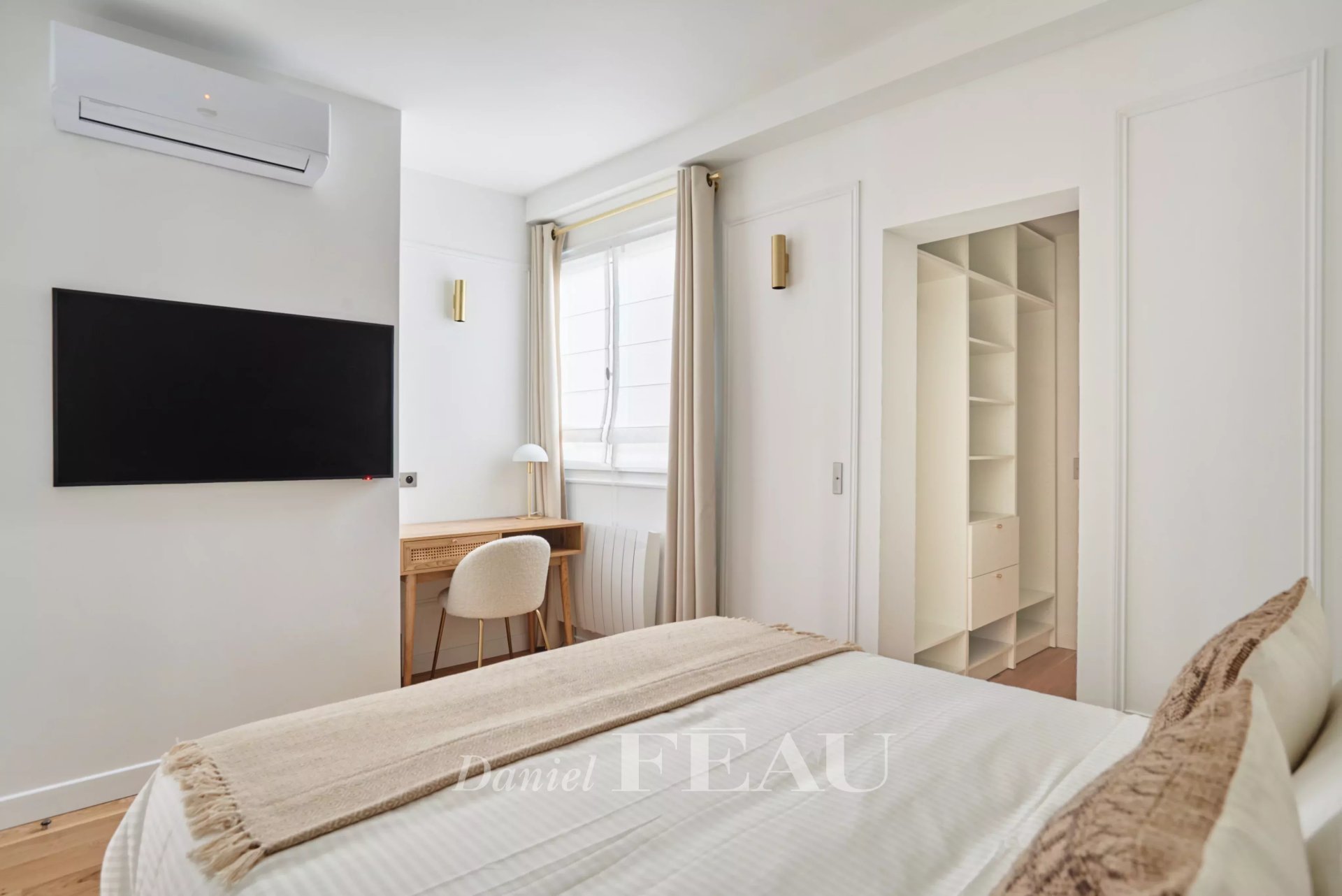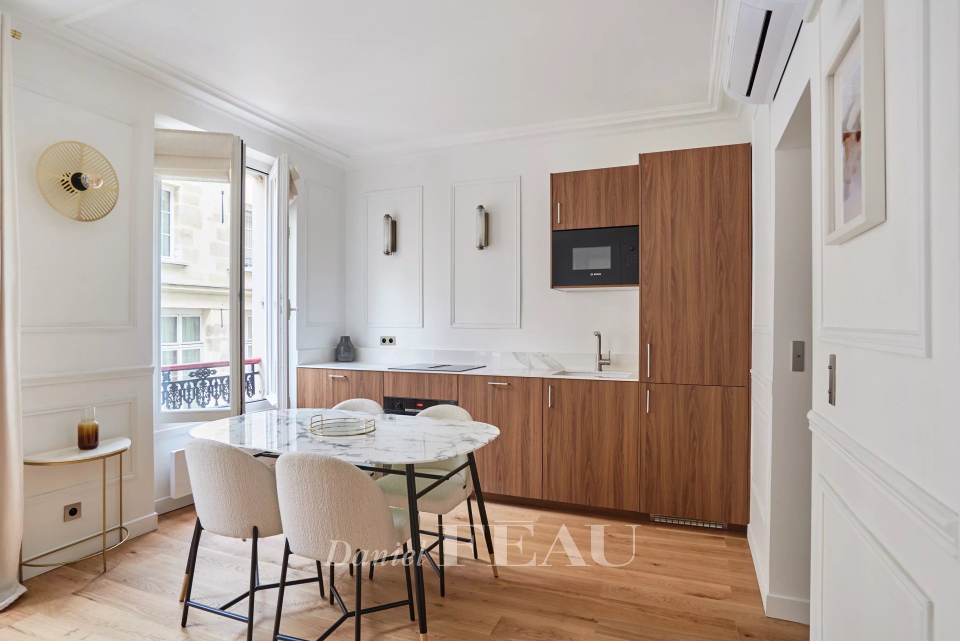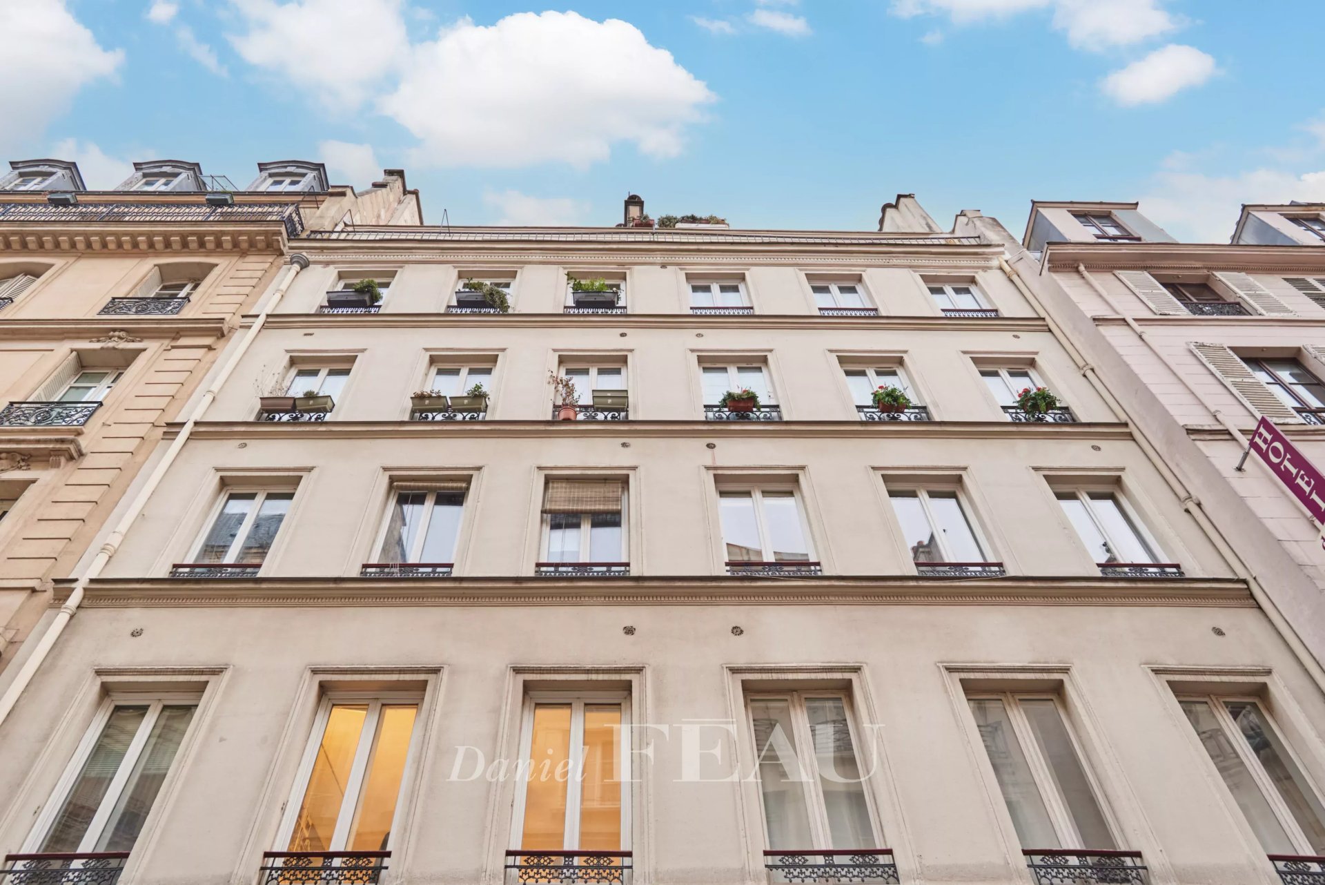 This bright and peaceful apartment is on the second floor of a character 19th century building with a lift located in a peaceful street between Odéon and Pont-Neuf. Renovated and furnished, it comprises a bright living room with an equipped kitchen, a bedroom with a study area overlooking a courtyard, a walk-in wardrobe, a shower room/wc, a utility area and a guest wc.