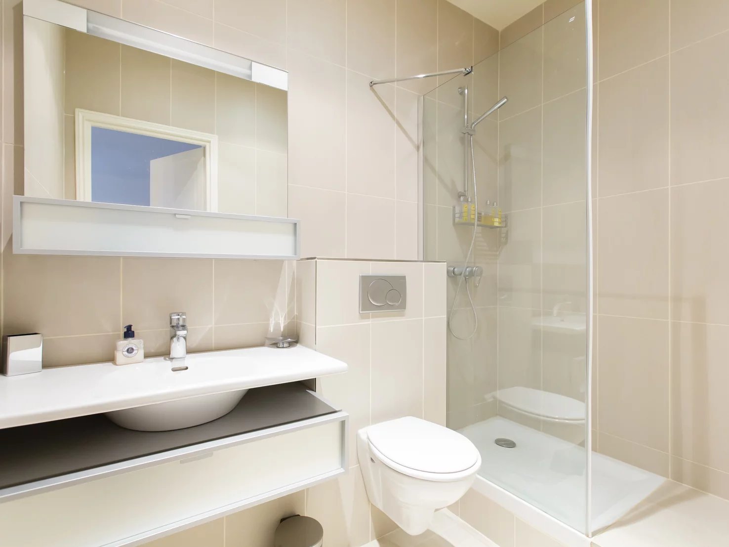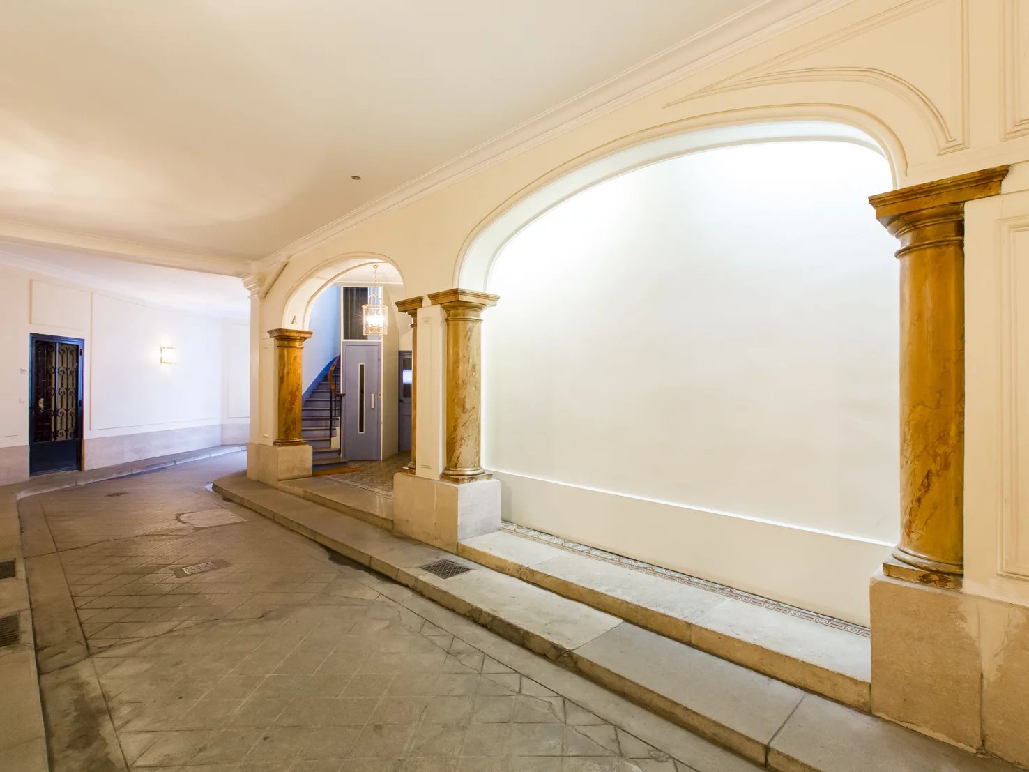 Rue Saint-Sulpice. This delightful 35 sqm studio apartment is on the ground floor of a fine late 18th century building. Opening onto a pretty leafy paved courtyard, it includes a bright main room with a bedroom area separated by a fireplace, an open-plan kitchen with a little bar, and a shower room.