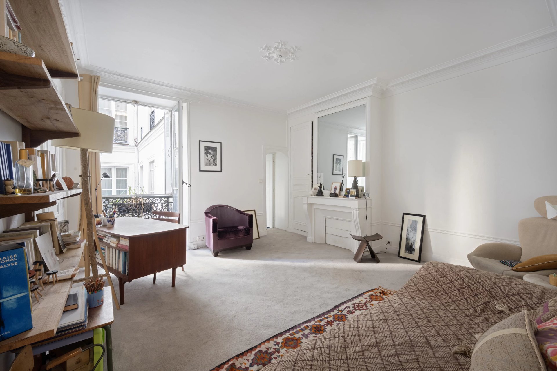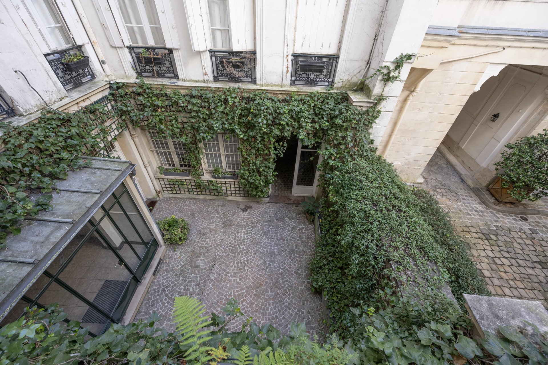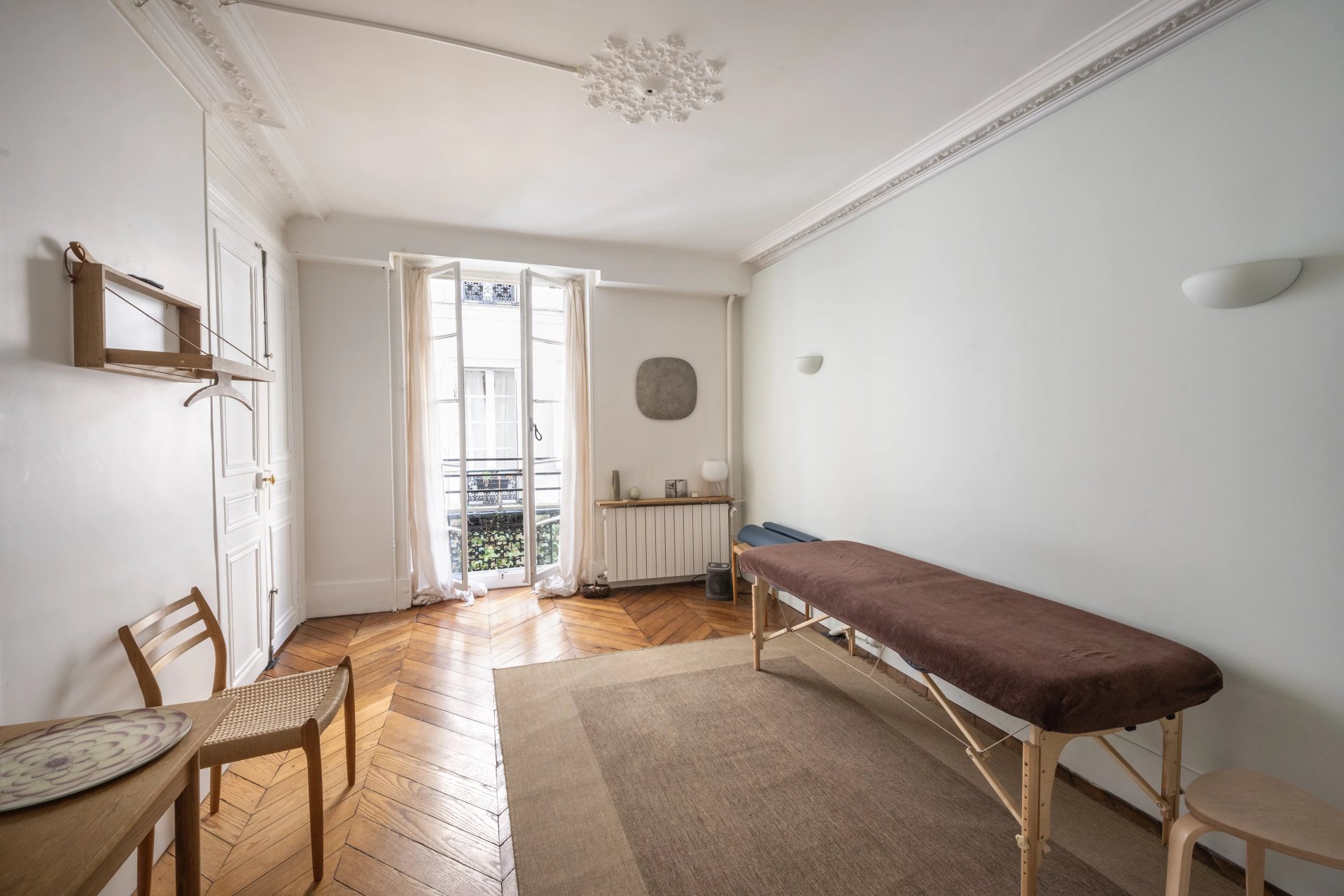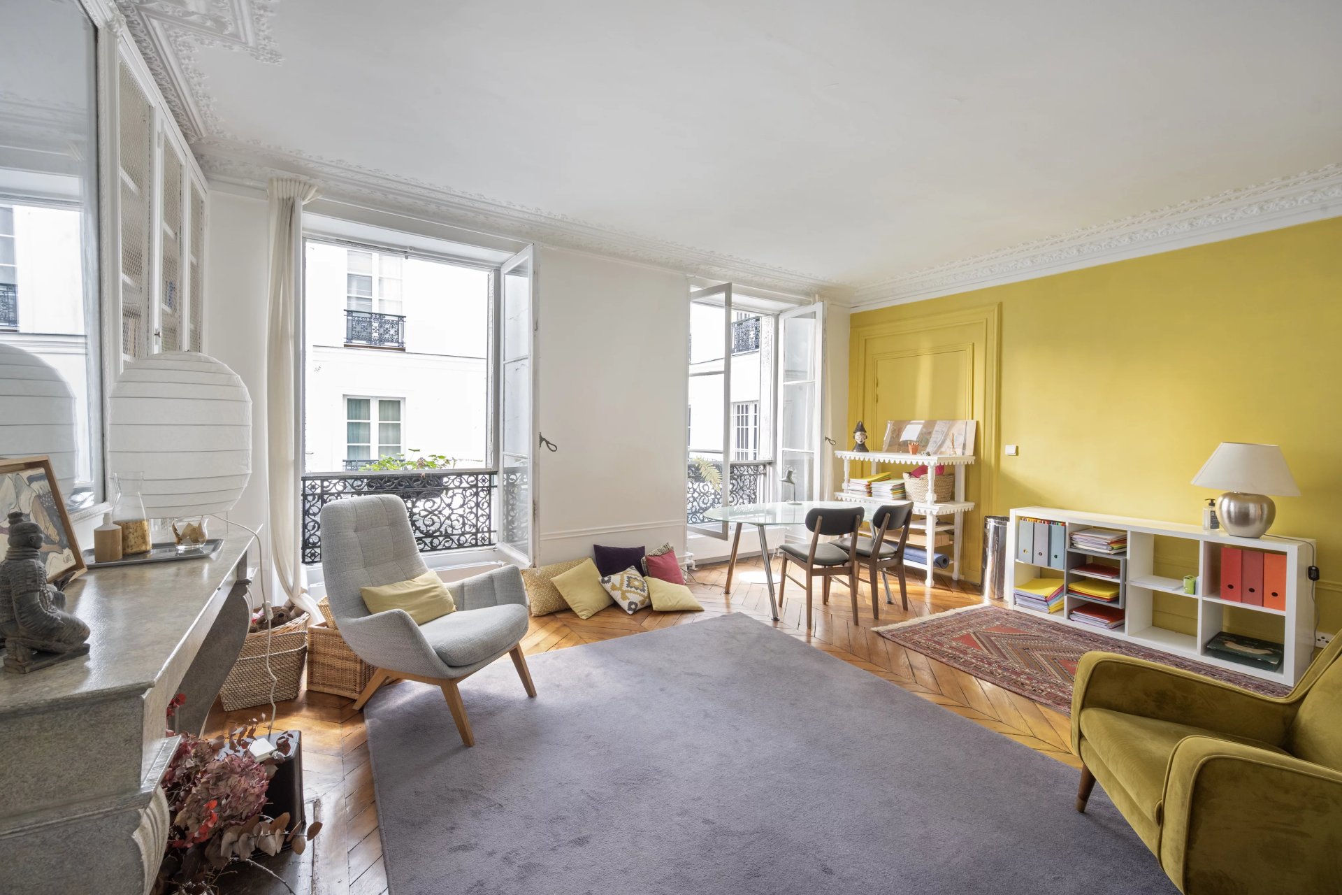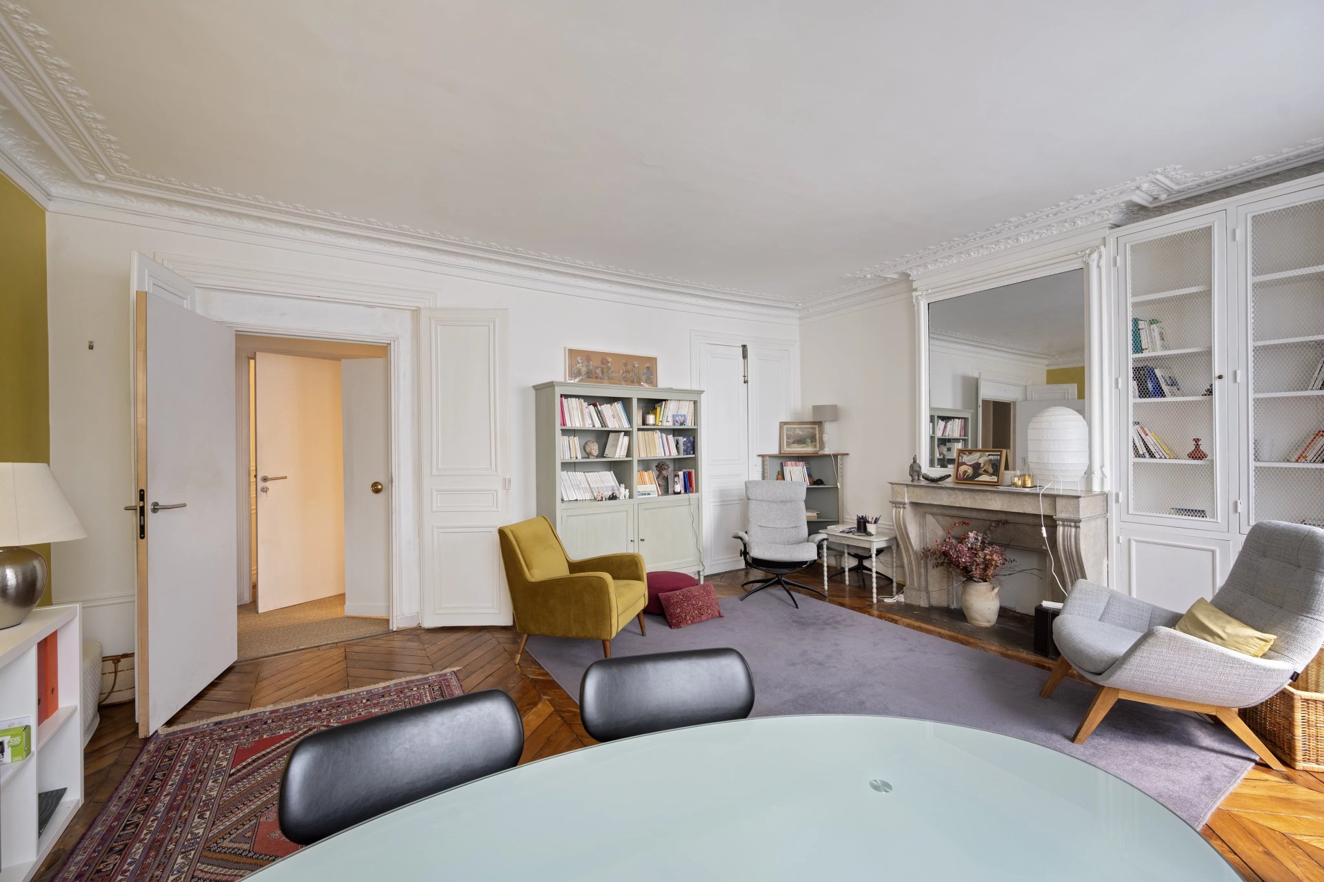 In a building dating from 1870 with an elevator, on the 1st floor, apartment overlooking two quiet courtyards, with a surface area of 109 m² (Carrez law) and 113 m² (floor space). It comprises an entrance hall, a living room, a dining room, a kitchen, two bedrooms, a shower room, a bathroom, a laundry room, and a separate toilet.