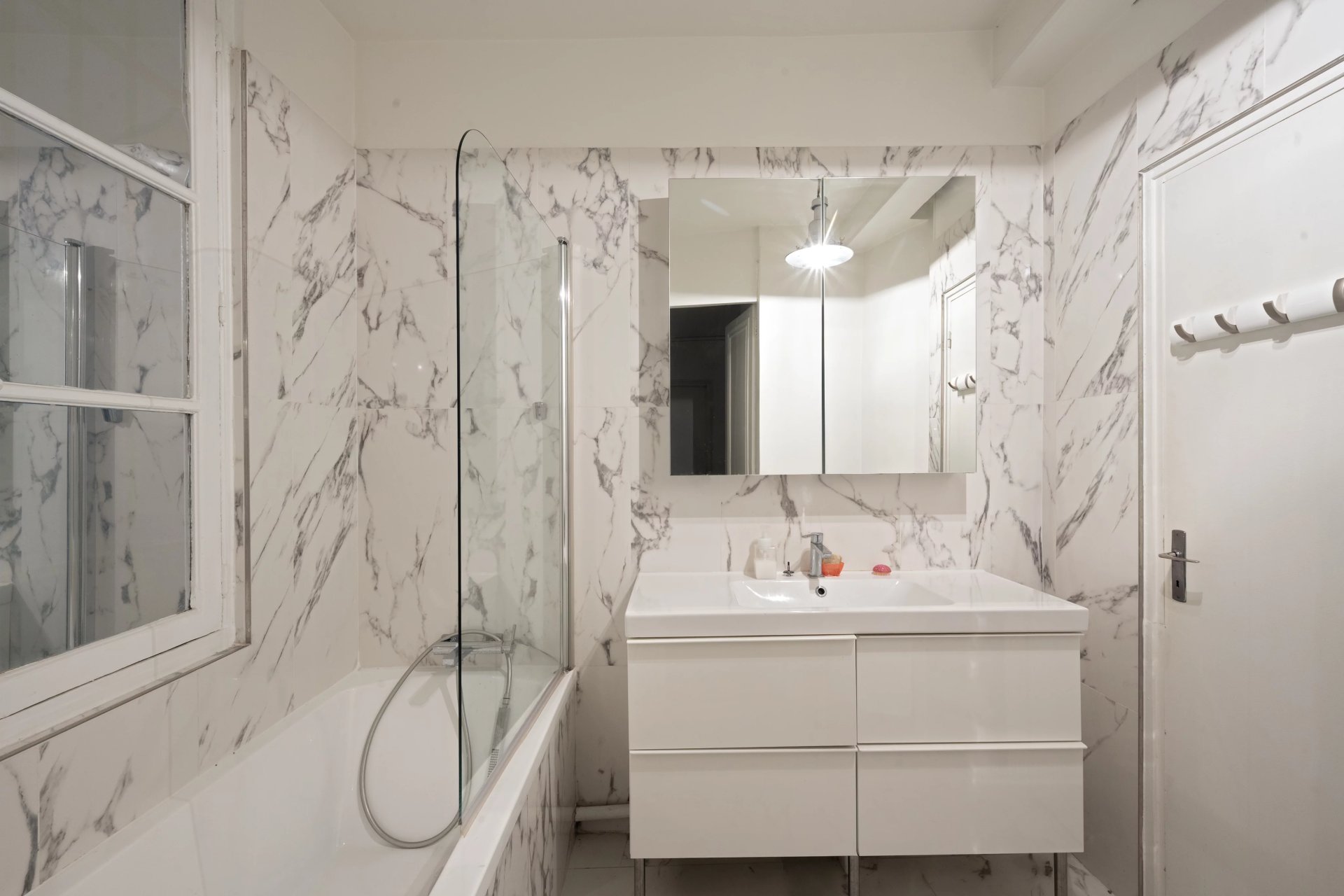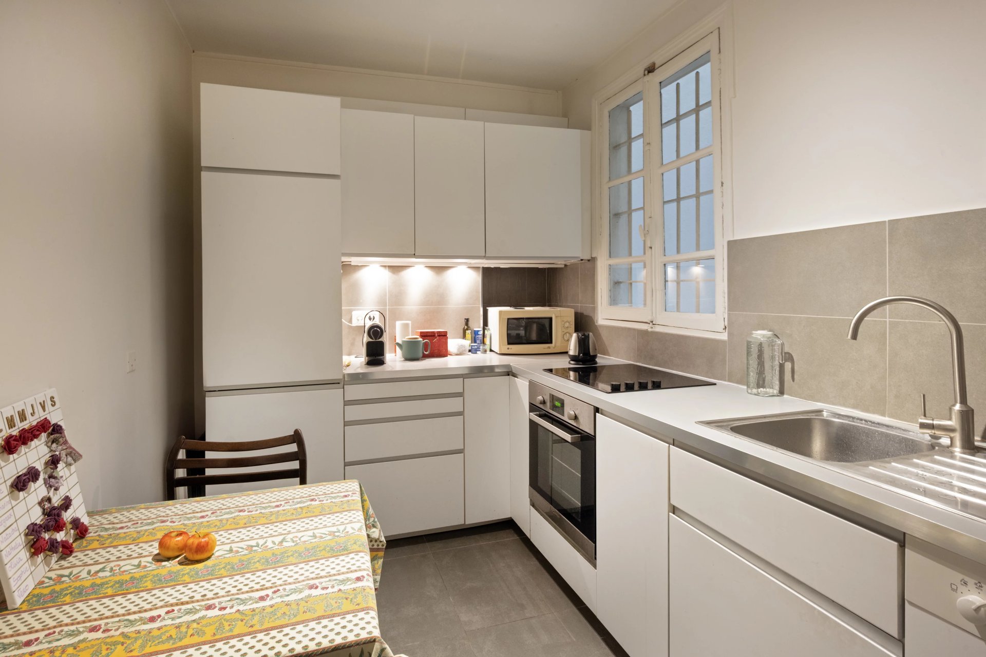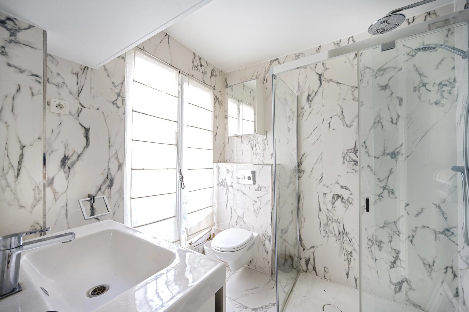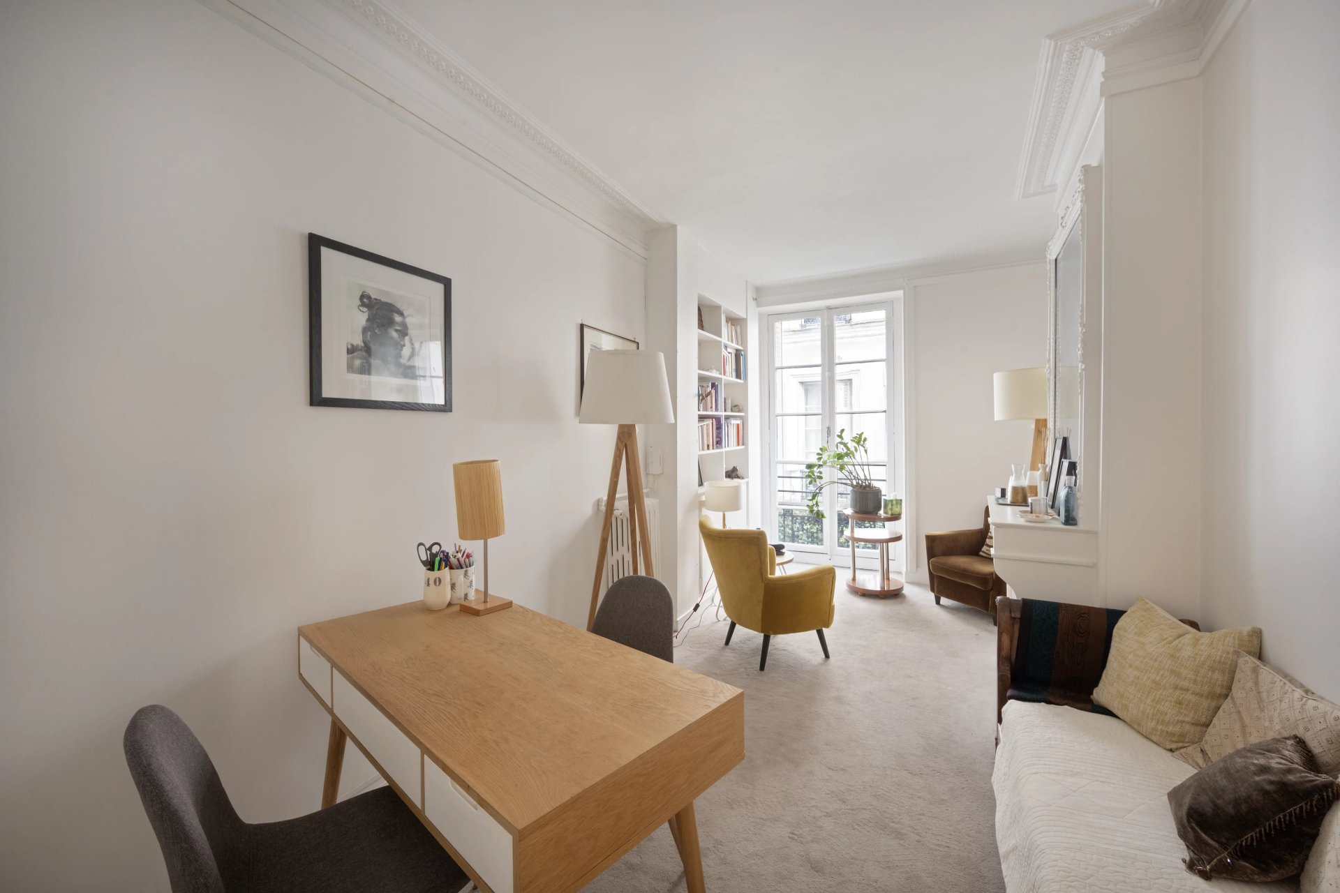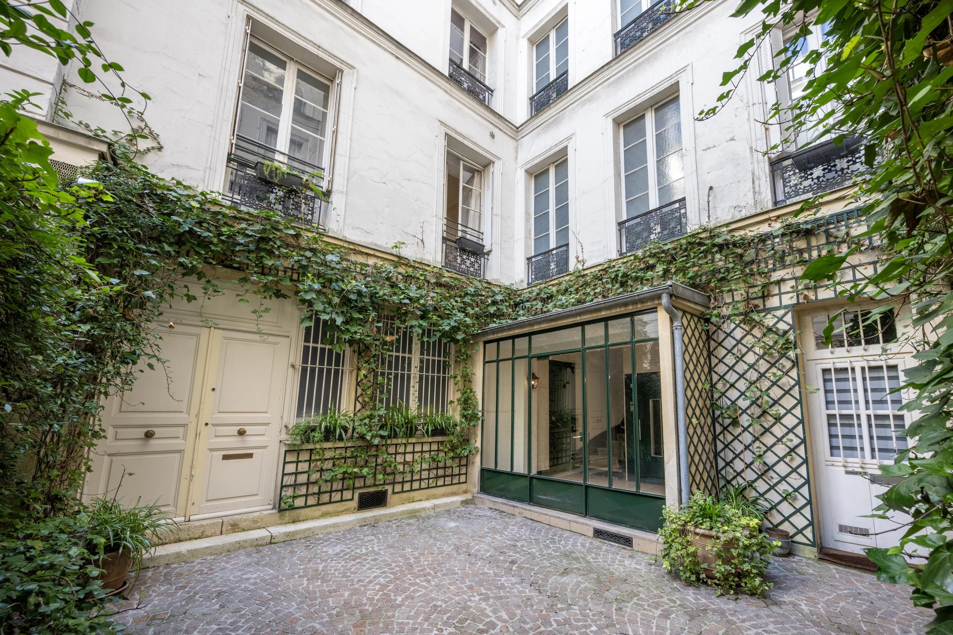 In a building dating from 1870 with an elevator, on the 1st floor, apartment overlooking two quiet courtyards, with a surface area of 109 m² (Carrez law) and 113 m² (floor space). It comprises an entrance hall, a living room, a dining room, a kitchen, two bedrooms, a shower room, a bathroom, a laundry room, and a separate toilet.