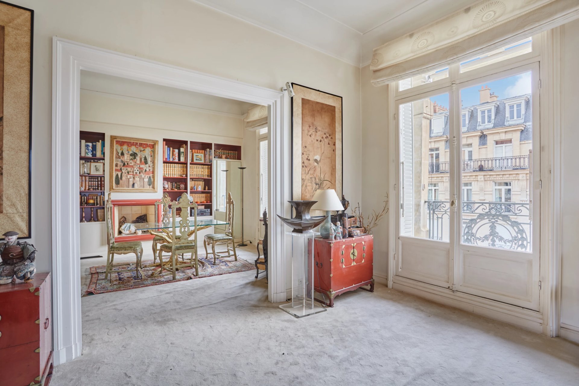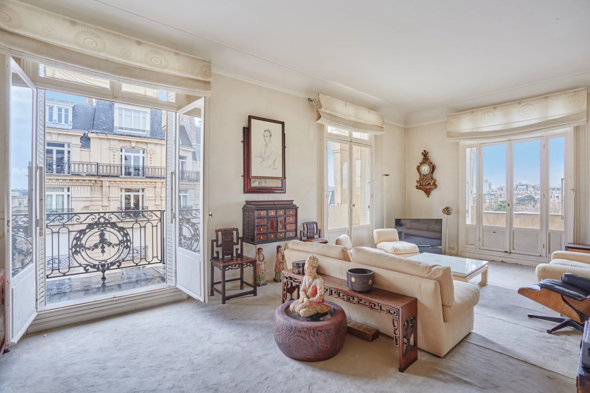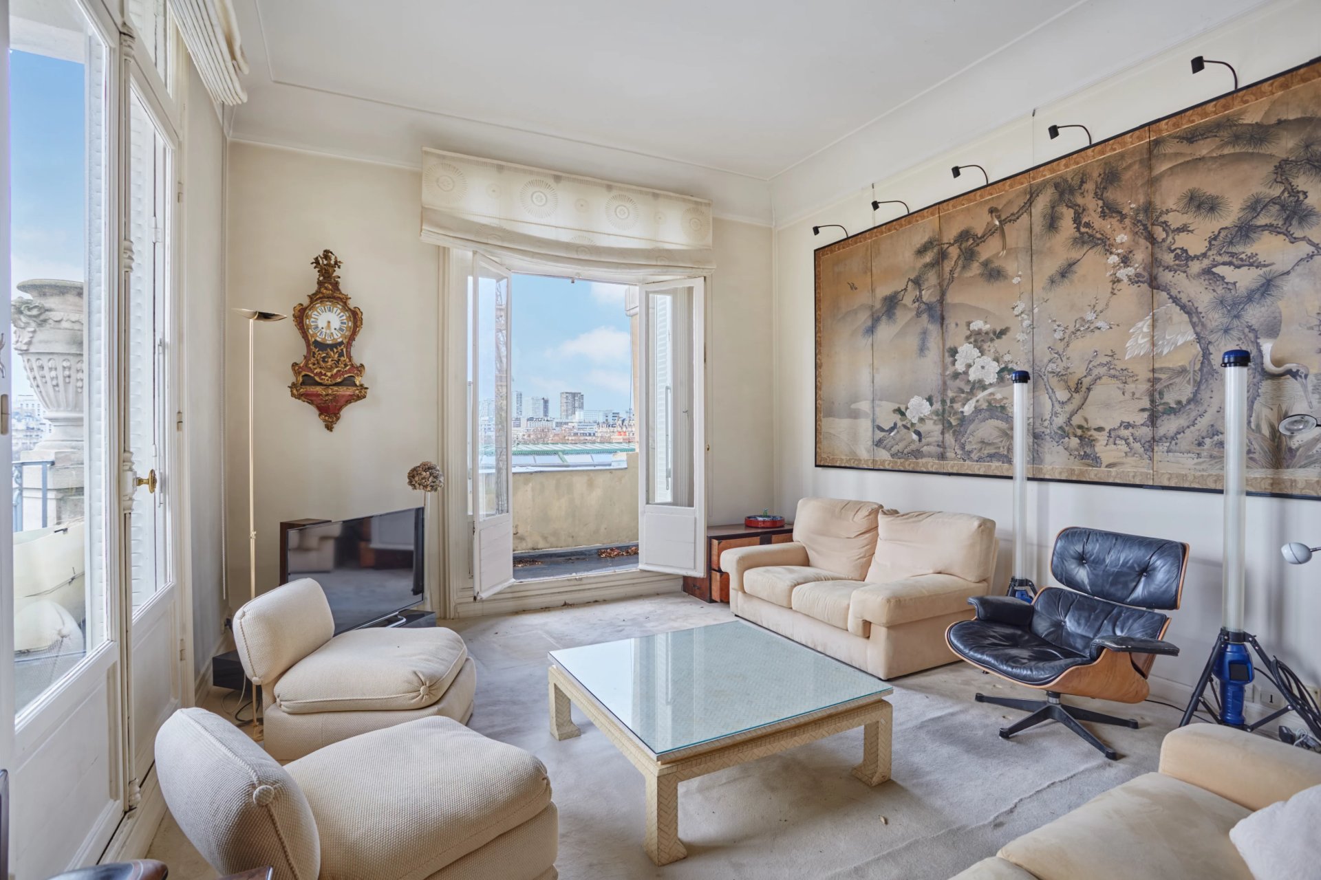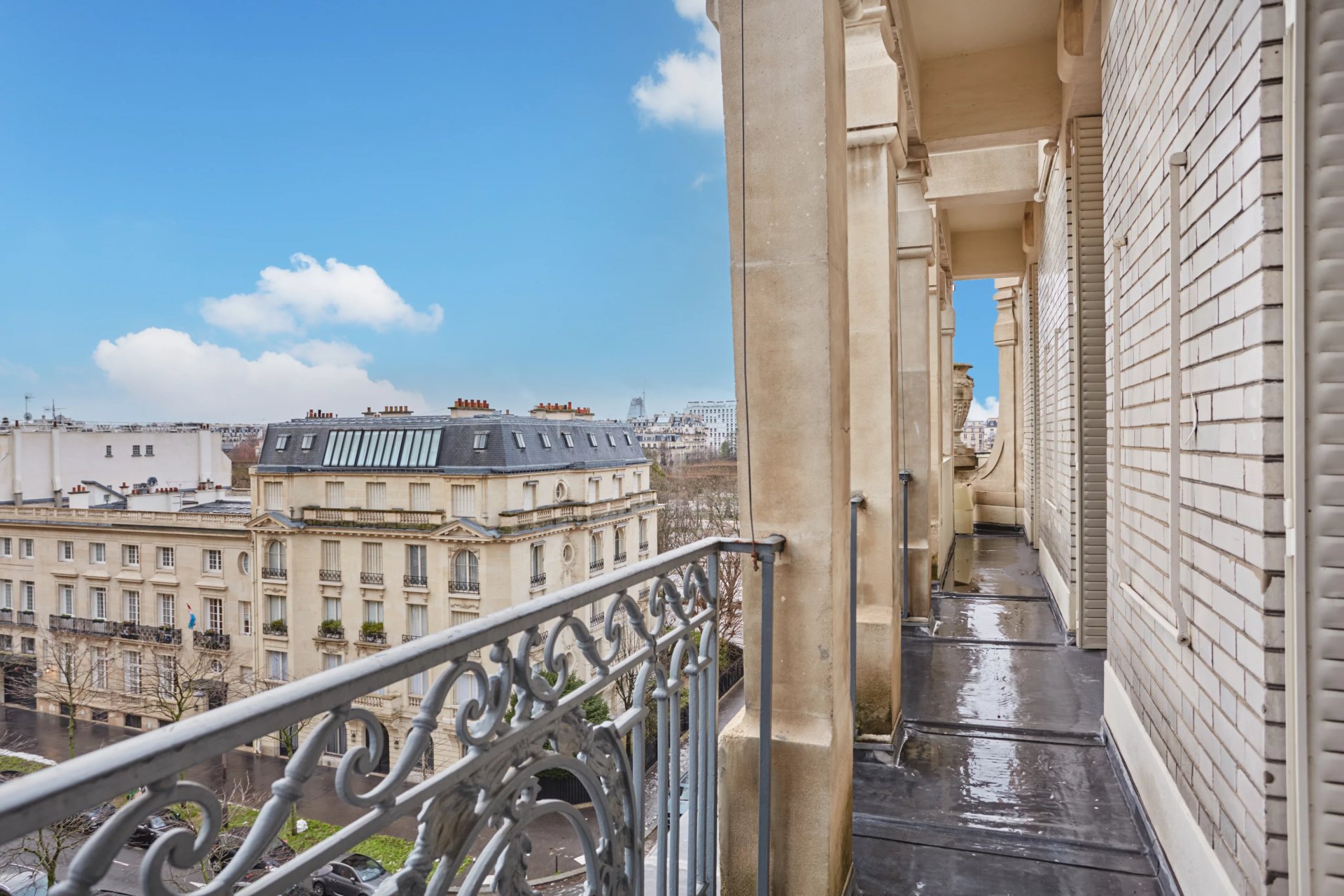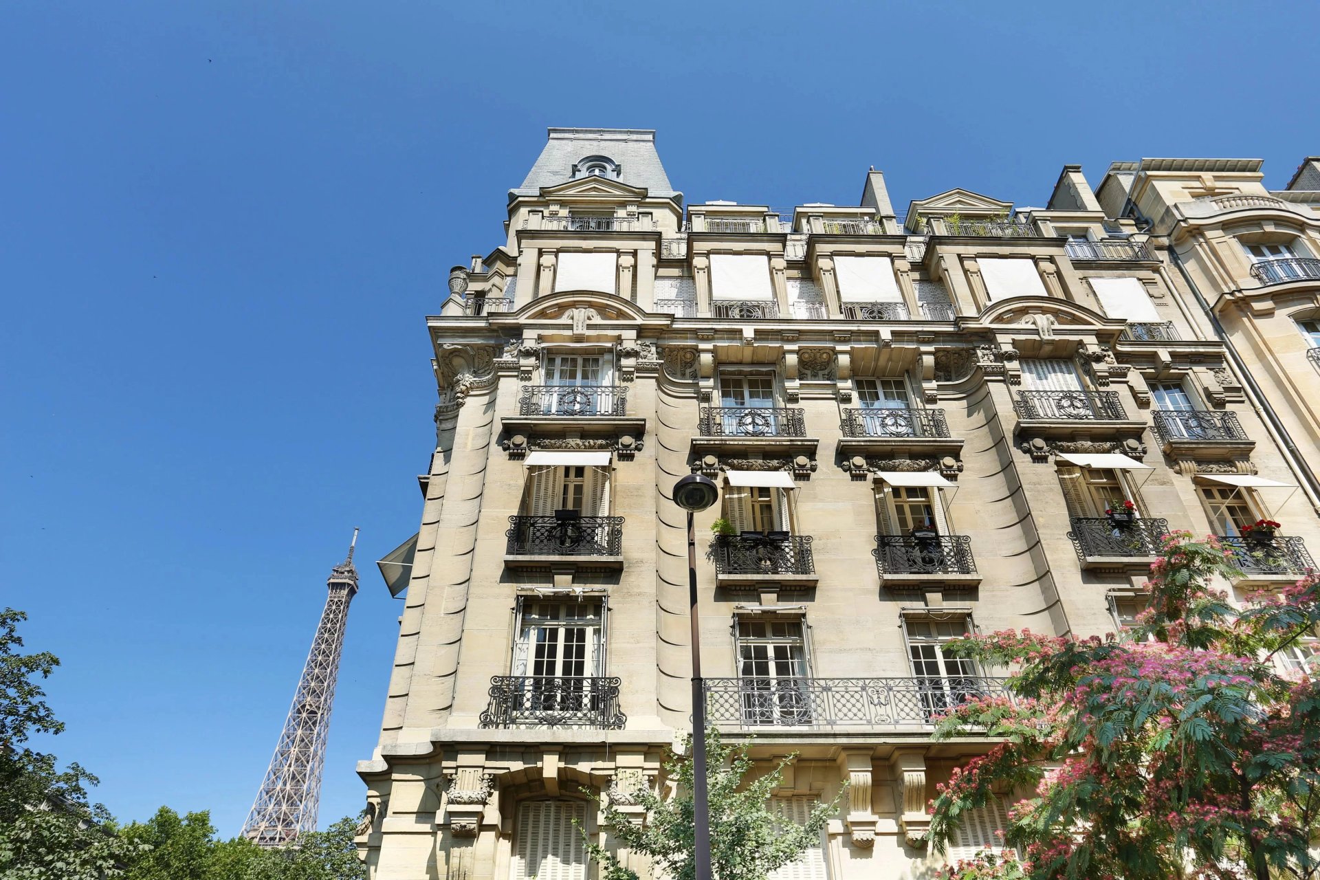 An entrance hall leads to a magnificent corner living/reception room opening onto a wide balcony enjoying an exceptional view of the Eiffel Tower, a dining room, a kitchen with dining facilities, a master suite with a bathroom, a bedroom with a shower room overlooking a courtyard, a dressing room and a separate wc.