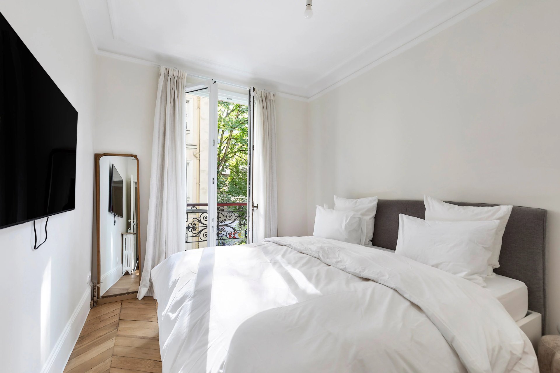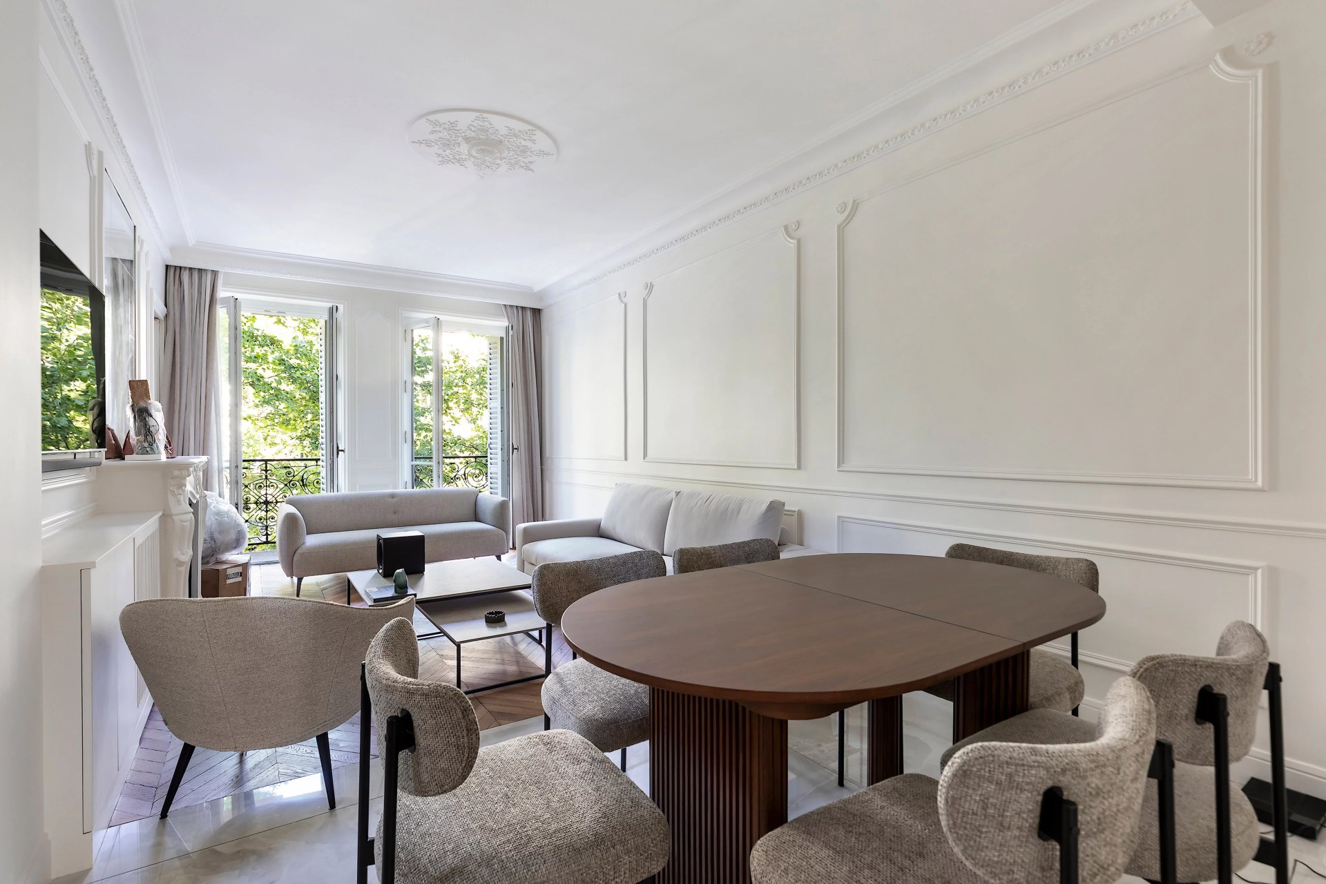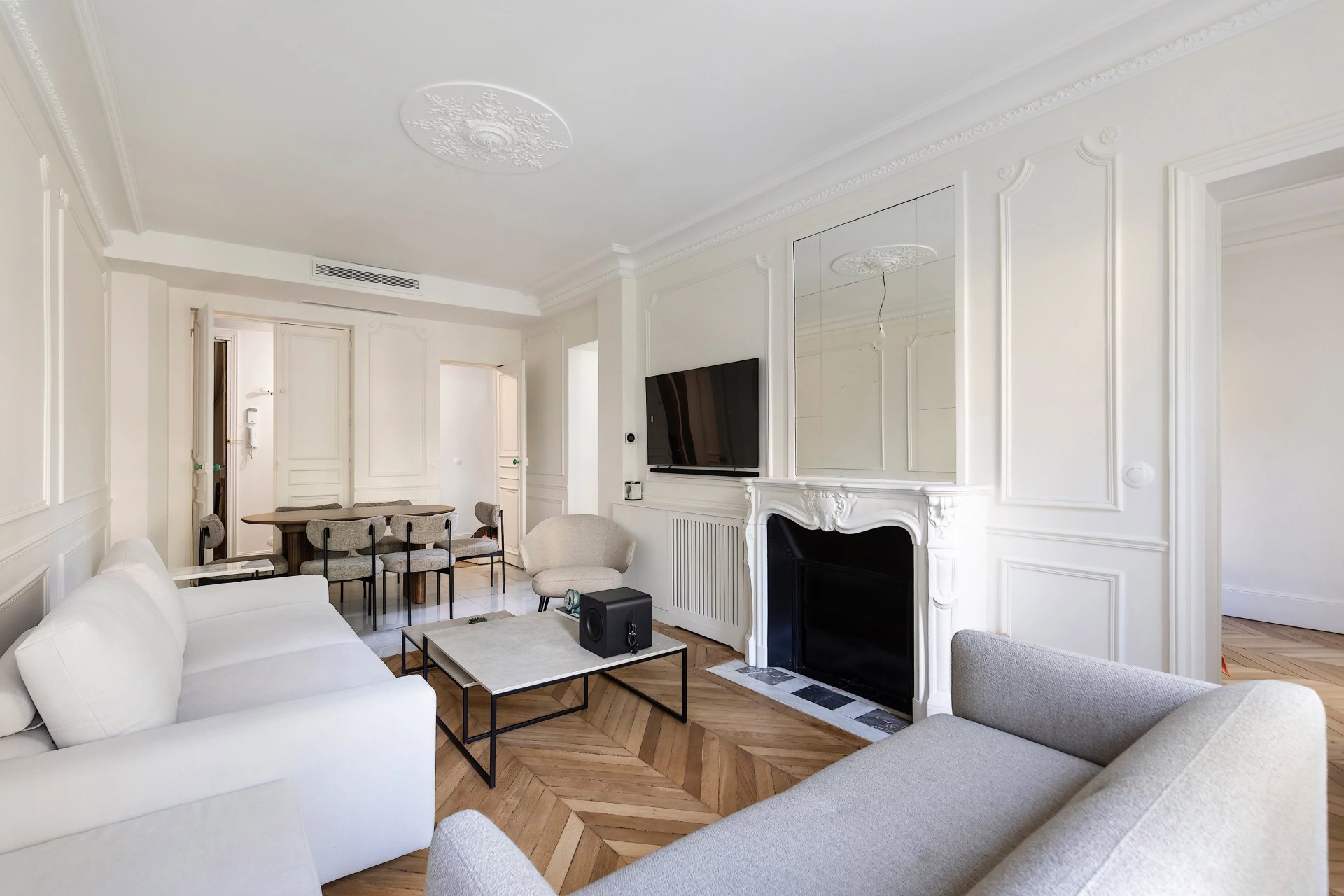 Period features include parquet flooring and mouldings.