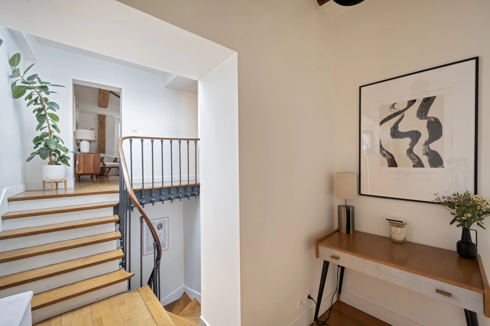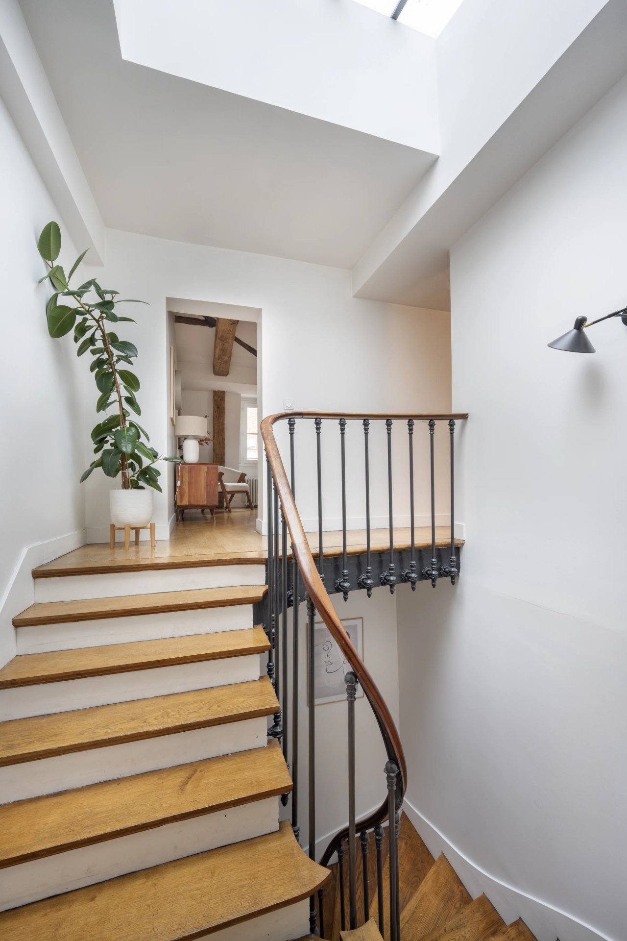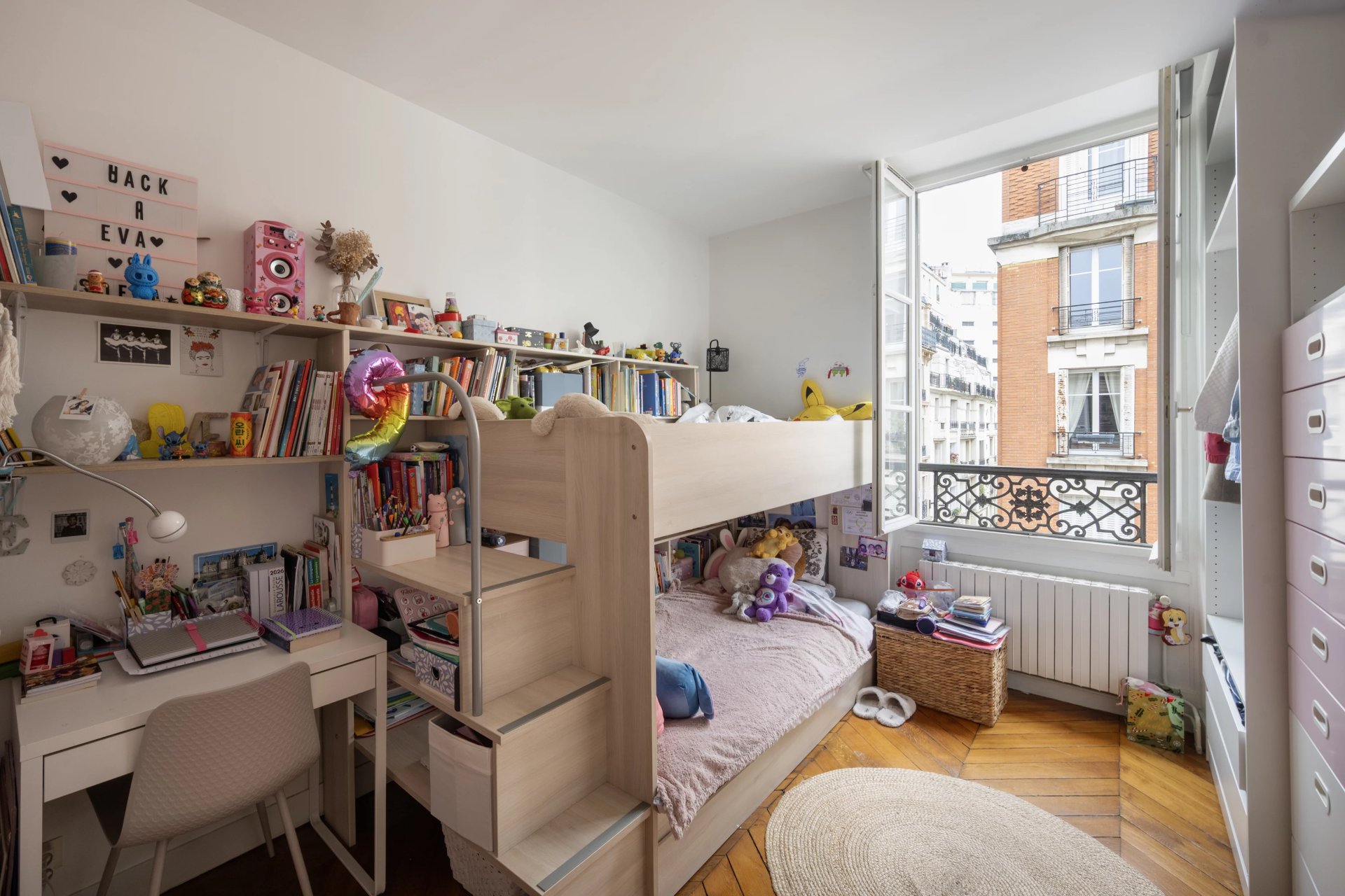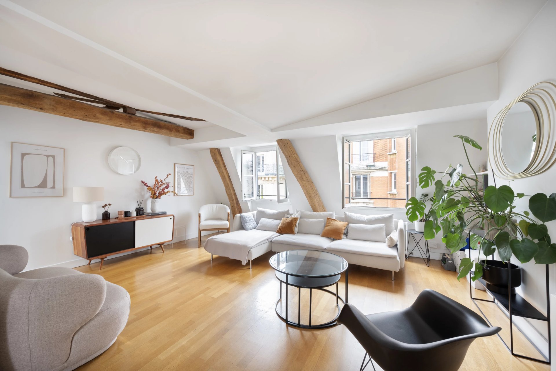 Chaptal neighbourhood. This bright 5-room duplex apartment offering 109 sqm of living space as defined by the Carrez Law is on the top two floors of a recently renovated late 19th century building with a lift. In very good condition, it includes a spacious dual-aspect living/reception room set between the street and a courtyard and enjoying a view of a private mansion, a separate kitchen and a guest wc. The lower floor comprises three bedrooms including a master suite with a shower room, a bathroom and a separate wc.
