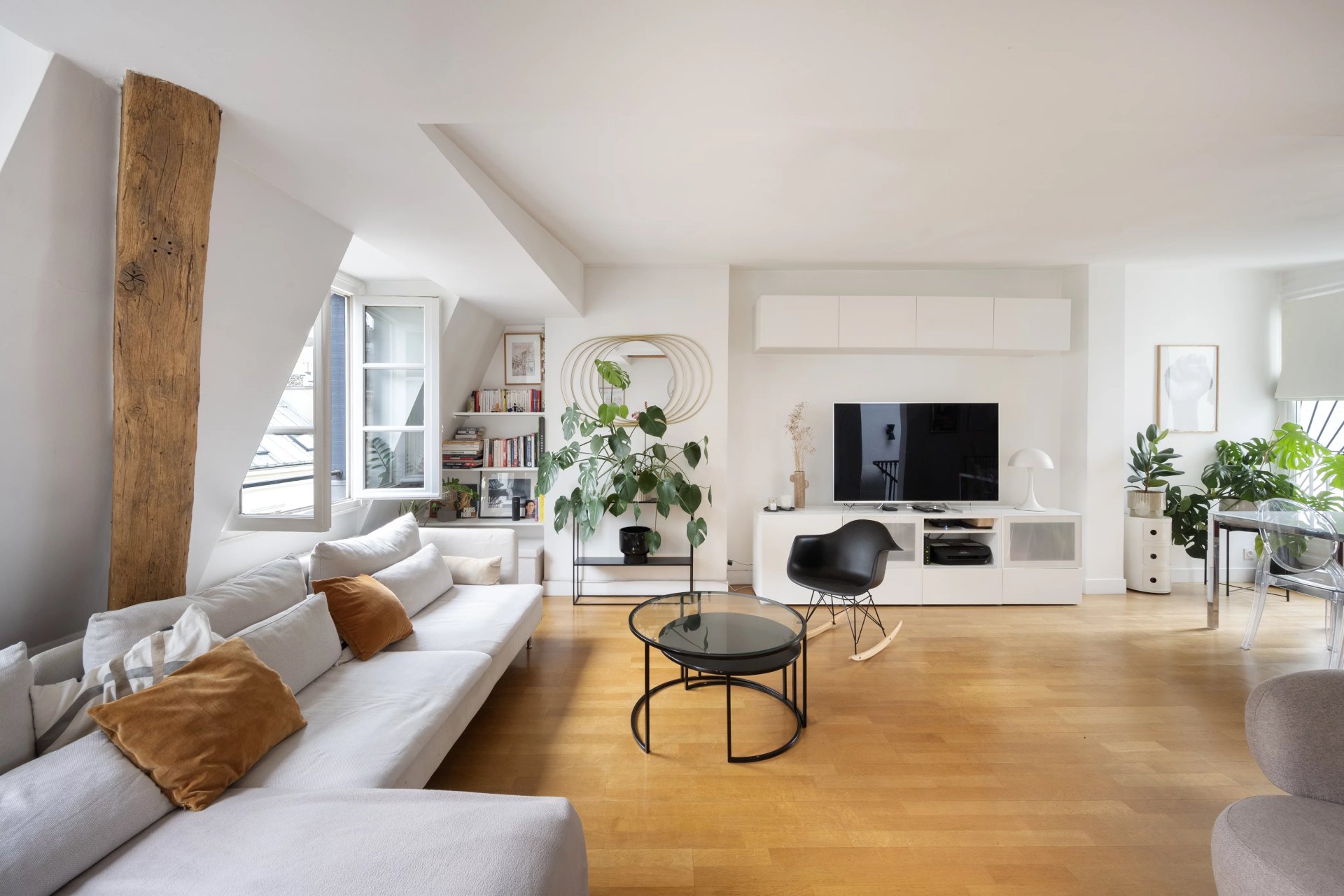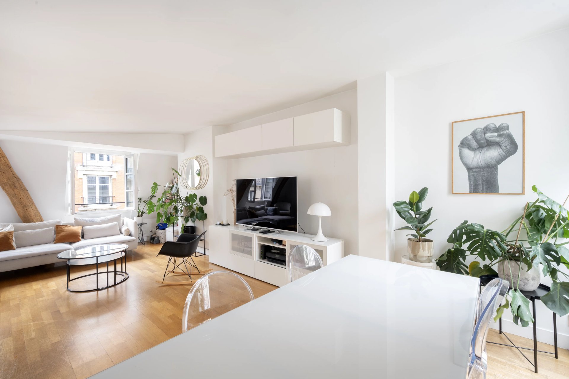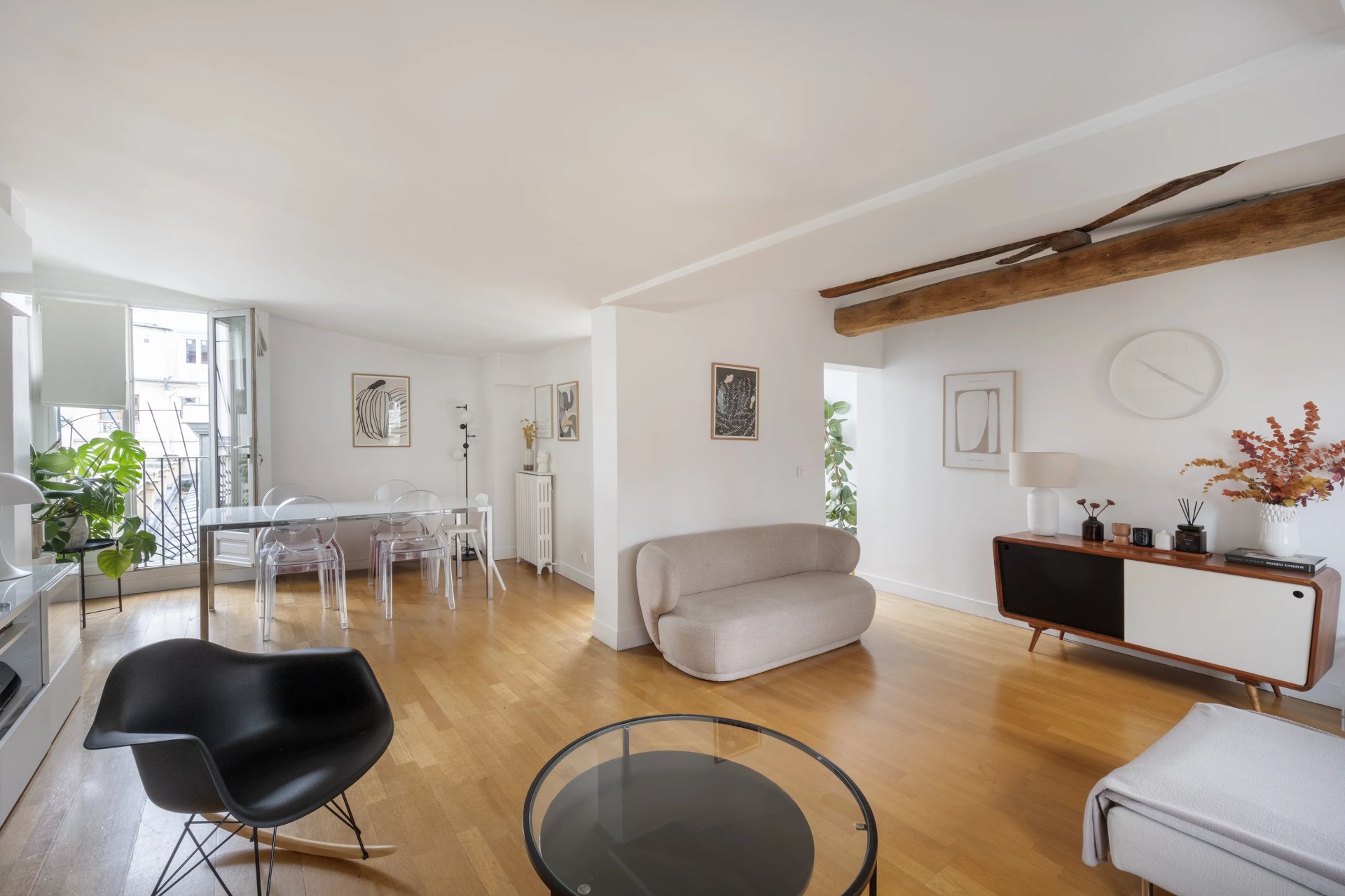Chaptal neighbourhood. This bright 5-room duplex apartment offering 109 sqm of living space as defined by the Carrez Law is on the top two floors of a recently renovated late 19th century building with a lift. In very good condition, it includes a spacious dual-aspect living/reception room set between the street and a courtyard and enjoying a view of a private mansion, a separate kitchen and a guest wc. The lower floor comprises three bedrooms including a master suite with a shower room, a bathroom and a separate wc.