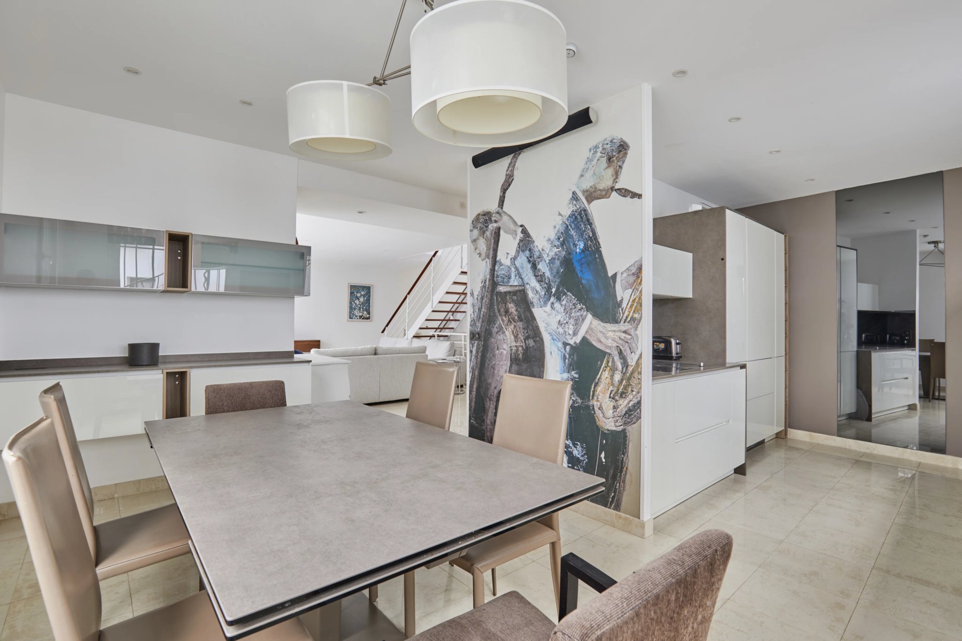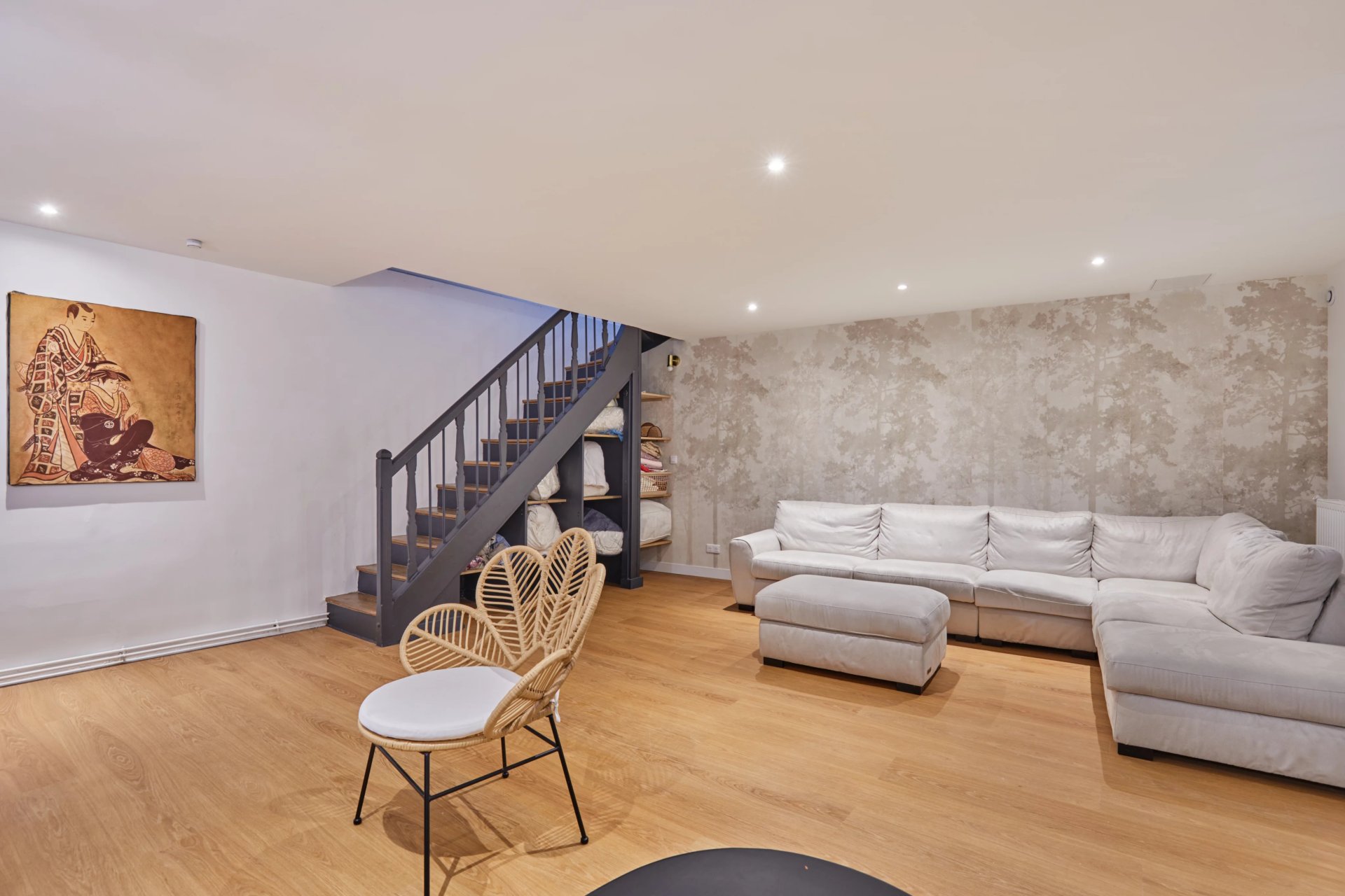 It includes a spacious living/reception room with a kitchen and dining room opening onto a patio, a master suite with a bathroom, two bedrooms and a shower room. A TV lounge/library, a bedroom, a shower room, a utility room and two storage rooms are in the basement.