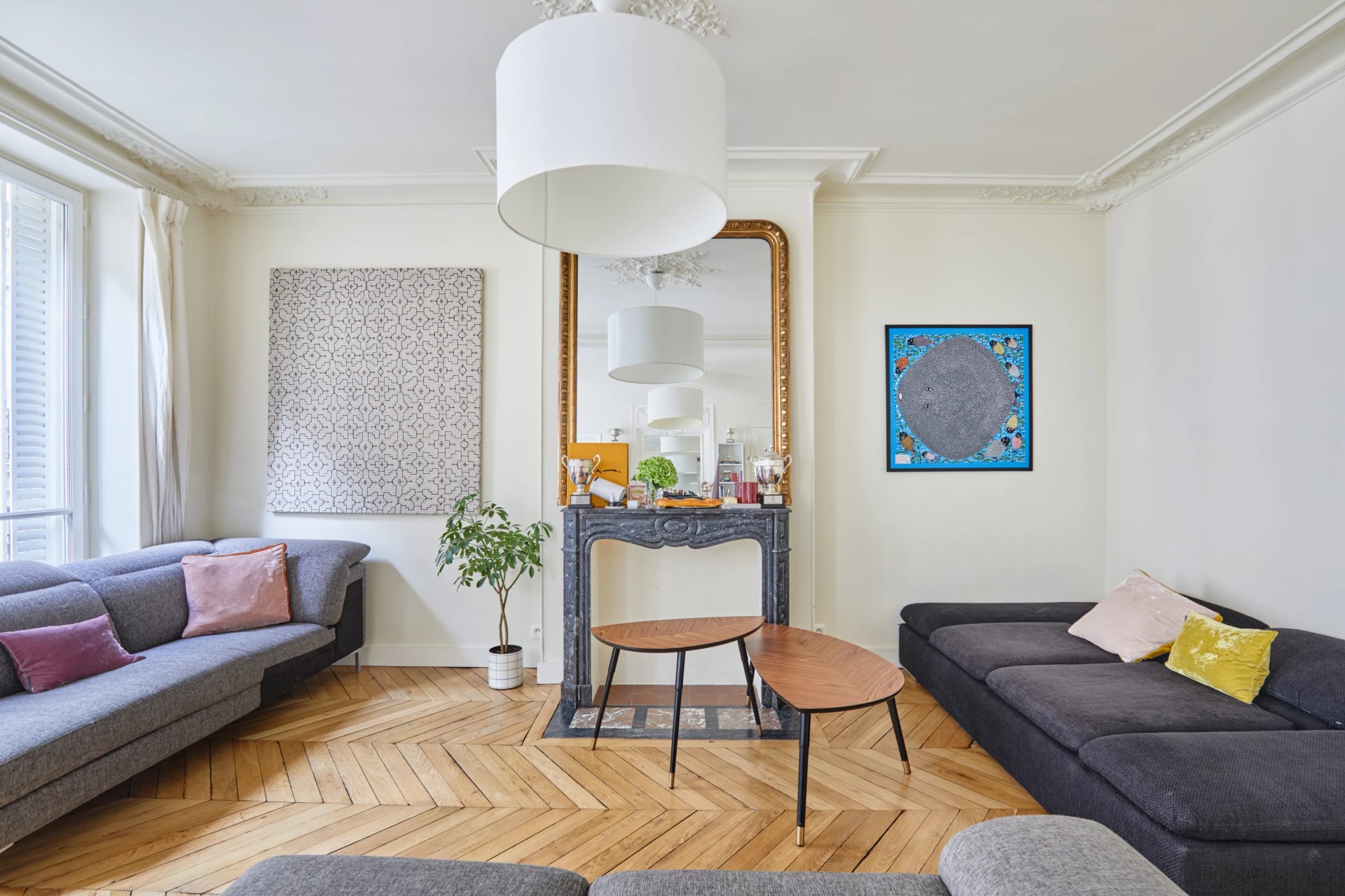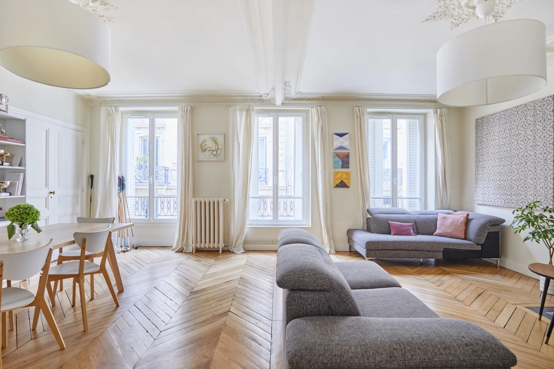 Period features include parquet flooring, high ceilings with mouldings, and fireplaces.