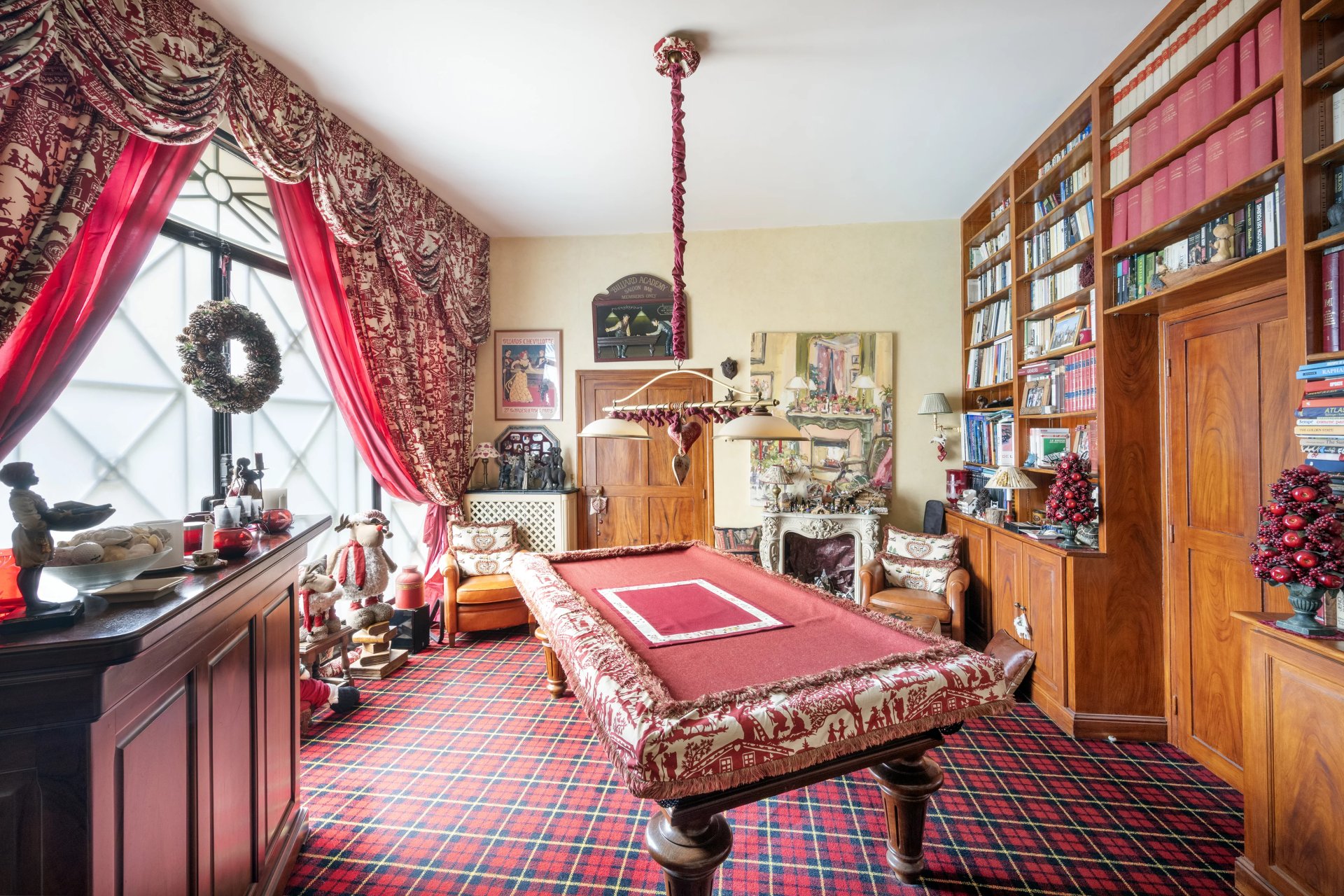 Offering 485 sqm of dual-aspect living space, it includes an entrance hall, a spacious family kitchen with dining facilities opening onto the terrace and garden, a utility room, a boiler room, a staff studio apartment benefiting from independent access, and a billiard room.