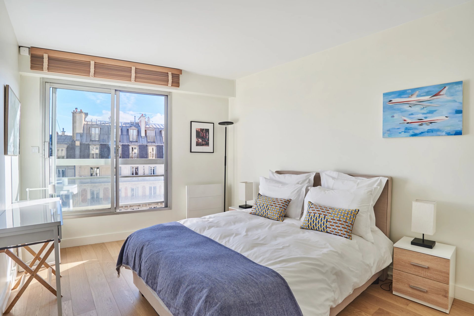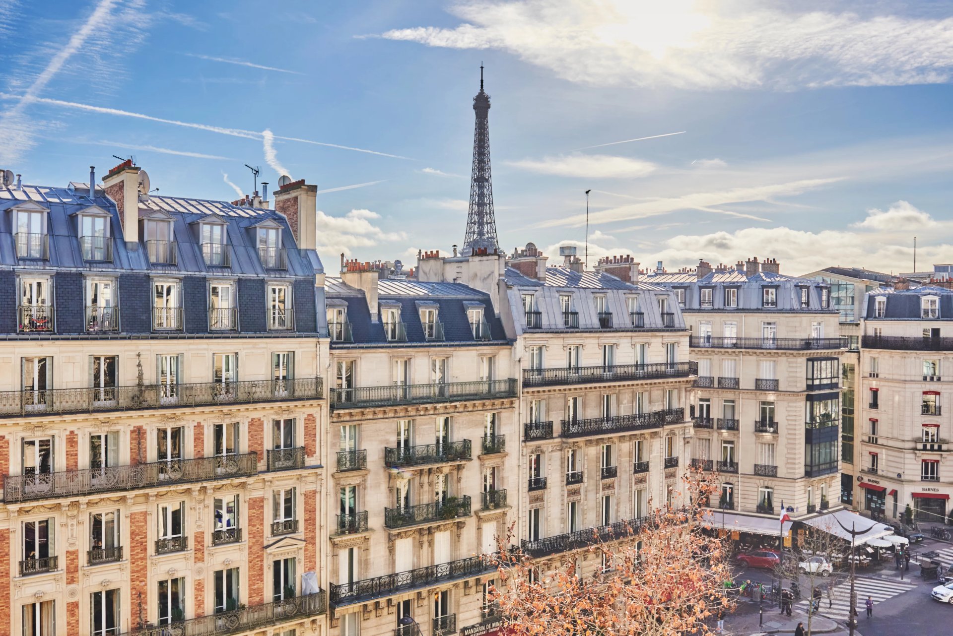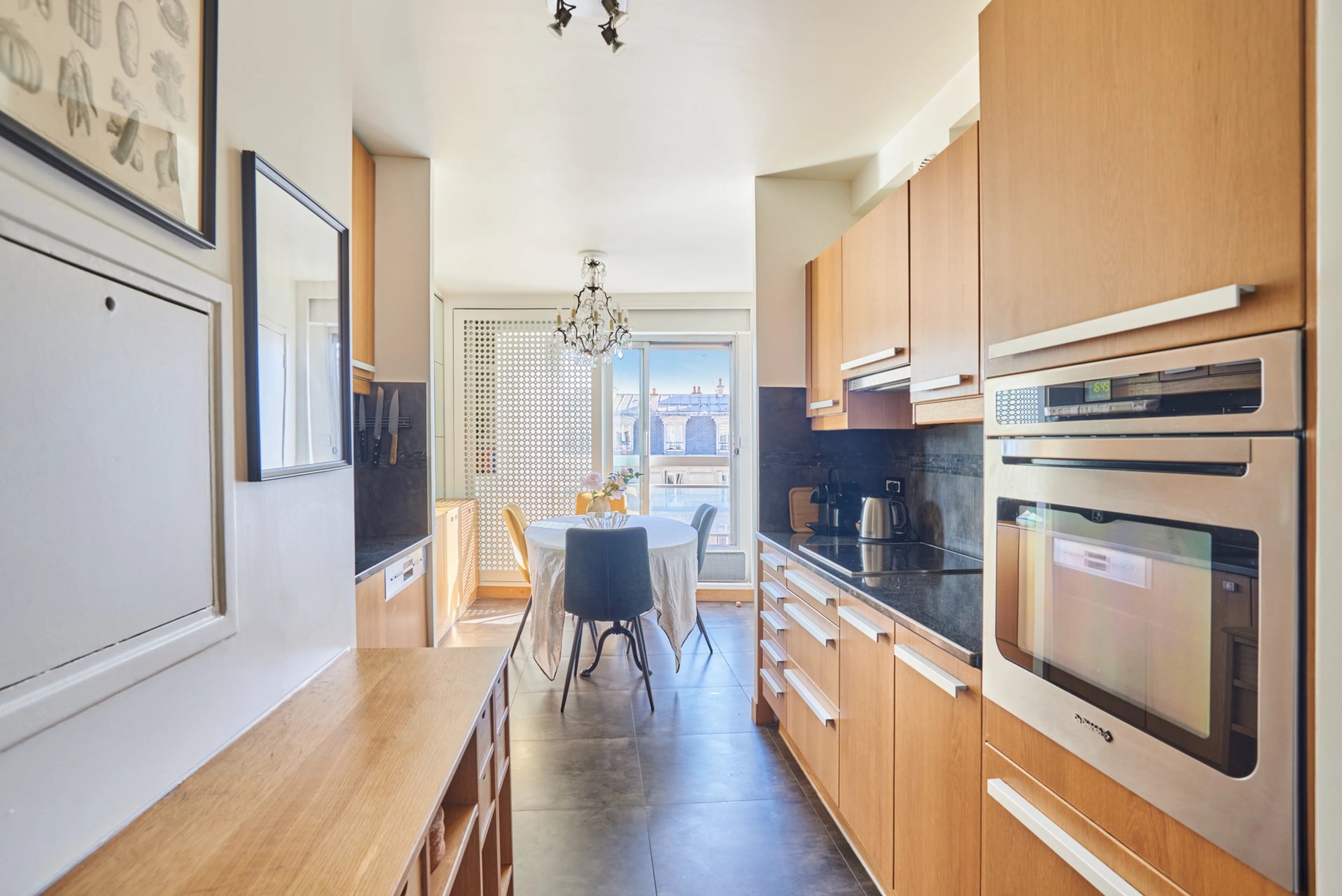 Place du Trocadéro. This air-conditioned apartment benefiting from an excellent floor plan is on the 7th floor of a relatively recent building with a lift. East and west facing and enjoying a view of the Eiffel Tower, it offers 107 sqm of living space as defined by the Carrez Law including a double living/reception room, a semi open-plan kitchen with dining facilities, and two suites.