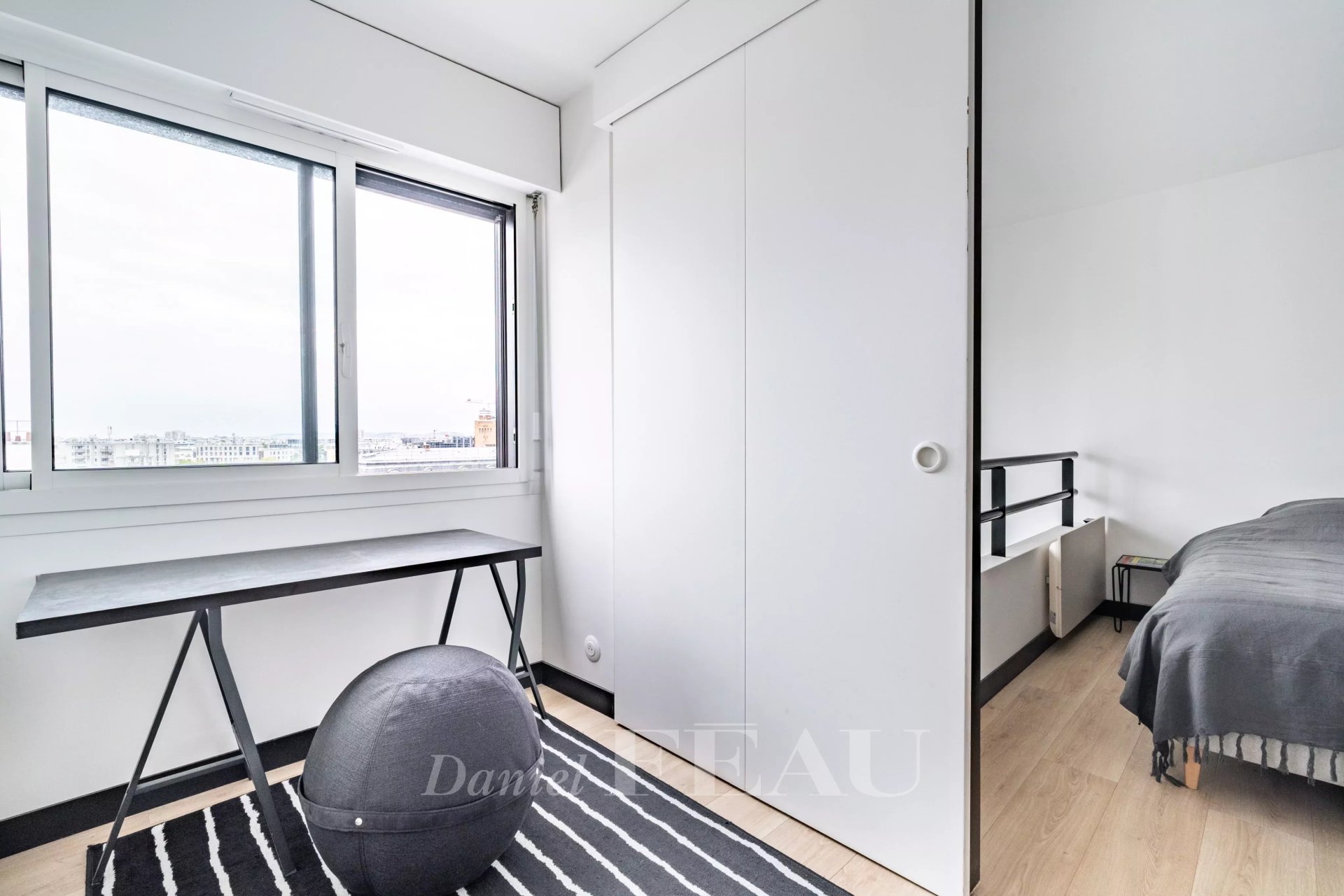 Enjoying an open view, it includes a living room featuring a 5-metre high ceiling, an equipped semi open-plan kitchen, and a shower room with a wc. Upstairs are a mezzanine bedroom, a study or single bedroom, a bathroom/wc, and a fitted walk-in wardrobe.