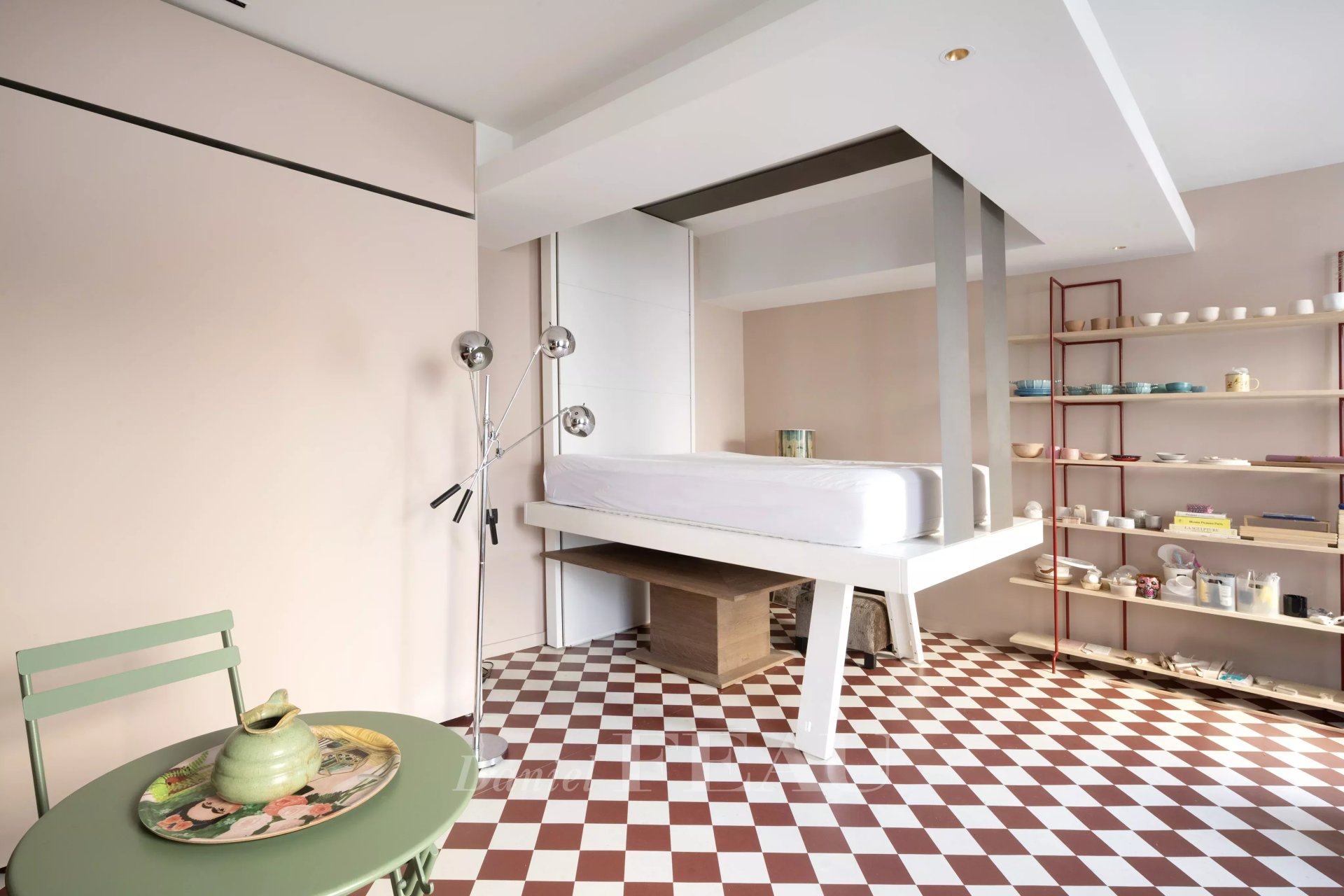 L'agencement, particulièrement soigné, comprend une pièce de vie avec cuisine ouverte entièrement équipée, un espace nuit ingénieusement optimisé grâce à un lit escamotable descendant du plafond, ainsi qu'une salle d'eau contemporaine avec toilettes.