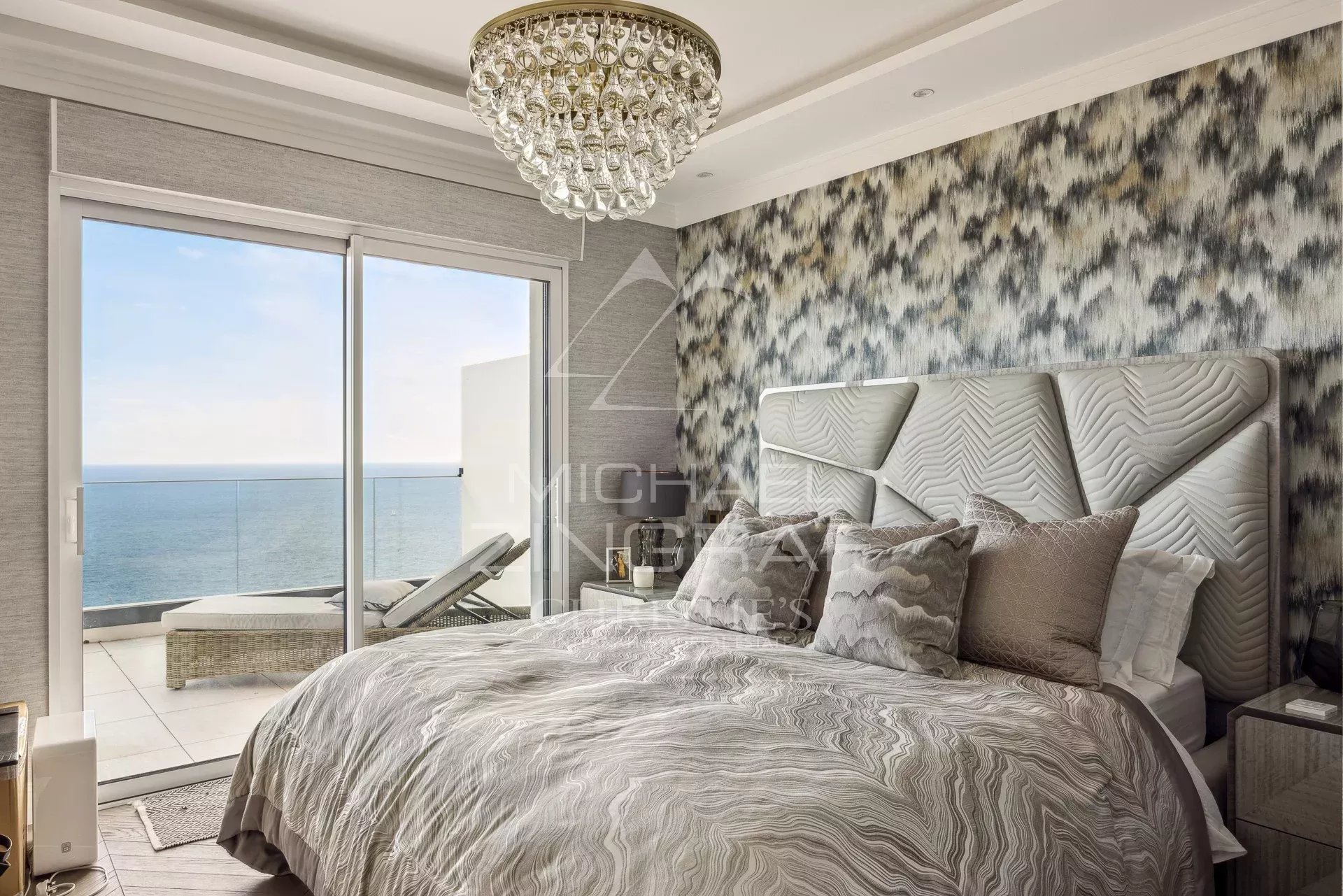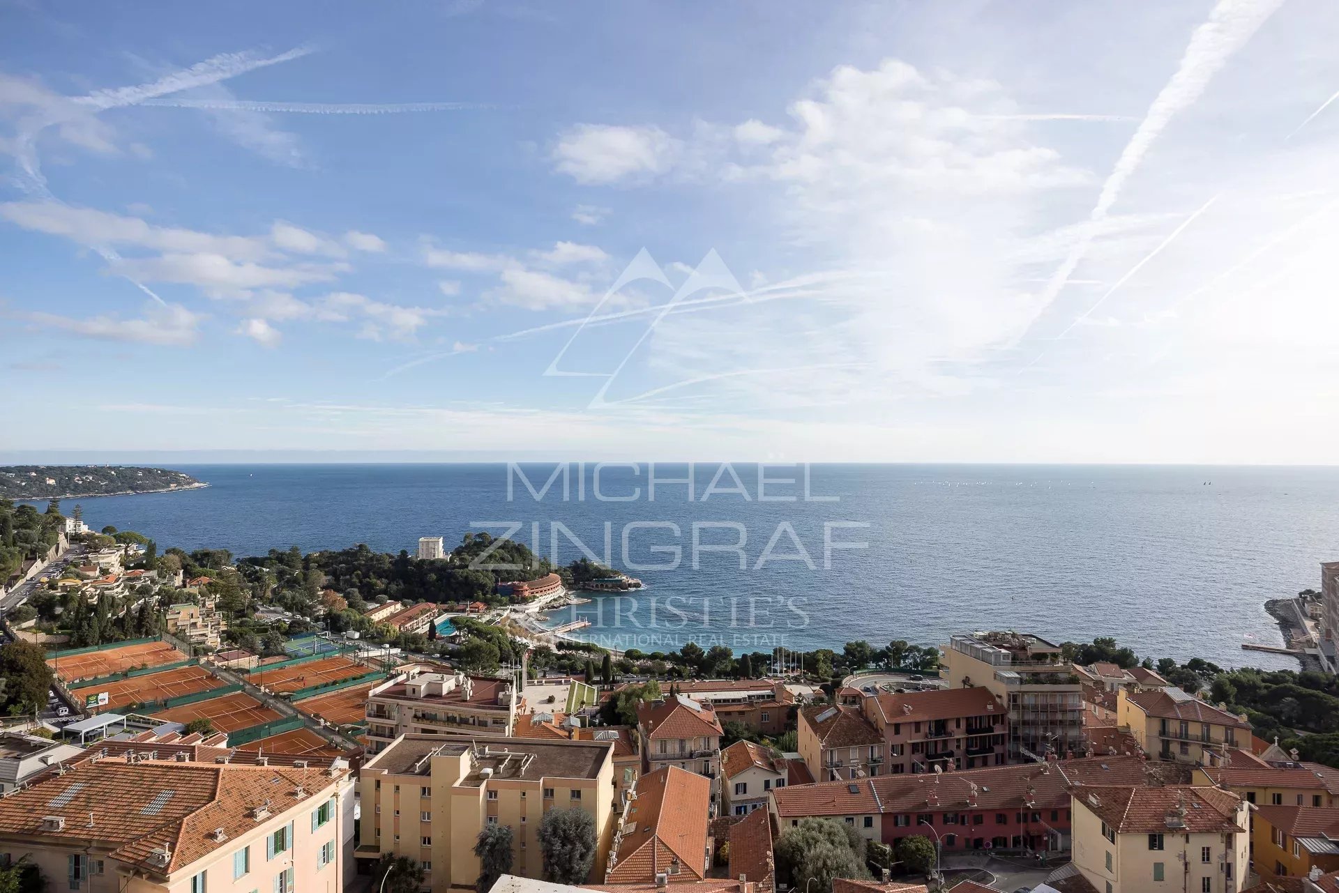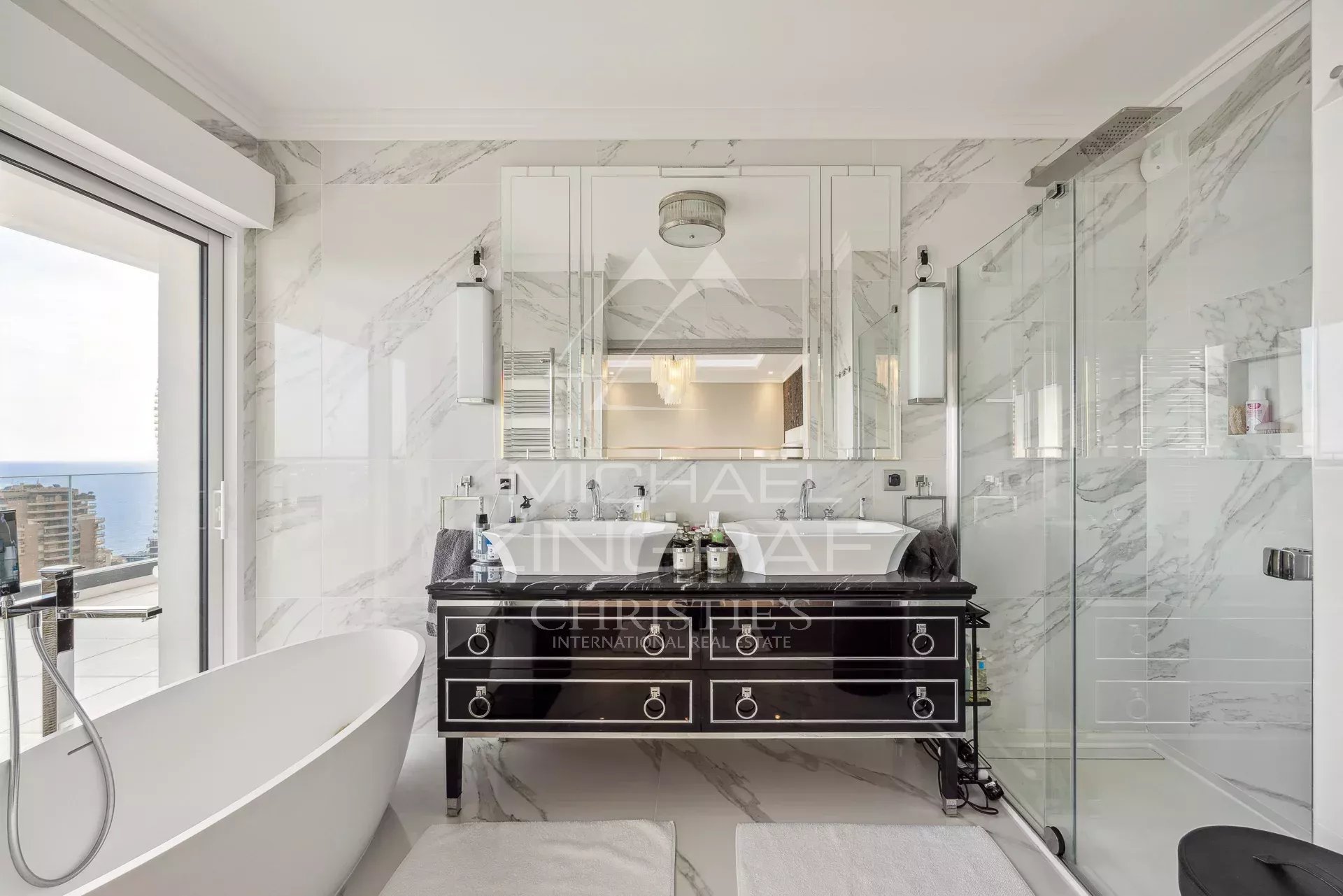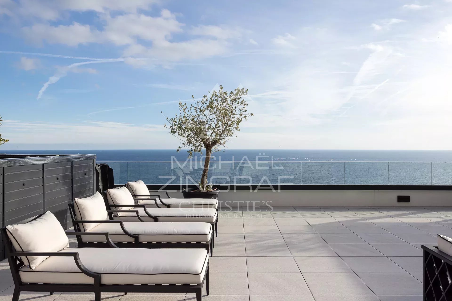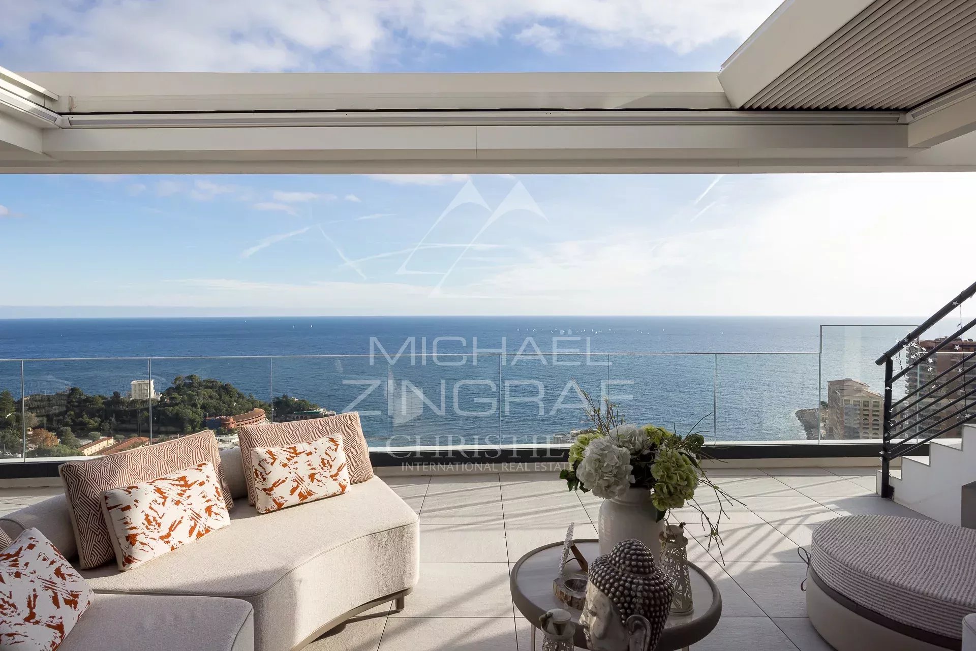 This sublime 209 m2 flat, with a 320 sqm roof terrace solarium, garden and very large jacuzzi, comprises a bright living room, reception room and lounge opening onto a large terrace with exceptional views of the sea and Monaco, and a fully fitted and tastefully decorated kitchen. The sleeping area comprises three bedrooms, two of which open onto the terrace, each with its own bathroom/shower.