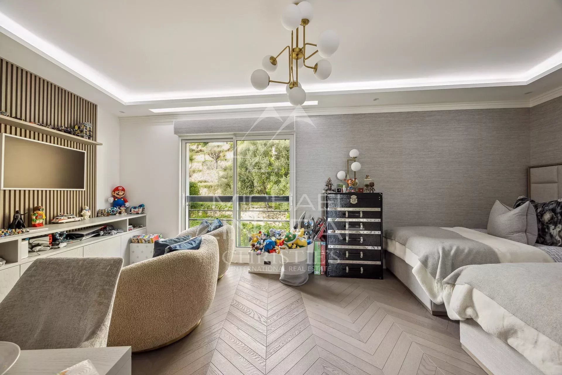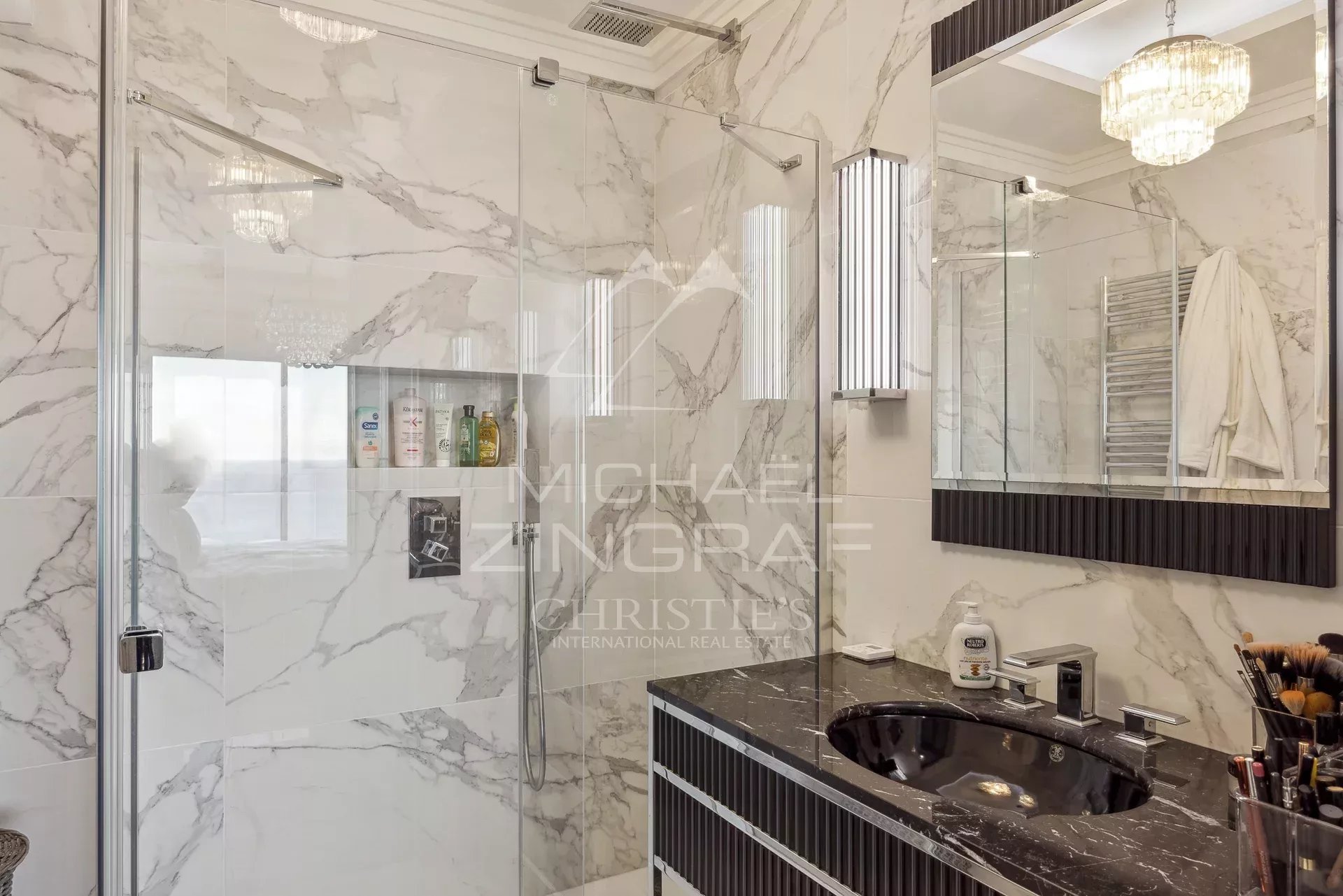 Luxuriously appointed with noble materials, this flat is equipped with reversible air conditioning, electric shutters and two garages under the grounds.