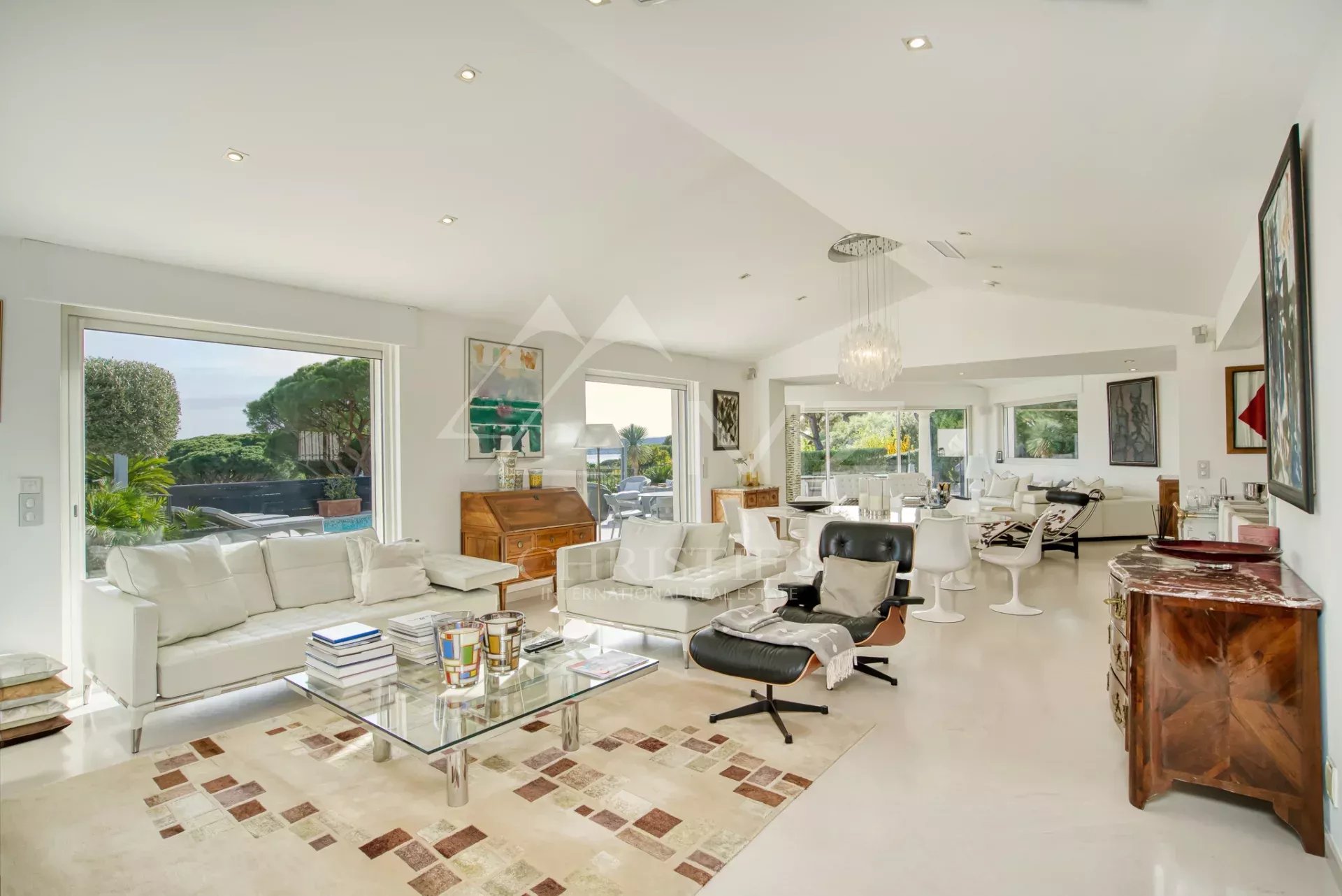 The spacious, sun-drenched living room opens onto terraces facing the sea, inviting both conviviality and contemplation.