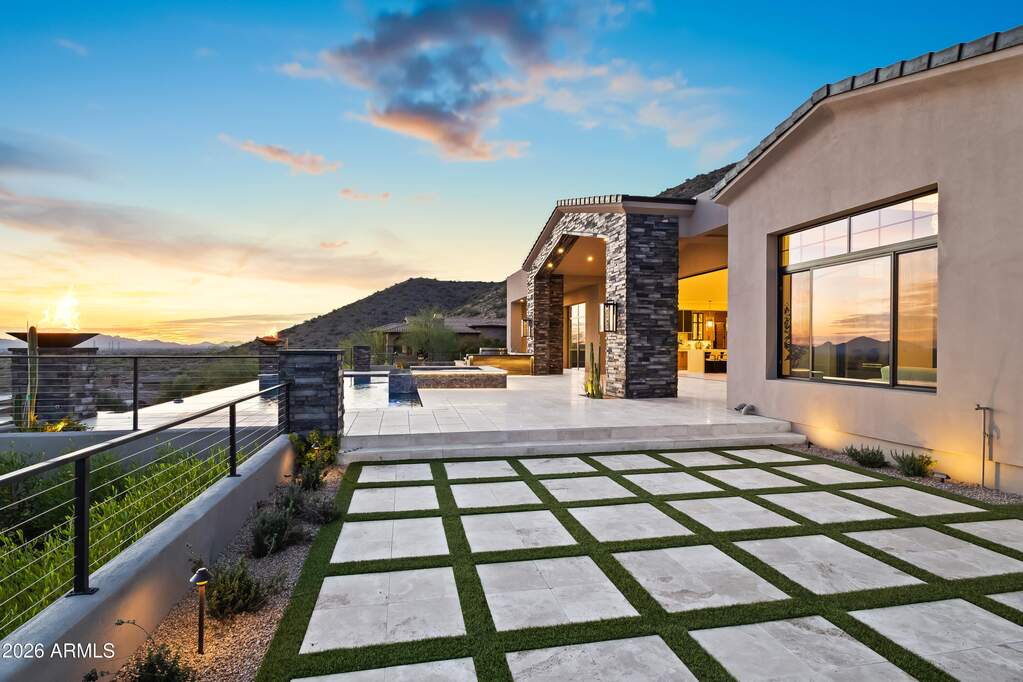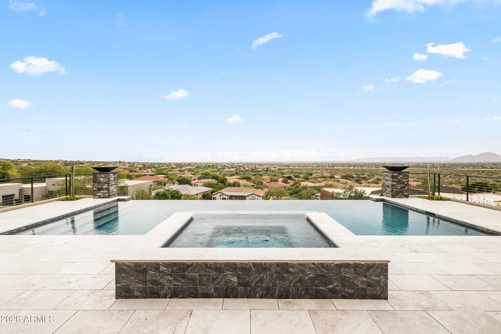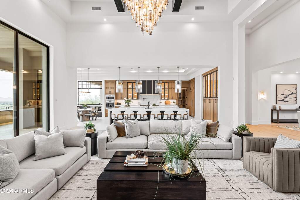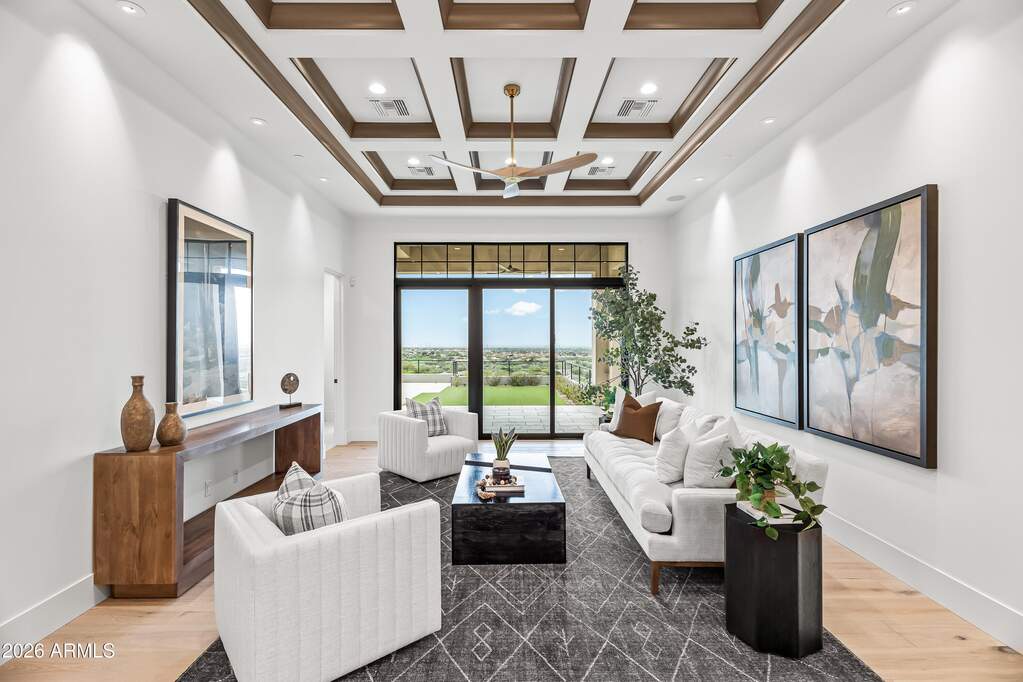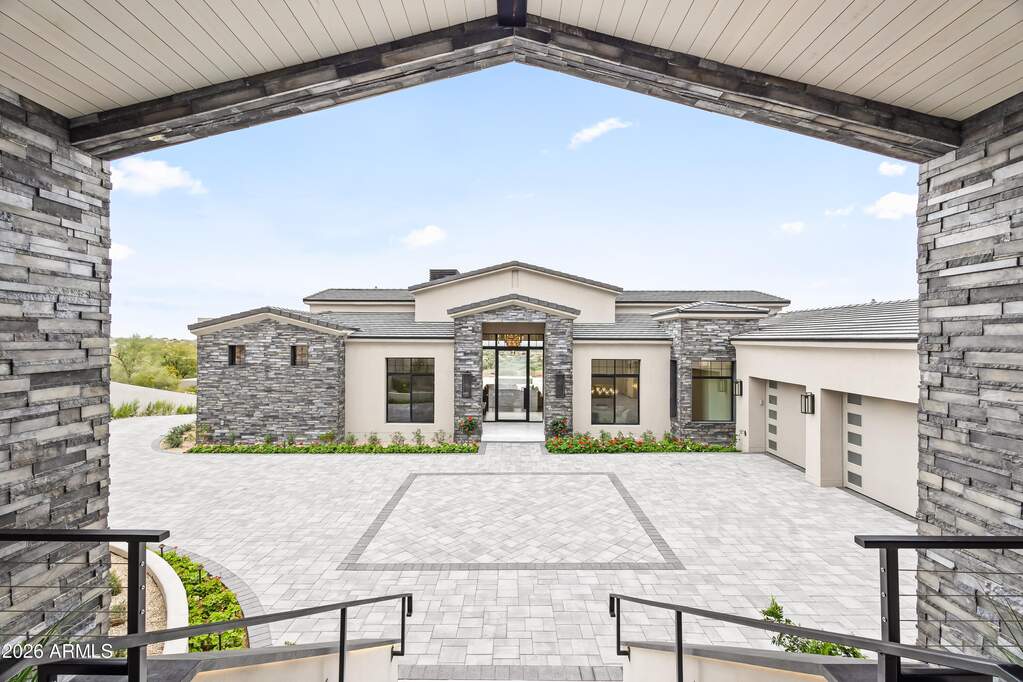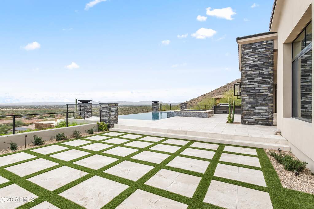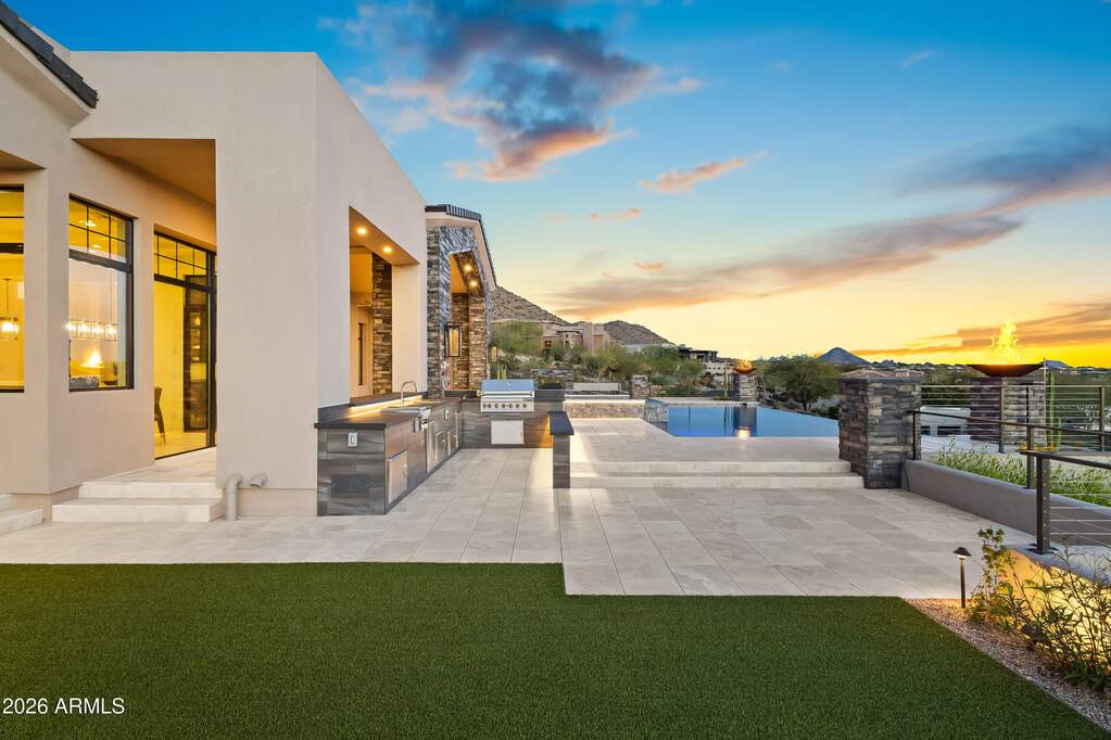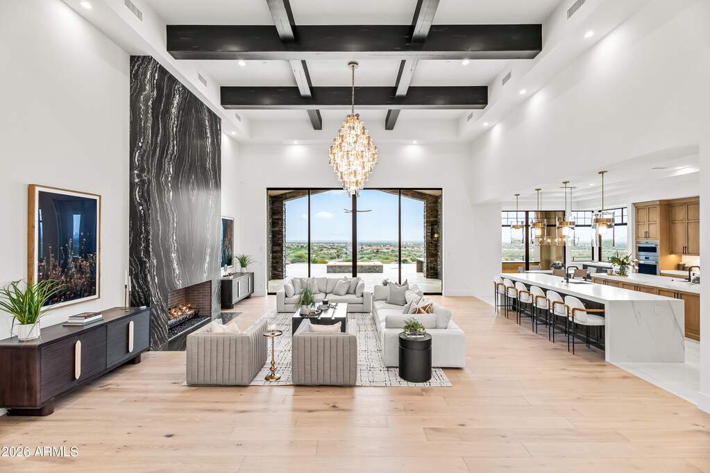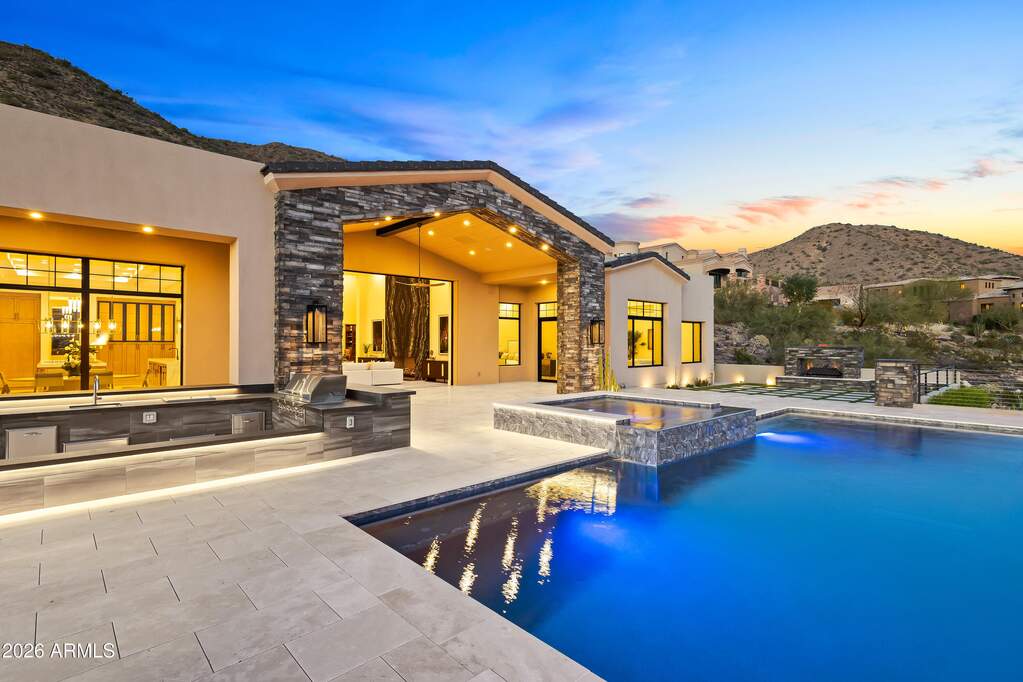 Perched high above Ancala Country Club, this south-facing architectural masterpiece captures sweeping panoramic views of the city skyline, Camelback Mountain, and the surrounding Sonoran Desert. Privately situated within one of North Scottsdale's premier gated communities, this modern transitional estate blends refined design with resort-style living. Set on approximately 1.55 acres, this expansive single-level new build offers 4 ensuite bedrooms and 6 bathrooms in the main residence, along with a detached 1-bedroom, 1-bath guest casita complete with kitchenette and living area. A grand entry leads to soaring ceilings and an open-concept great room featuring a wall of sliding glass doors, floor-to-ceiling gas fireplace, white oak flooring, wood-paneled ceiling, and designer lighting. The chef's kitchen is designed for both entertaining and everyday living, offering dual islands, custom floor-to-ceiling cabinetry, walk-in pantry, formal dining room, breakfast nook, and additional eat-in seating. The primary suite enjoys stunning city-light views and includes a private sitting area, direct patio access, and an integrated exercise room. The spa-inspired bath features dual vanities, freestanding soaking tub, oversized walk-in shower, private water closet, and custom walk-in closet. Designed for seamless indoor-outdoor living, the backyard showcases a negative-edge pool, raised spa with dual fire features, dramatic double-sided fireplace, and an expansive bar and BBQ pavilion with two-sided counter seatingall set against breathtaking desert and city vistas. Additional highlights include a private office with custom built-ins, game room with full bar and wine display, and a 4-car garage. Conveniently located near fine dining, upscale shopping, Mayo Clinic, luxury resorts and spas, and abundant recreation, the community backs to Mount Taliesin and the McDowell Sonoran Preserve, offering privacy and natural beauty. Ancala Country Club memberships are available separately and include access to golf, clubhouse amenities, heated pool, tennis courts, locker rooms, and dining.