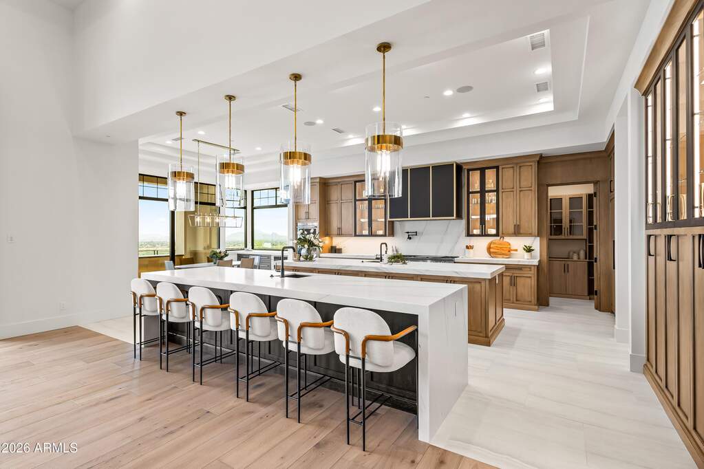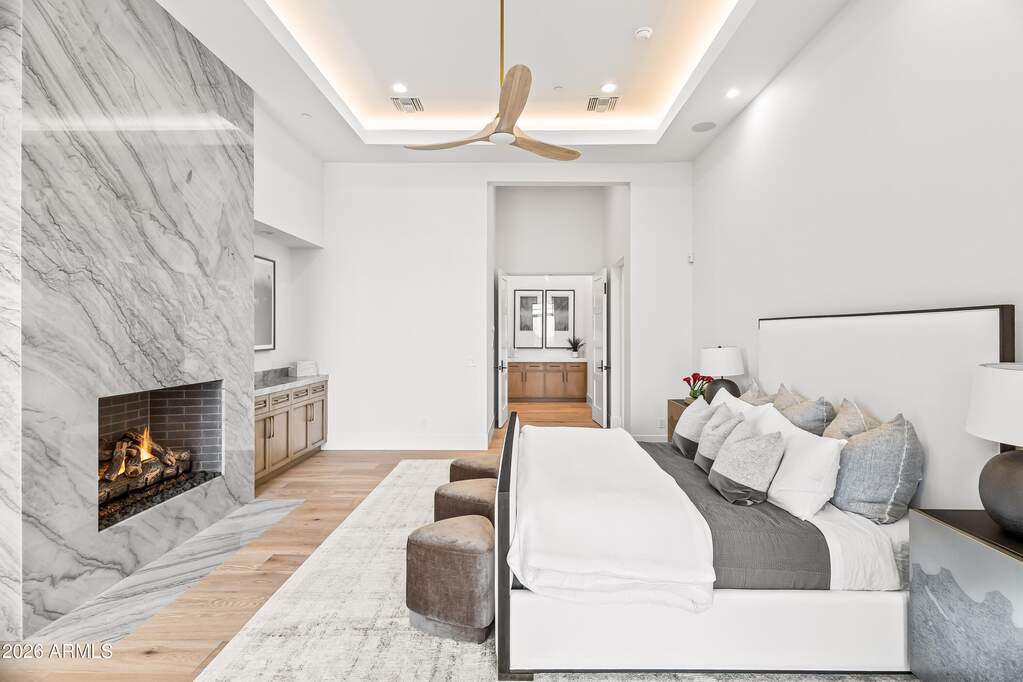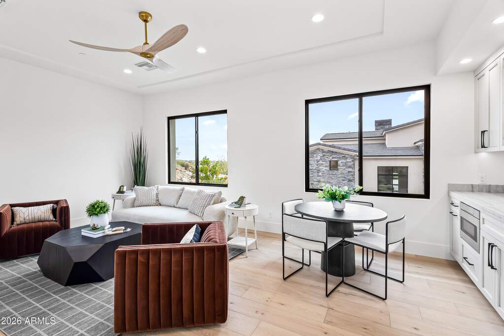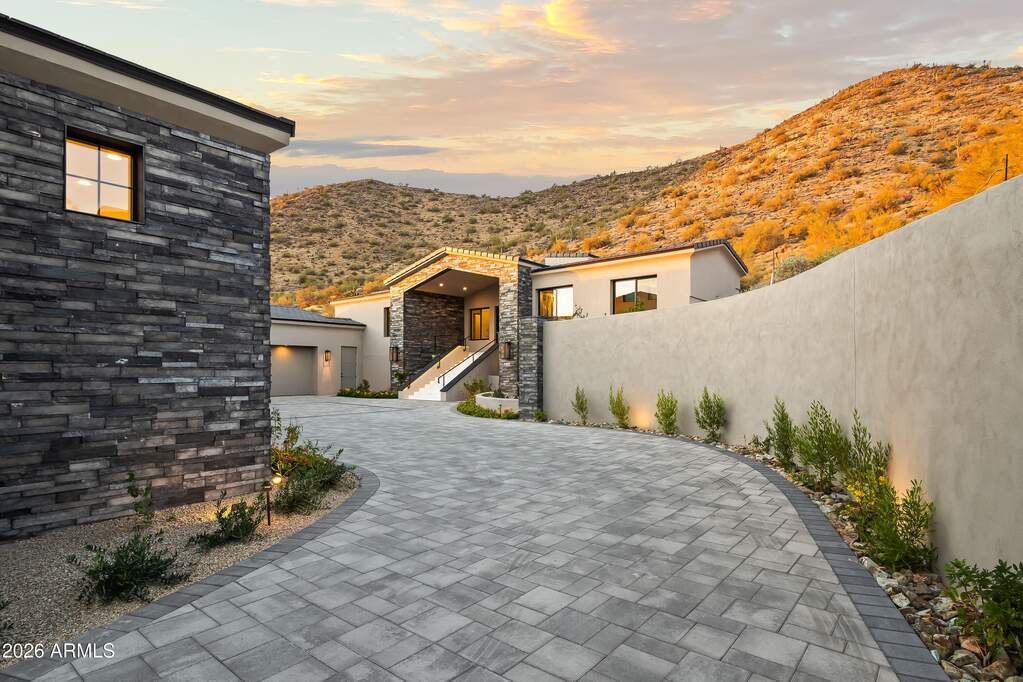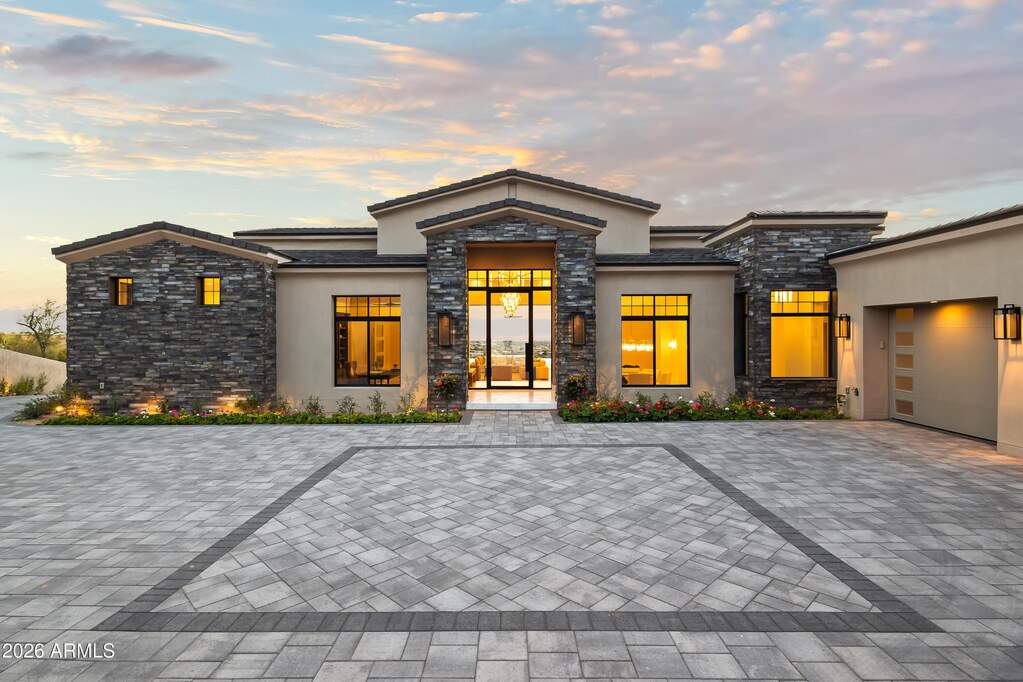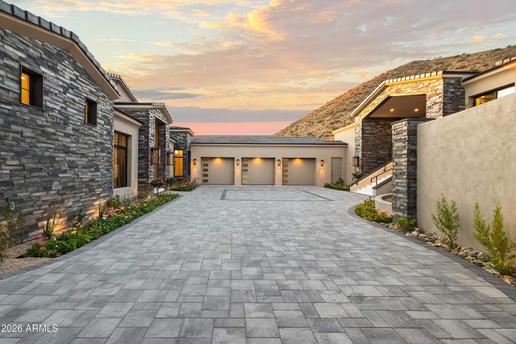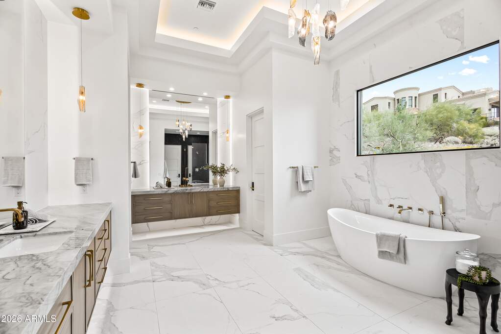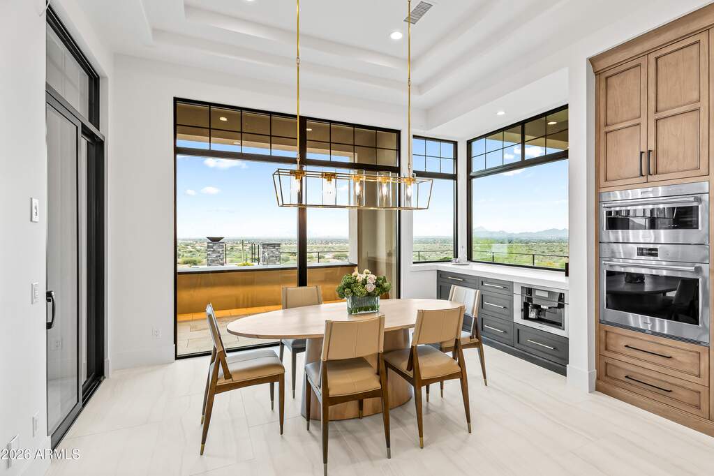Perched high above Ancala Country Club, this south-facing architectural masterpiece captures sweeping panoramic views of the city skyline, Camelback Mountain, and the surrounding Sonoran Desert. Privately situated within one of North Scottsdale's premier gated communities, this modern transitional estate blends refined design with resort-style living. Set on approximately 1.55 acres, this expansive single-level new build offers 4 ensuite bedrooms and 6 bathrooms in the main residence, along with a detached 1-bedroom, 1-bath guest casita complete with kitchenette and living area. A grand entry leads to soaring ceilings and an open-concept great room featuring a wall of sliding glass doors, floor-to-ceiling gas fireplace, white oak flooring, wood-paneled ceiling, and designer lighting. The chef's kitchen is designed for both entertaining and everyday living, offering dual islands, custom floor-to-ceiling cabinetry, walk-in pantry, formal dining room, breakfast nook, and additional eat-in seating. The primary suite enjoys stunning city-light views and includes a private sitting area, direct patio access, and an integrated exercise room. The spa-inspired bath features dual vanities, freestanding soaking tub, oversized walk-in shower, private water closet, and custom walk-in closet. Designed for seamless indoor-outdoor living, the backyard showcases a negative-edge pool, raised spa with dual fire features, dramatic double-sided fireplace, and an expansive bar and BBQ pavilion with two-sided counter seatingall set against breathtaking desert and city vistas. Additional highlights include a private office with custom built-ins, game room with full bar and wine display, and a 4-car garage. Conveniently located near fine dining, upscale shopping, Mayo Clinic, luxury resorts and spas, and abundant recreation, the community backs to Mount Taliesin and the McDowell Sonoran Preserve, offering privacy and natural beauty. Ancala Country Club memberships are available separately and include access to golf, clubhouse amenities, heated pool, tennis courts, locker rooms, and dining.