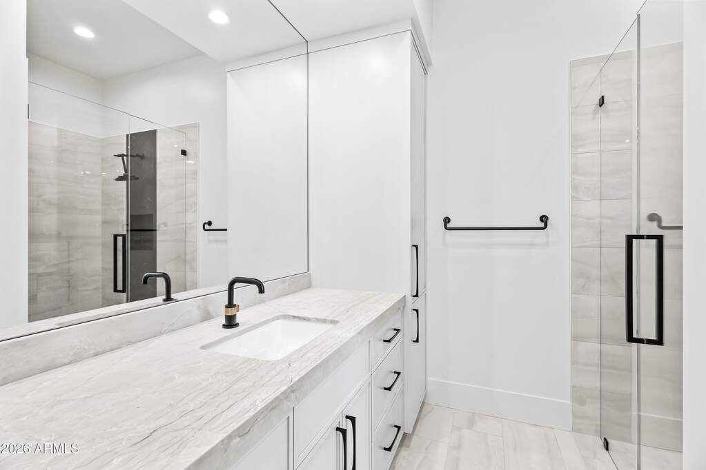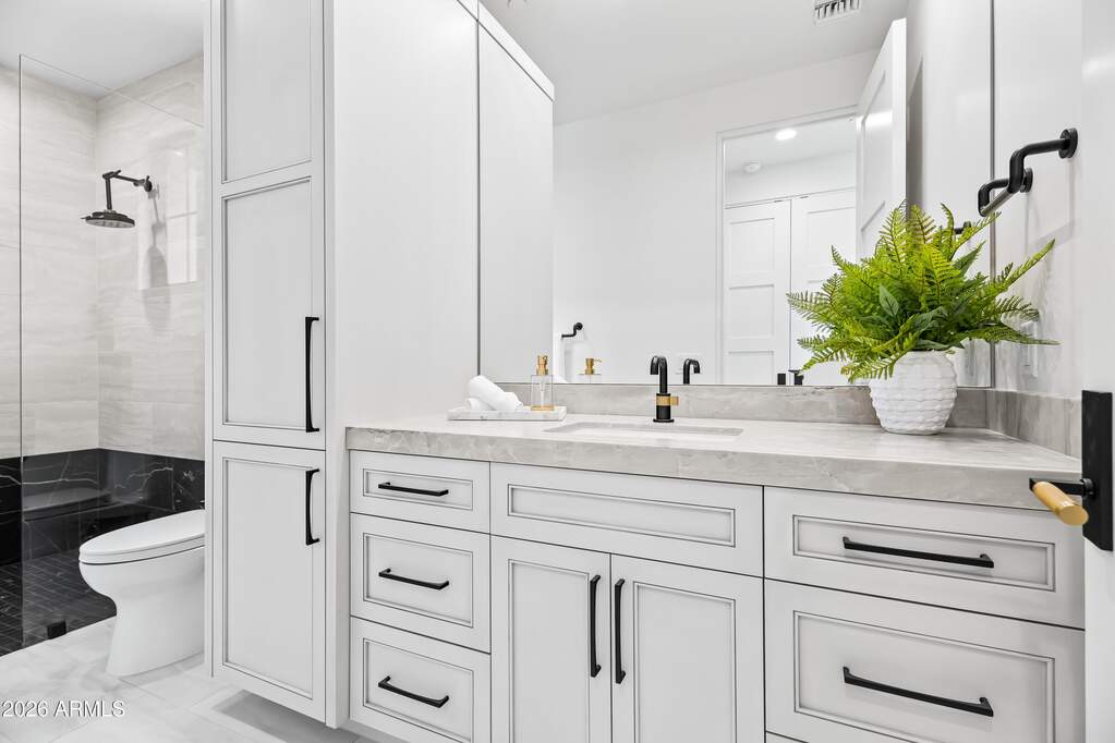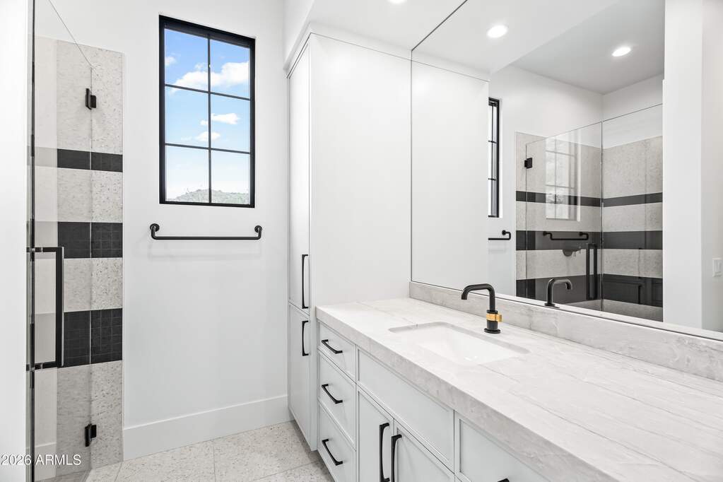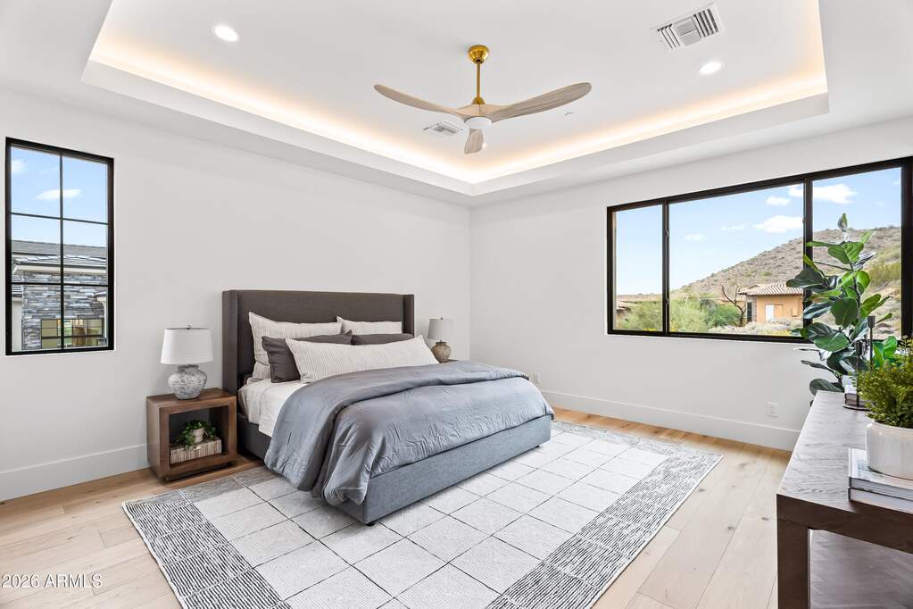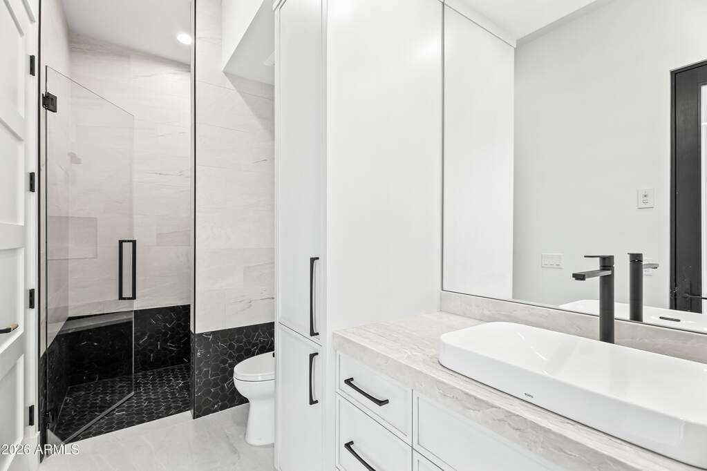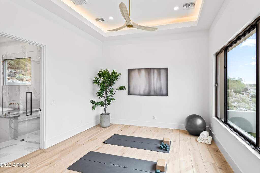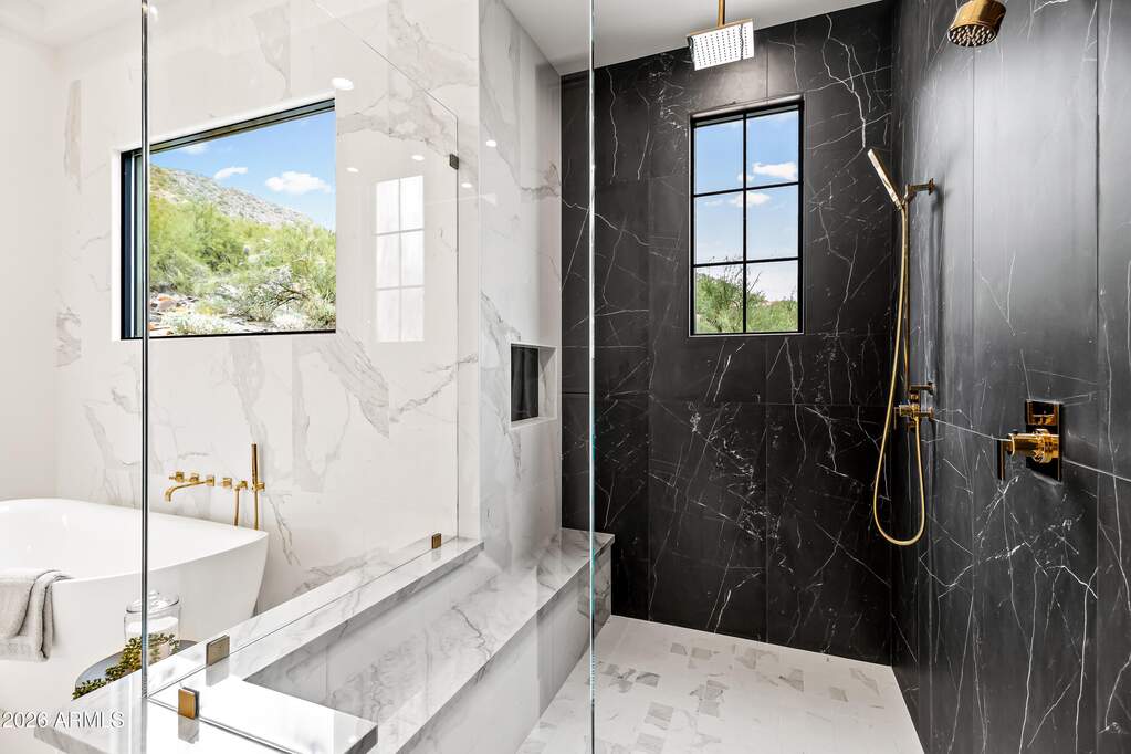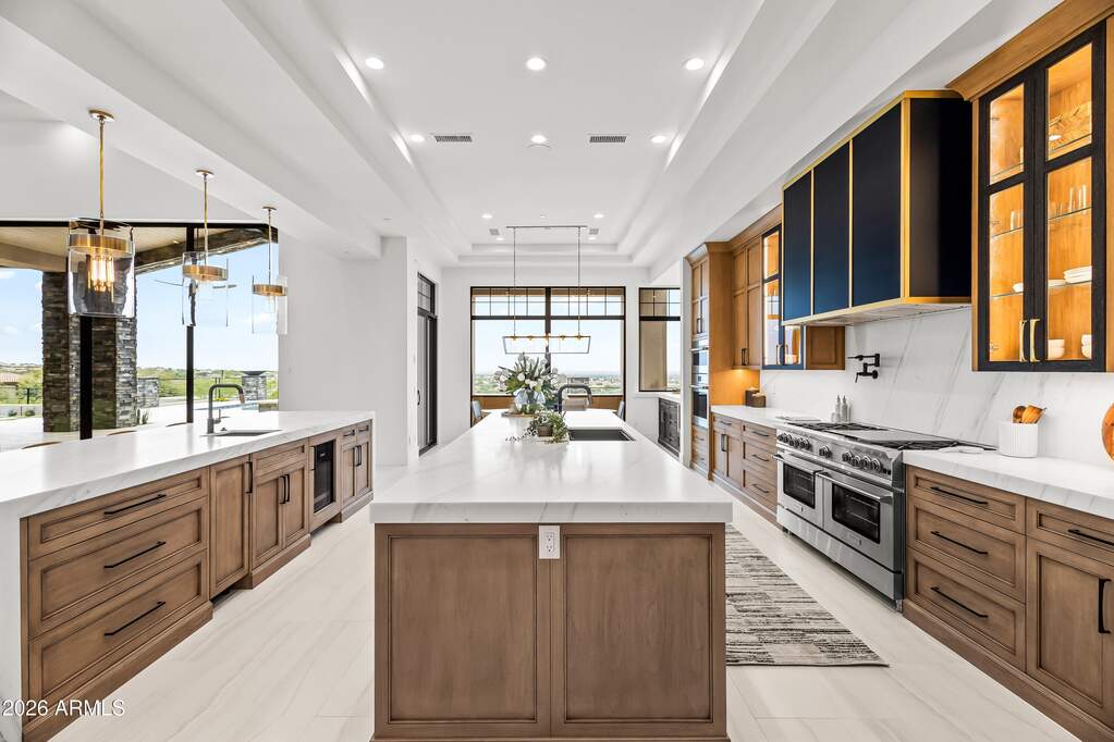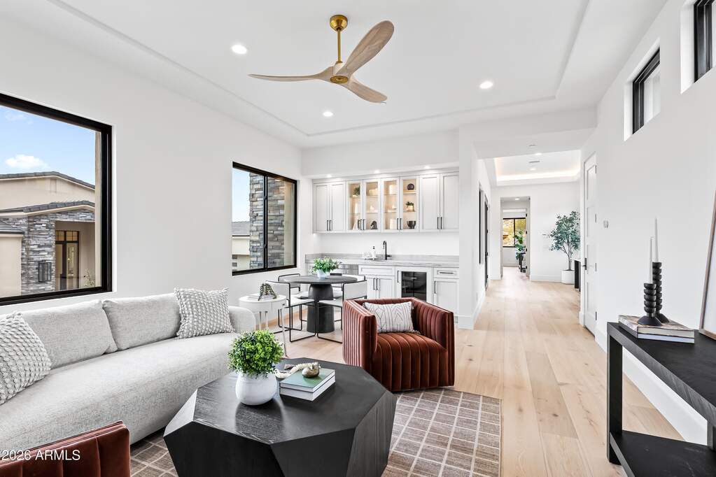 Perched high above Ancala Country Club, this south-facing architectural masterpiece captures sweeping panoramic views of the city skyline, Camelback Mountain, and the surrounding Sonoran Desert. Privately situated within one of North Scottsdale's premier gated communities, this modern transitional estate blends refined design with resort-style living. Set on approximately 1.55 acres, this expansive single-level new build offers 4 ensuite bedrooms and 6 bathrooms in the main residence, along with a detached 1-bedroom, 1-bath guest casita complete with kitchenette and living area. A grand entry leads to soaring ceilings and an open-concept great room featuring a wall of sliding glass doors, floor-to-ceiling gas fireplace, white oak flooring, wood-paneled ceiling, and designer lighting. The chef's kitchen is designed for both entertaining and everyday living, offering dual islands, custom floor-to-ceiling cabinetry, walk-in pantry, formal dining room, breakfast nook, and additional eat-in seating. The primary suite enjoys stunning city-light views and includes a private sitting area, direct patio access, and an integrated exercise room. The spa-inspired bath features dual vanities, freestanding soaking tub, oversized walk-in shower, private water closet, and custom walk-in closet. Designed for seamless indoor-outdoor living, the backyard showcases a negative-edge pool, raised spa with dual fire features, dramatic double-sided fireplace, and an expansive bar and BBQ pavilion with two-sided counter seatingall set against breathtaking desert and city vistas. Additional highlights include a private office with custom built-ins, game room with full bar and wine display, and a 4-car garage. Conveniently located near fine dining, upscale shopping, Mayo Clinic, luxury resorts and spas, and abundant recreation, the community backs to Mount Taliesin and the McDowell Sonoran Preserve, offering privacy and natural beauty. Ancala Country Club memberships are available separately and include access to golf, clubhouse amenities, heated pool, tennis courts, locker rooms, and dining.