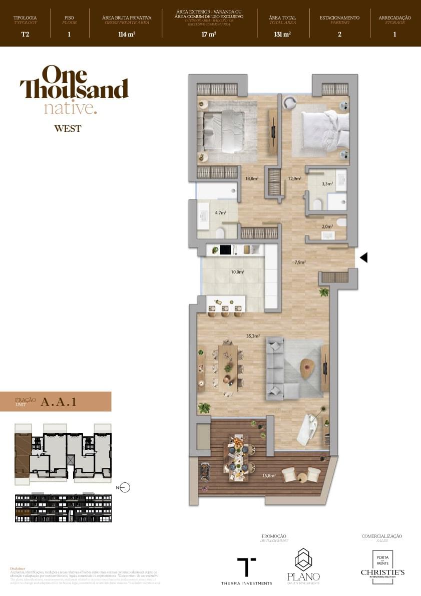 At the prestigious One Thousand Native, located in the heart of Belas Clube de Campo, this elevated-floor two-bedroom apartment in the WEST block offers 114 sqm of private gross area and a magnificent 17 sqm balcony. Designed for those seeking elegance, comfort, and an exclusive lifestyle.