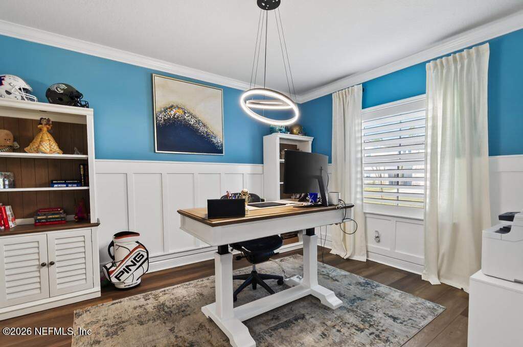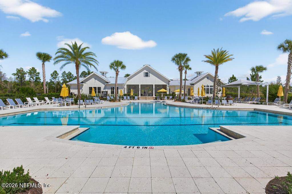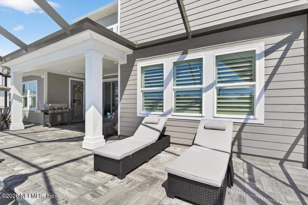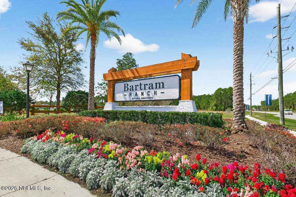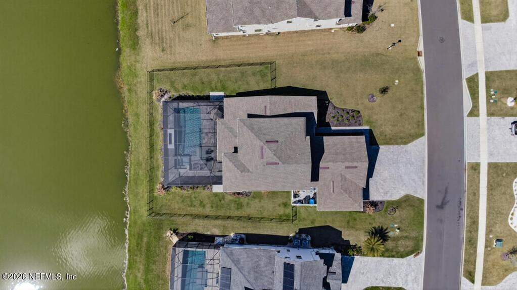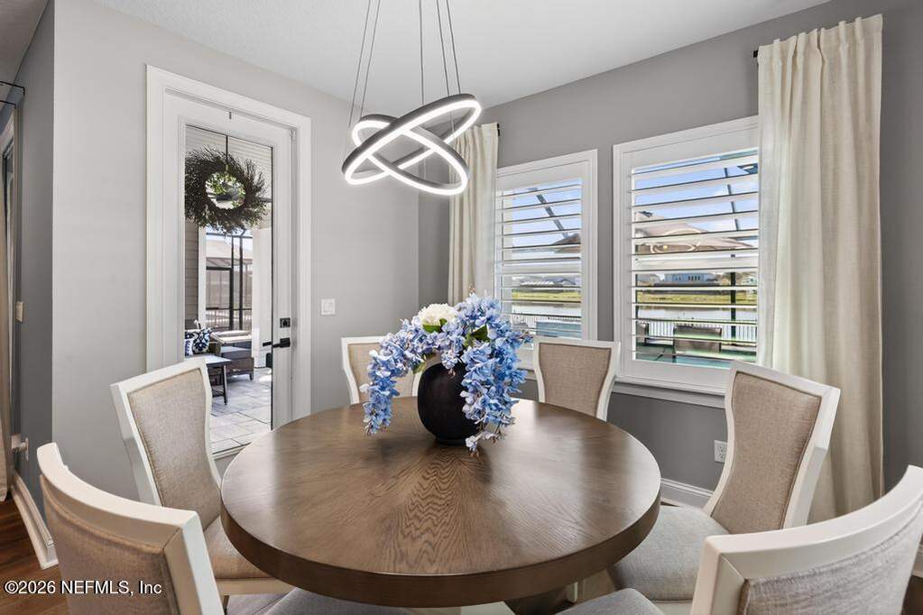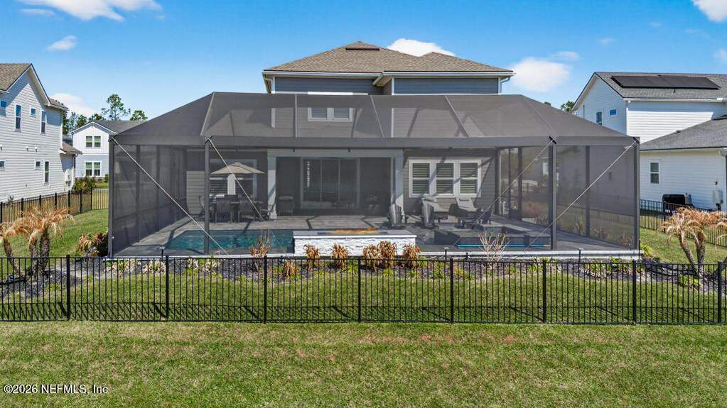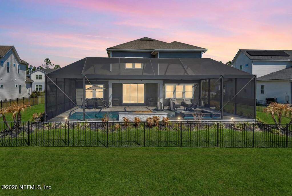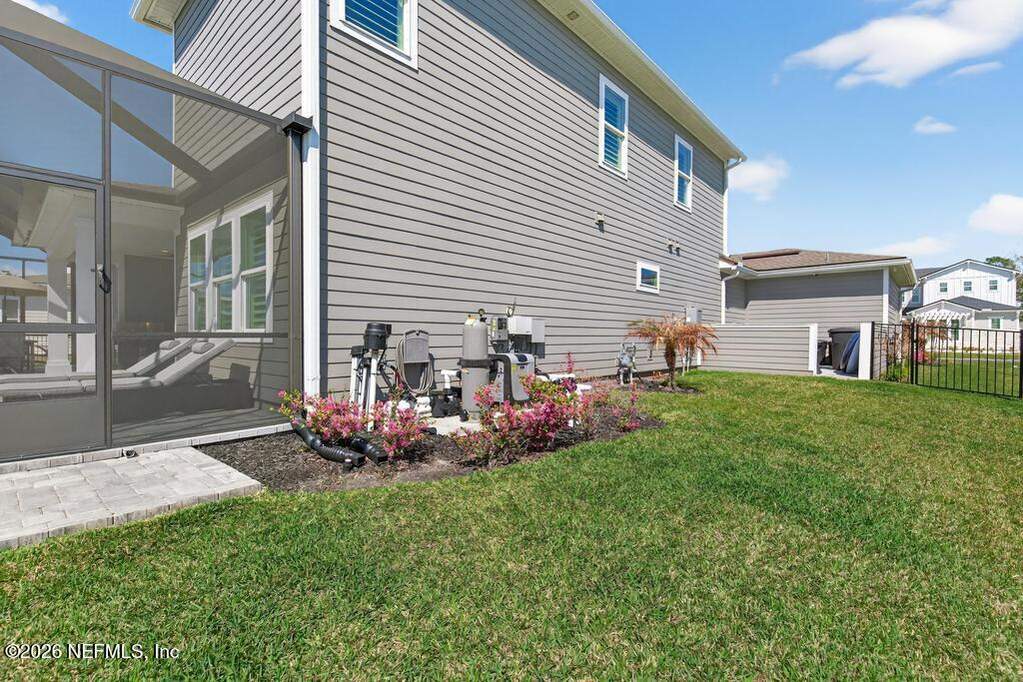 Built in 2023 by Toll Brothers in Bartram Ranch, this upgraded 2,893 sq ft home offers 4 bedrooms and 3.5 baths with refined design and luxury touches. The backyard is a showpiece with water views, custom saltwater pool and spa, built-in firepit, and expansive screened enclosure with 1,026 sq ft of sealed pavers for entertaining. Interior upgrades include LVP flooring, plantation shutters, designer lighting, wood feature walls, wainscoting, private office with frameless glass doors, and built-in closet systems. Kitchen features Whirlpool stainless appliances, gas cooktop, pull-out cabinetry, backsplash, and under/over cabinet lighting. Patio is gas-plumbed for a future outdoor kitchen. Amenities include pool, fitness center, dog park and recreation center.