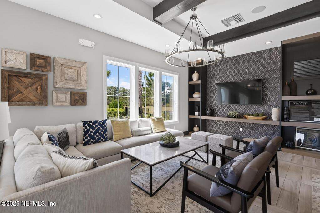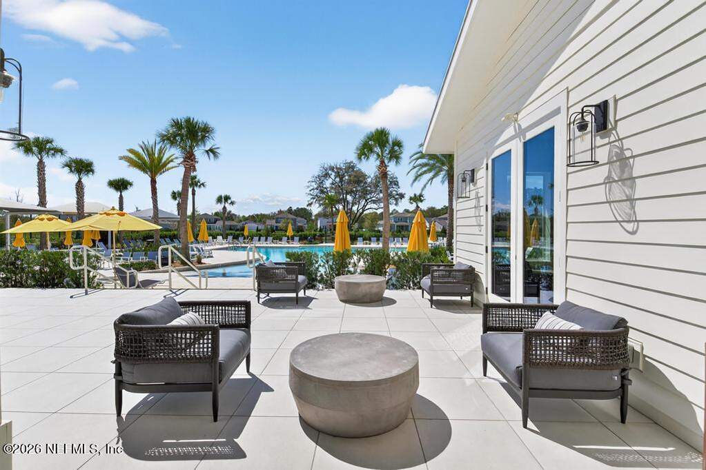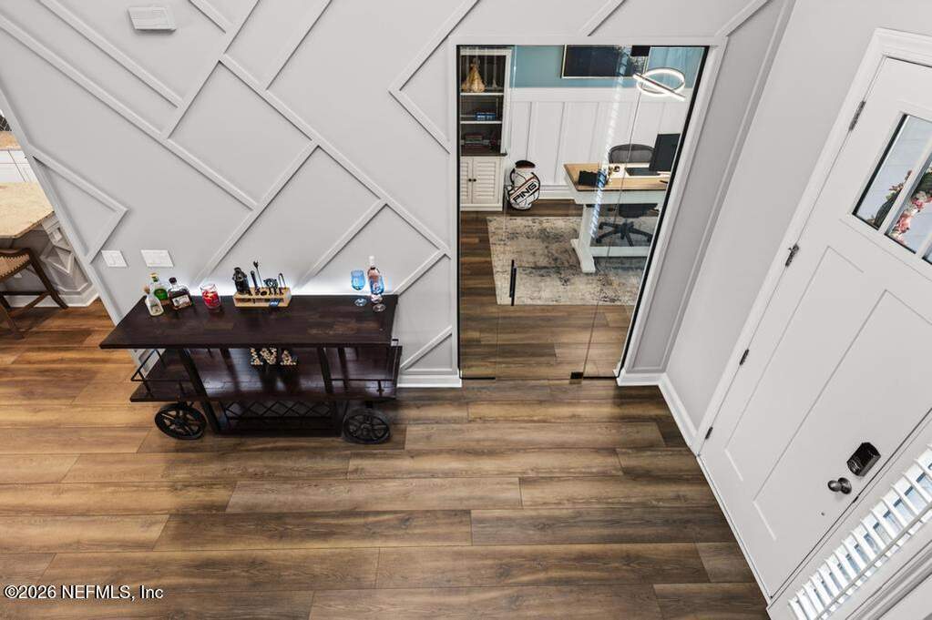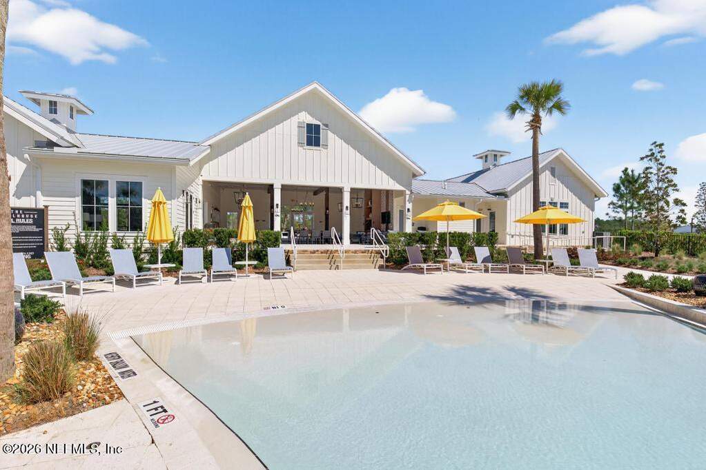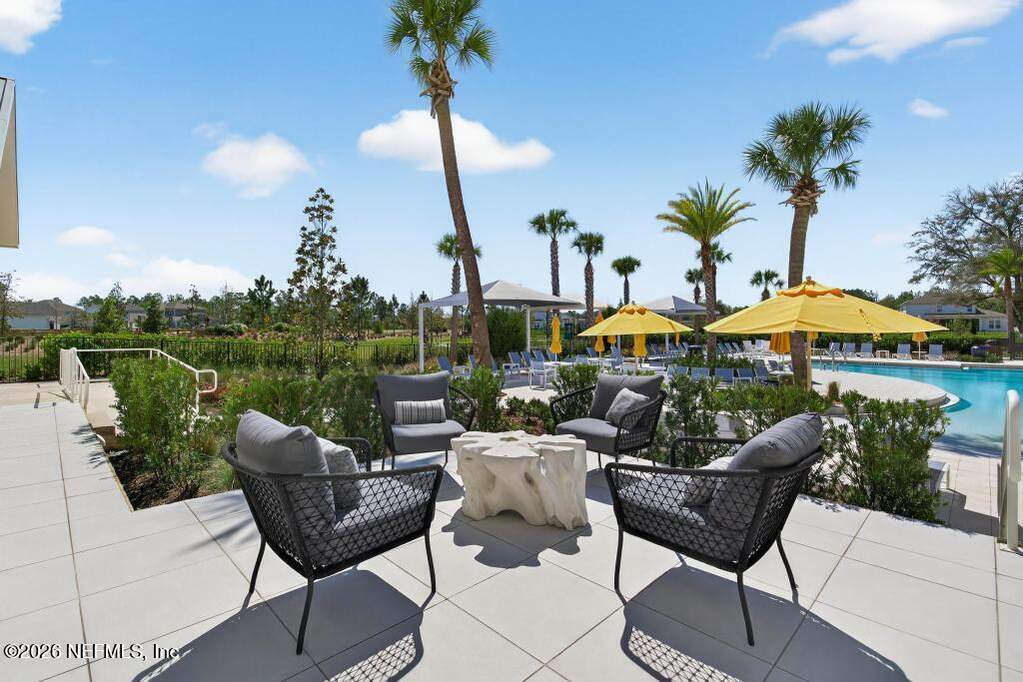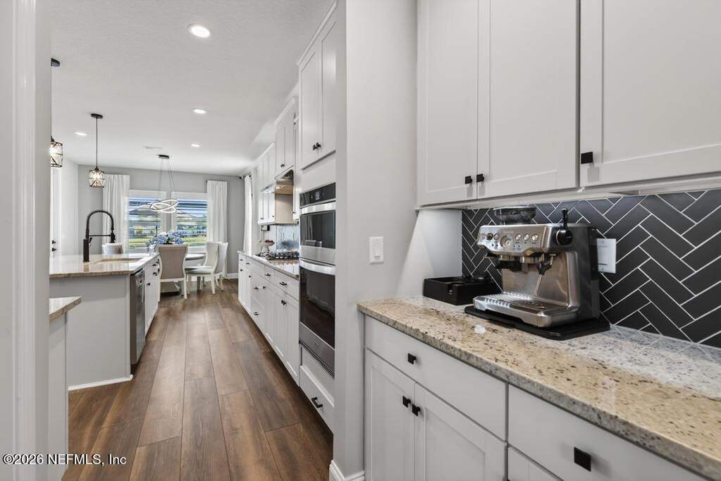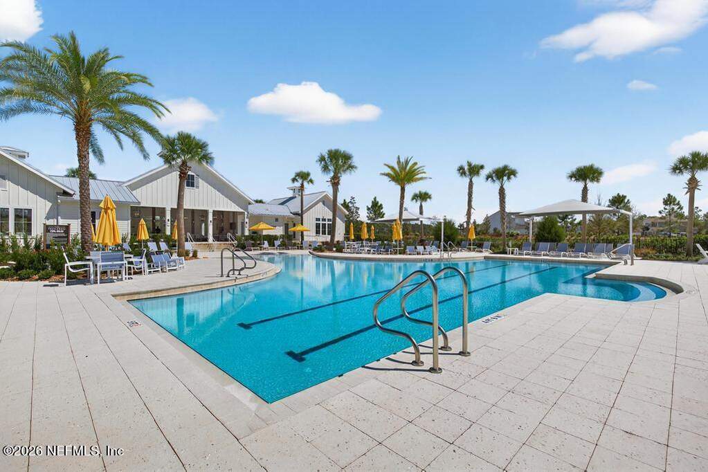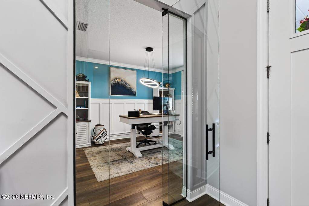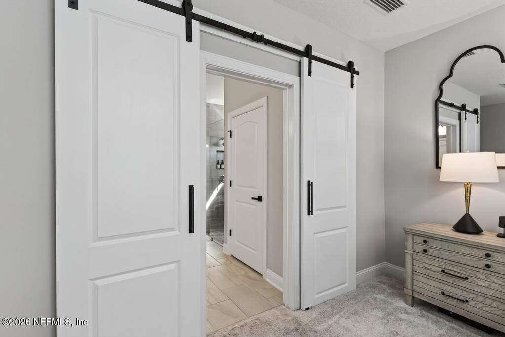 Built in 2023 by Toll Brothers in Bartram Ranch, this upgraded 2,893 sq ft home offers 4 bedrooms and 3.5 baths with refined design and luxury touches. The backyard is a showpiece with water views, custom saltwater pool and spa, built-in firepit, and expansive screened enclosure with 1,026 sq ft of sealed pavers for entertaining. Interior upgrades include LVP flooring, plantation shutters, designer lighting, wood feature walls, wainscoting, private office with frameless glass doors, and built-in closet systems. Kitchen features Whirlpool stainless appliances, gas cooktop, pull-out cabinetry, backsplash, and under/over cabinet lighting. Patio is gas-plumbed for a future outdoor kitchen. Amenities include pool, fitness center, dog park and recreation center.